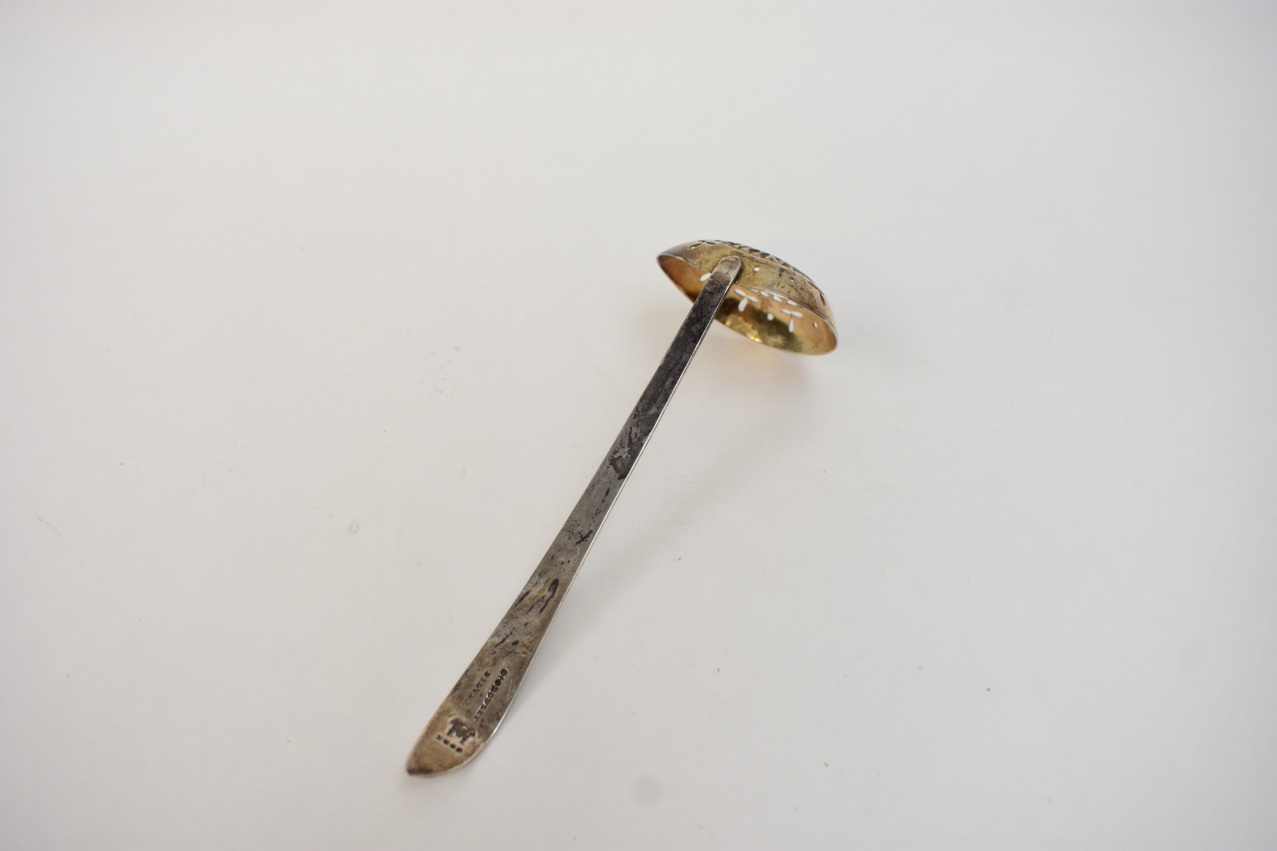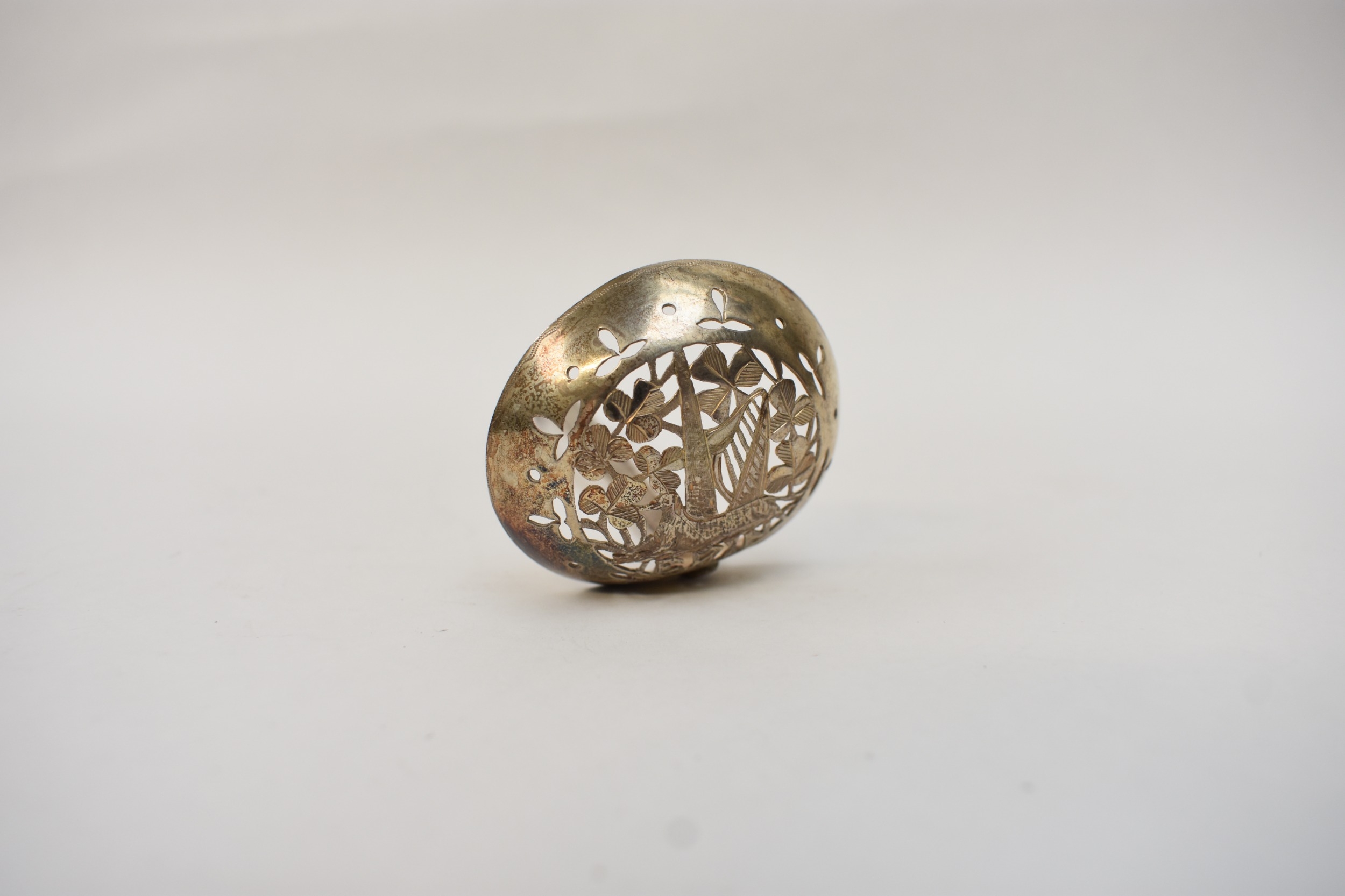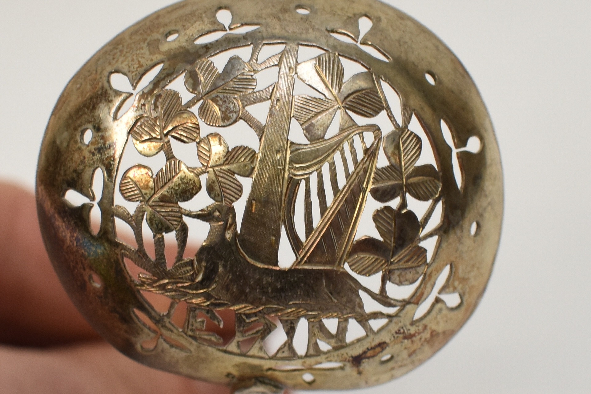 An Irish Provincial silver sifting spoon by O'Crowley, the bowl decorated with Harp, hound and foliage, 13cm long, 20g