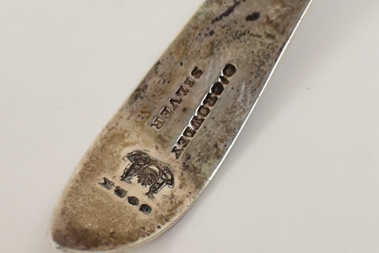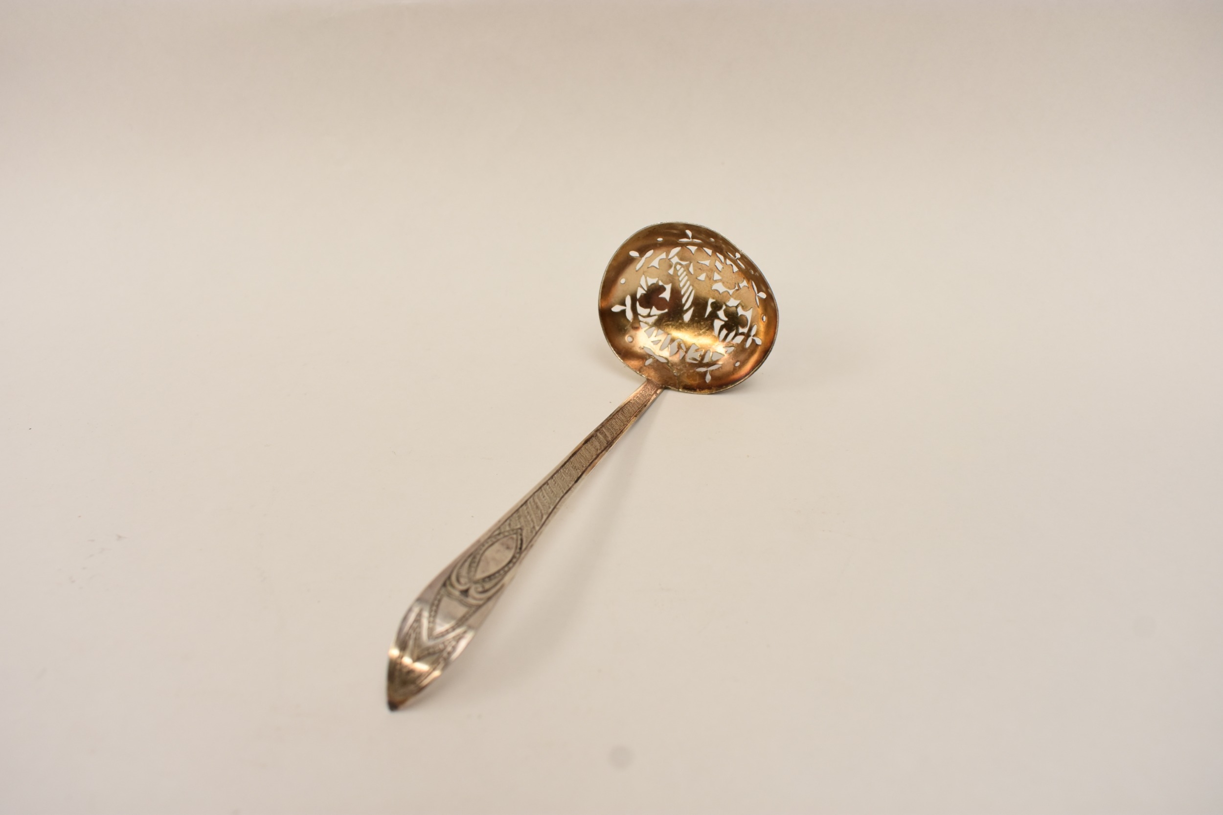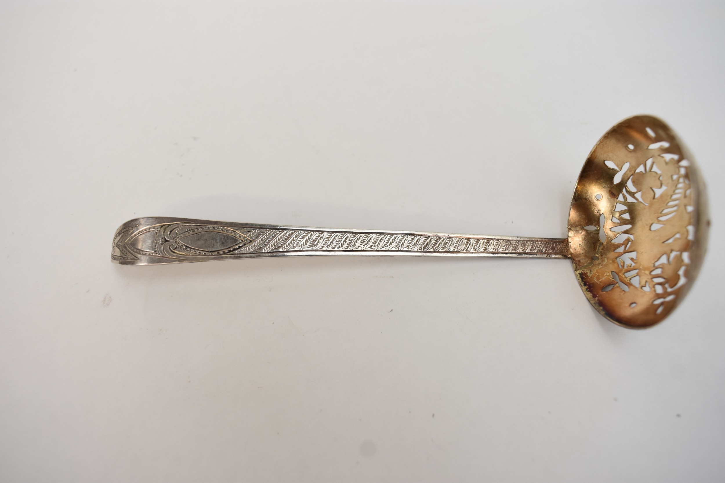 An Irish Provincial silver sifting spoon by O'Crowley, the bowl decorated with Harp, hound and foliage, 13cm long, 20g