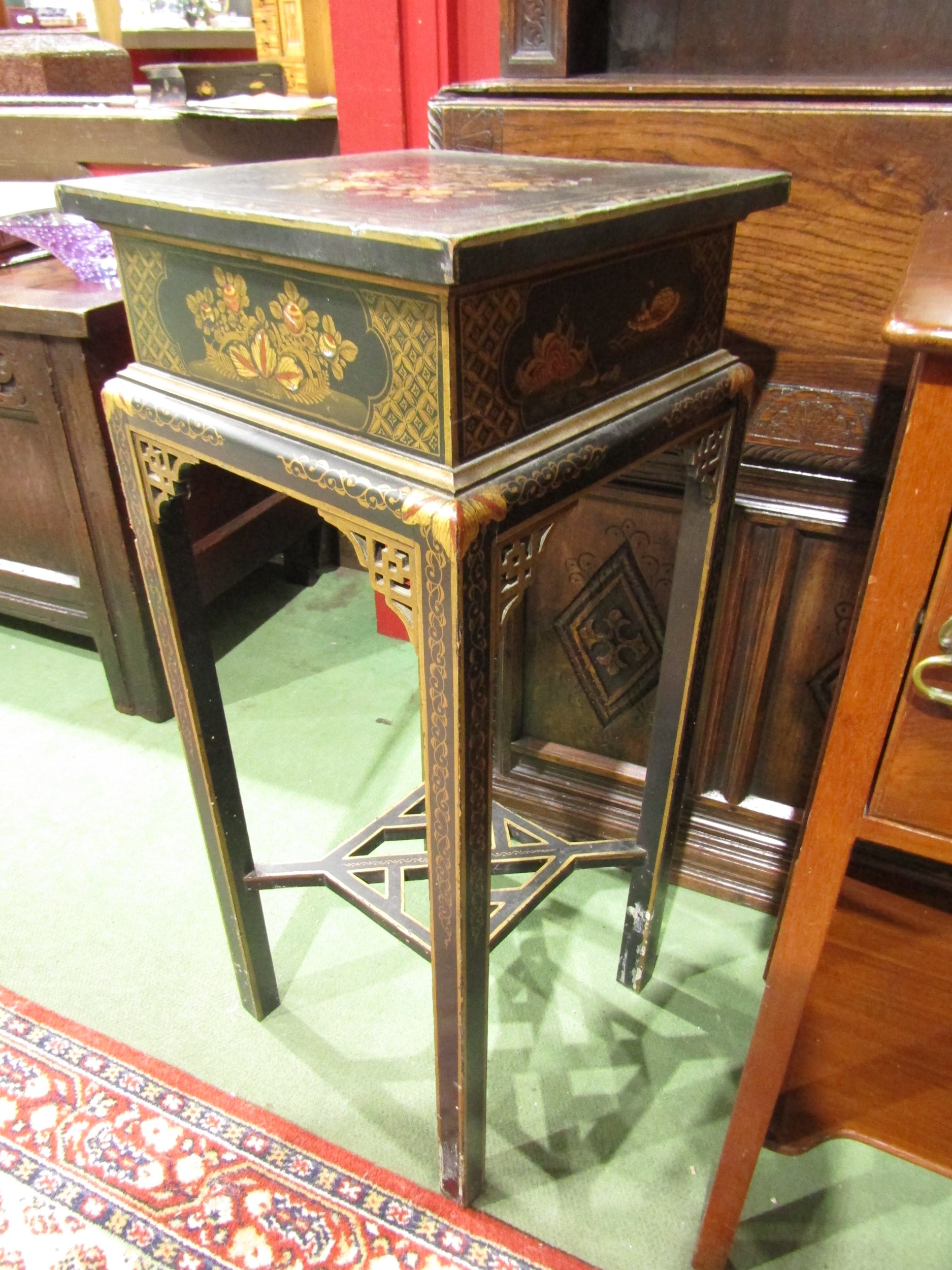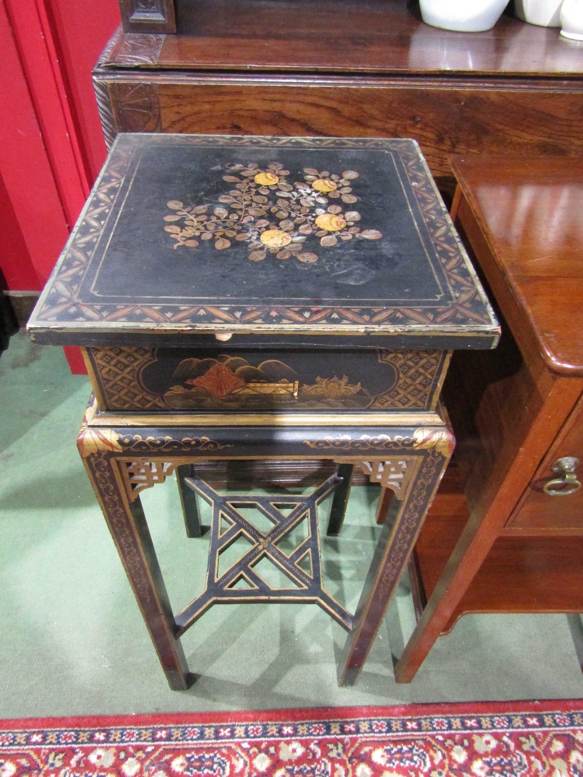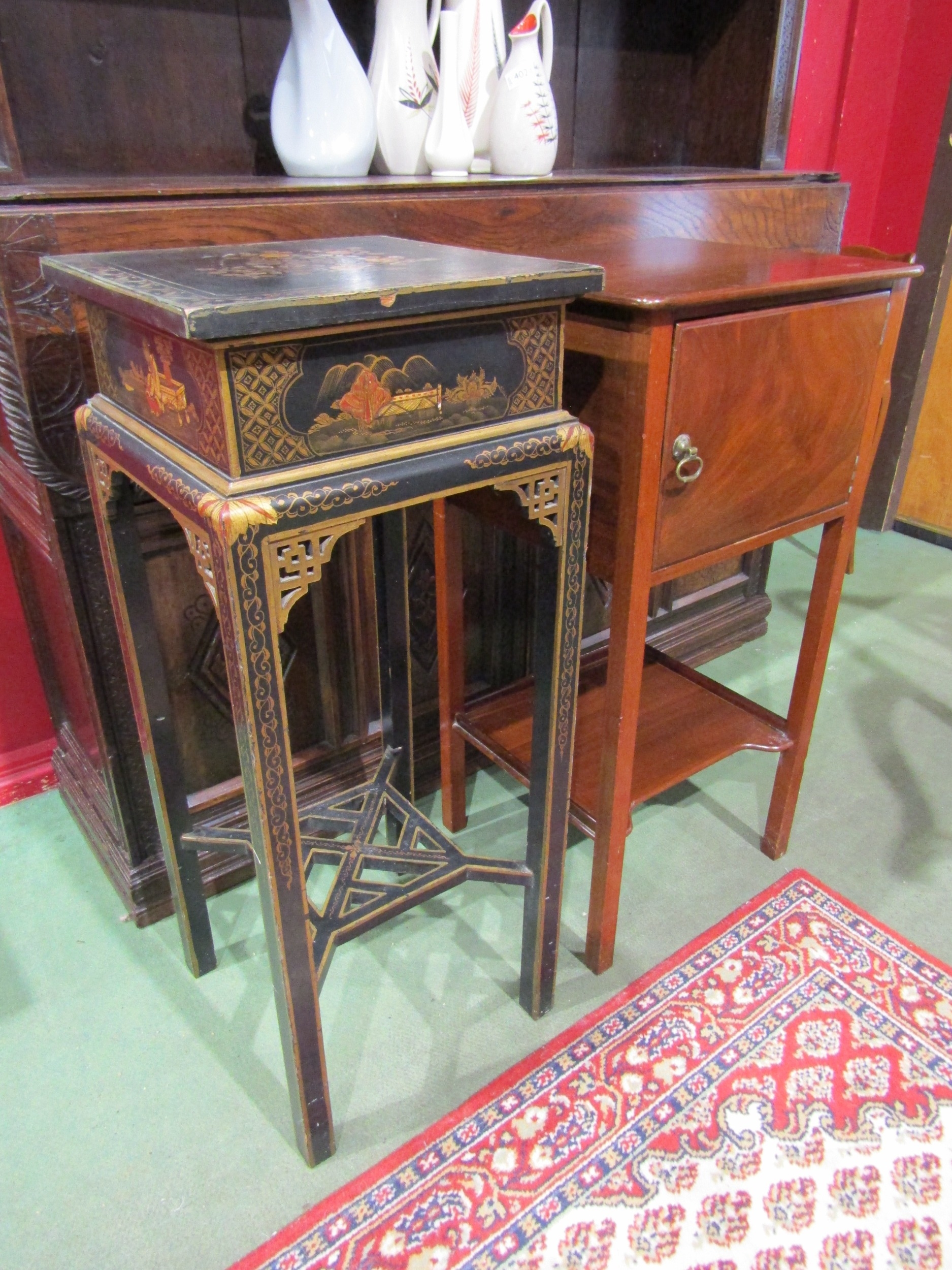 A mahogany pot cupboard and chinoiserie jardinière stand with gilt decoration (2)