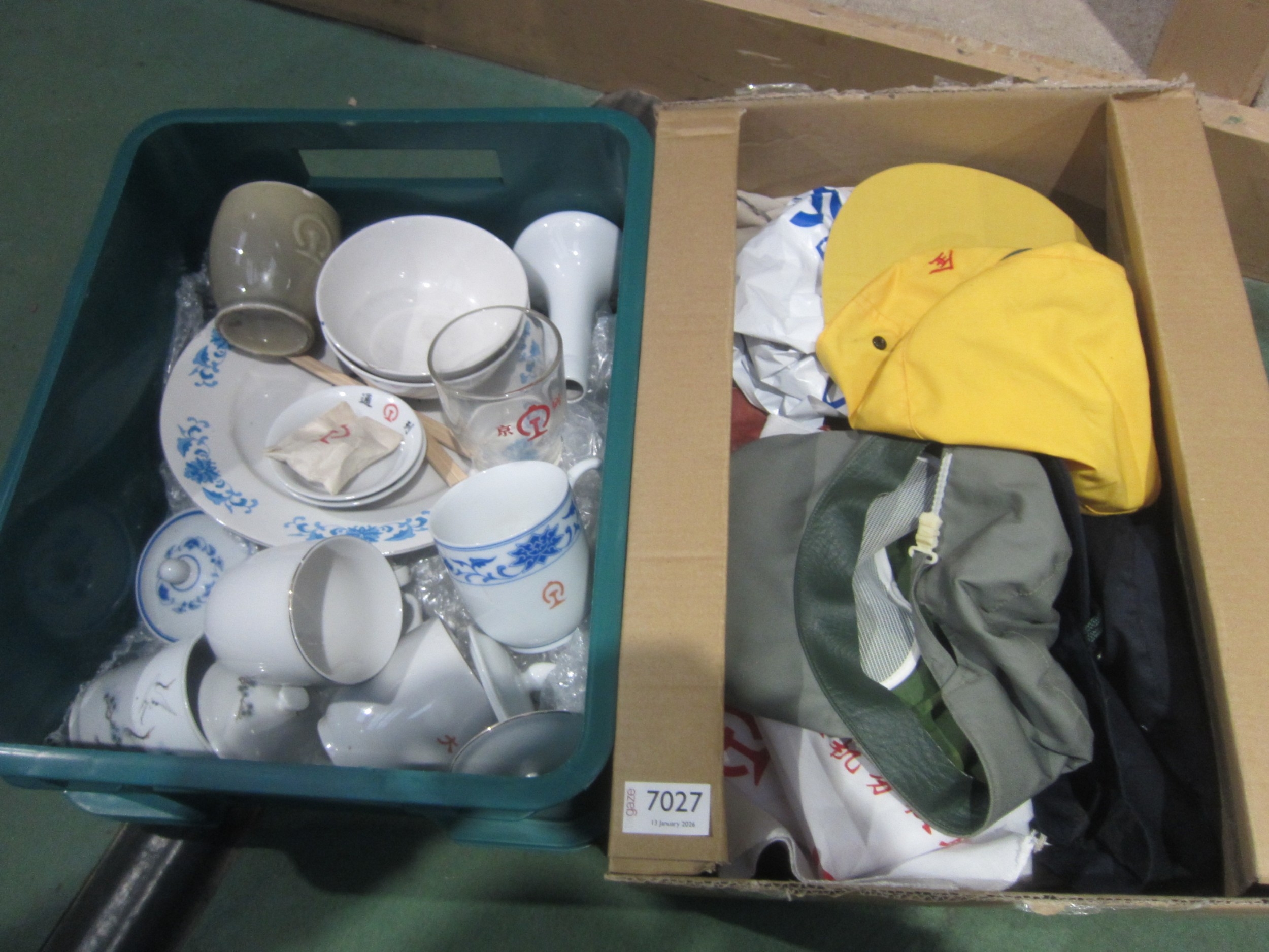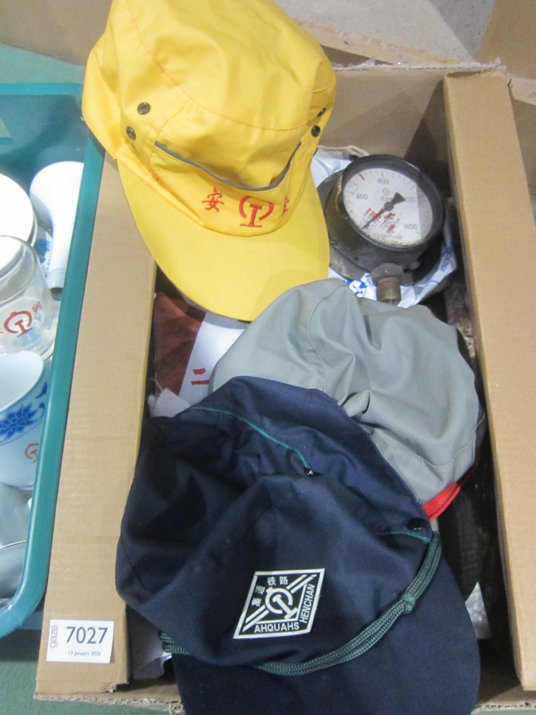 Two boxes containing various ephemera, uniform patches, crockery and others all relating to Chinese Railways
