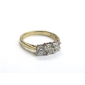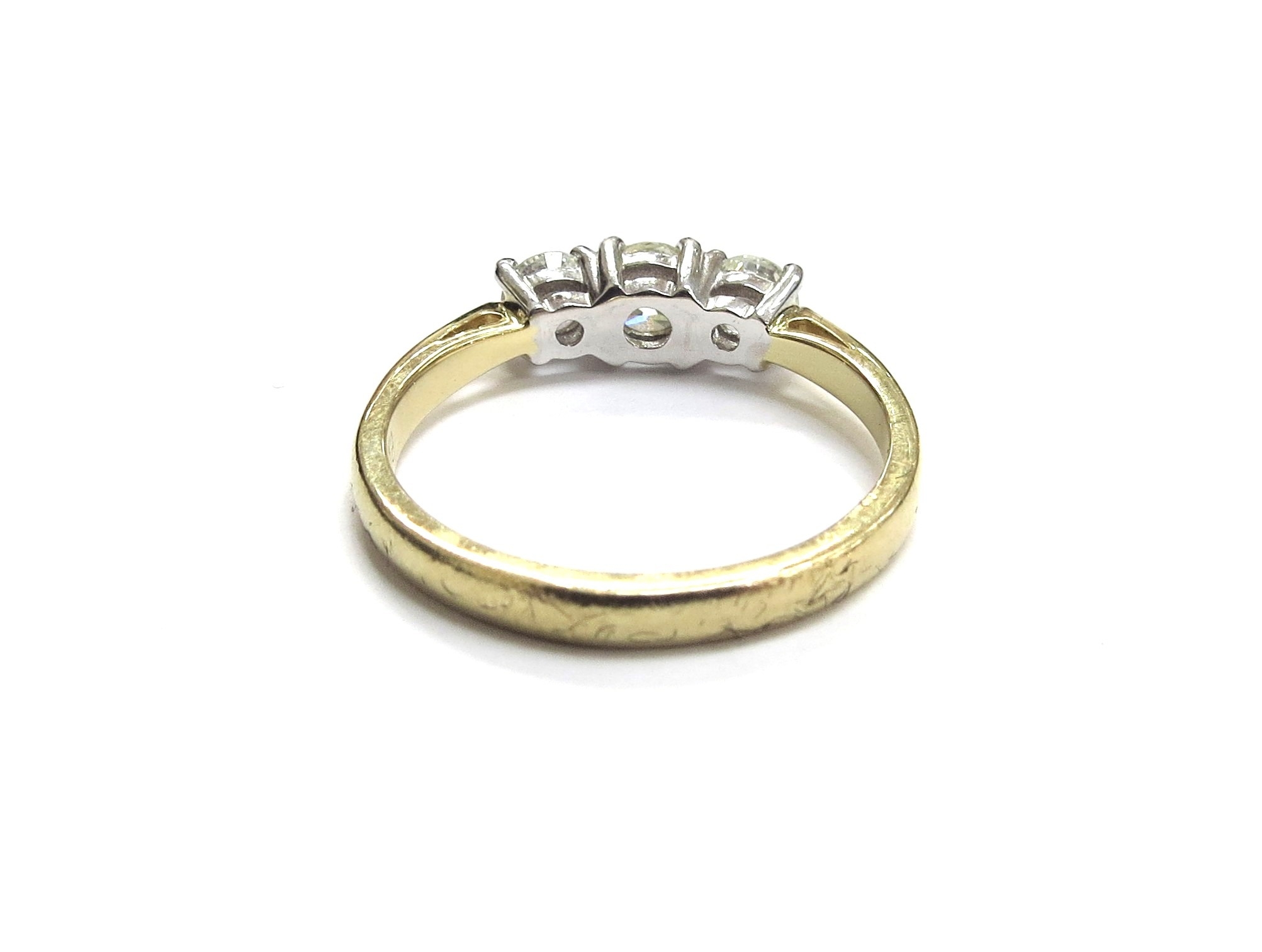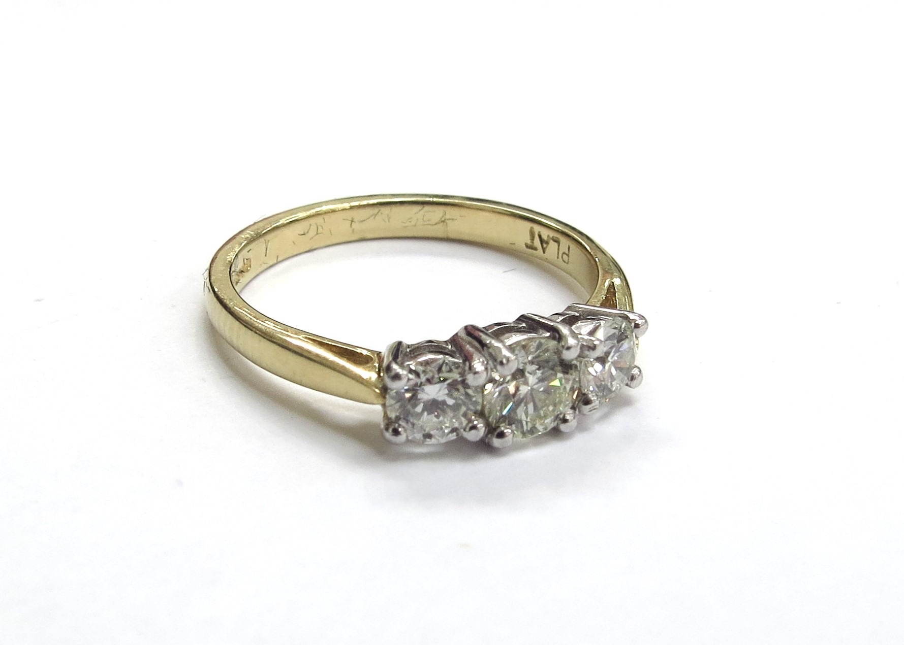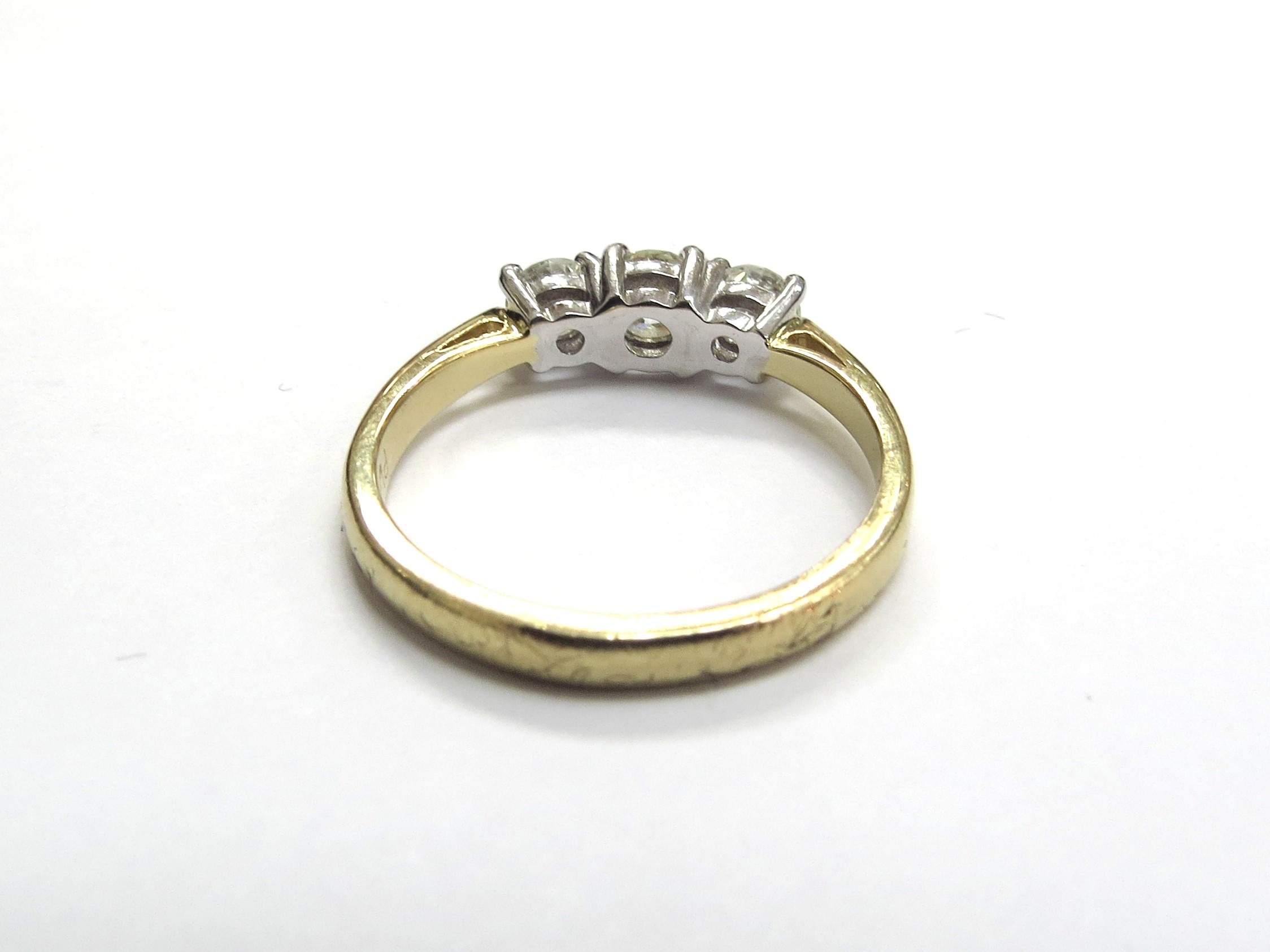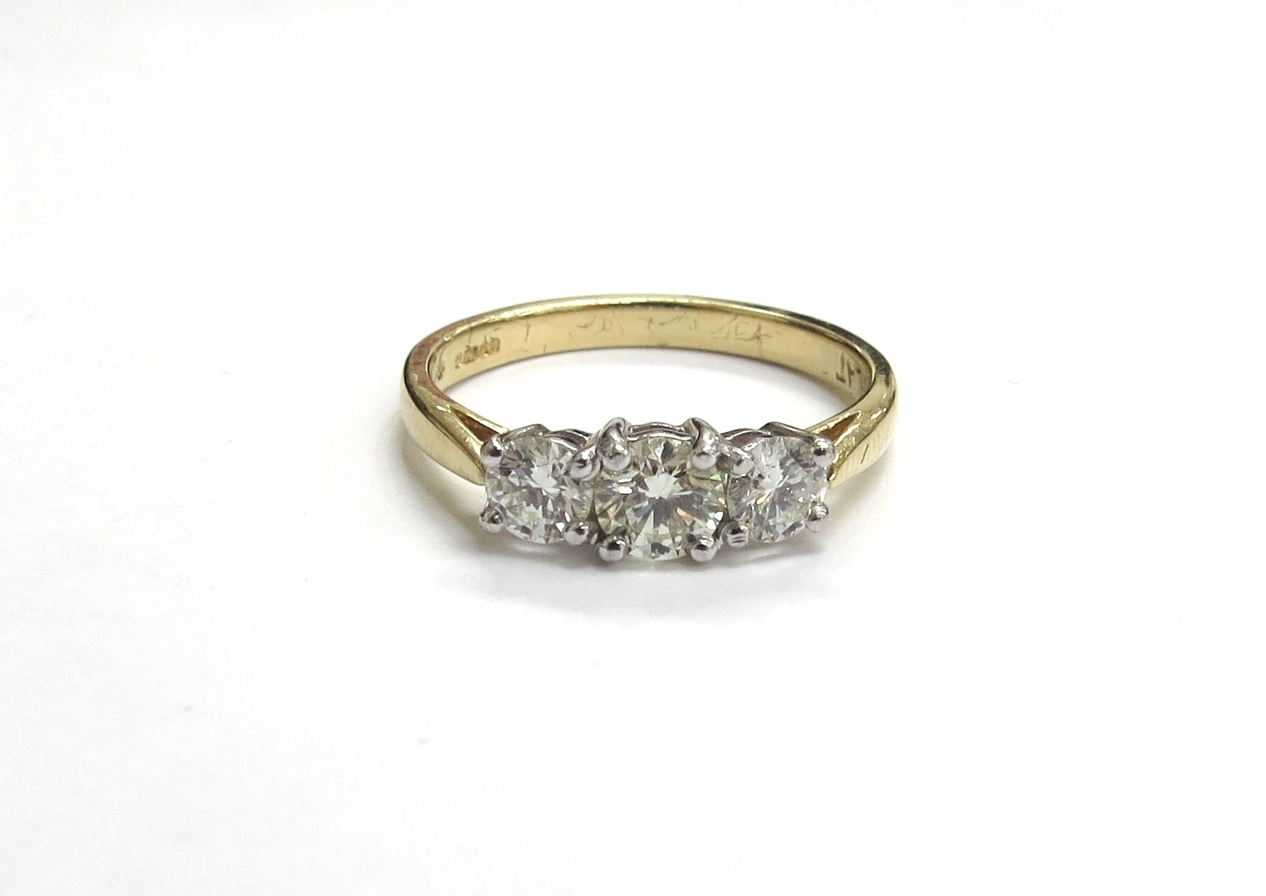 An 18ct gold three stone diamond ring, 0.83ct total, G/SI. Size 3.9g