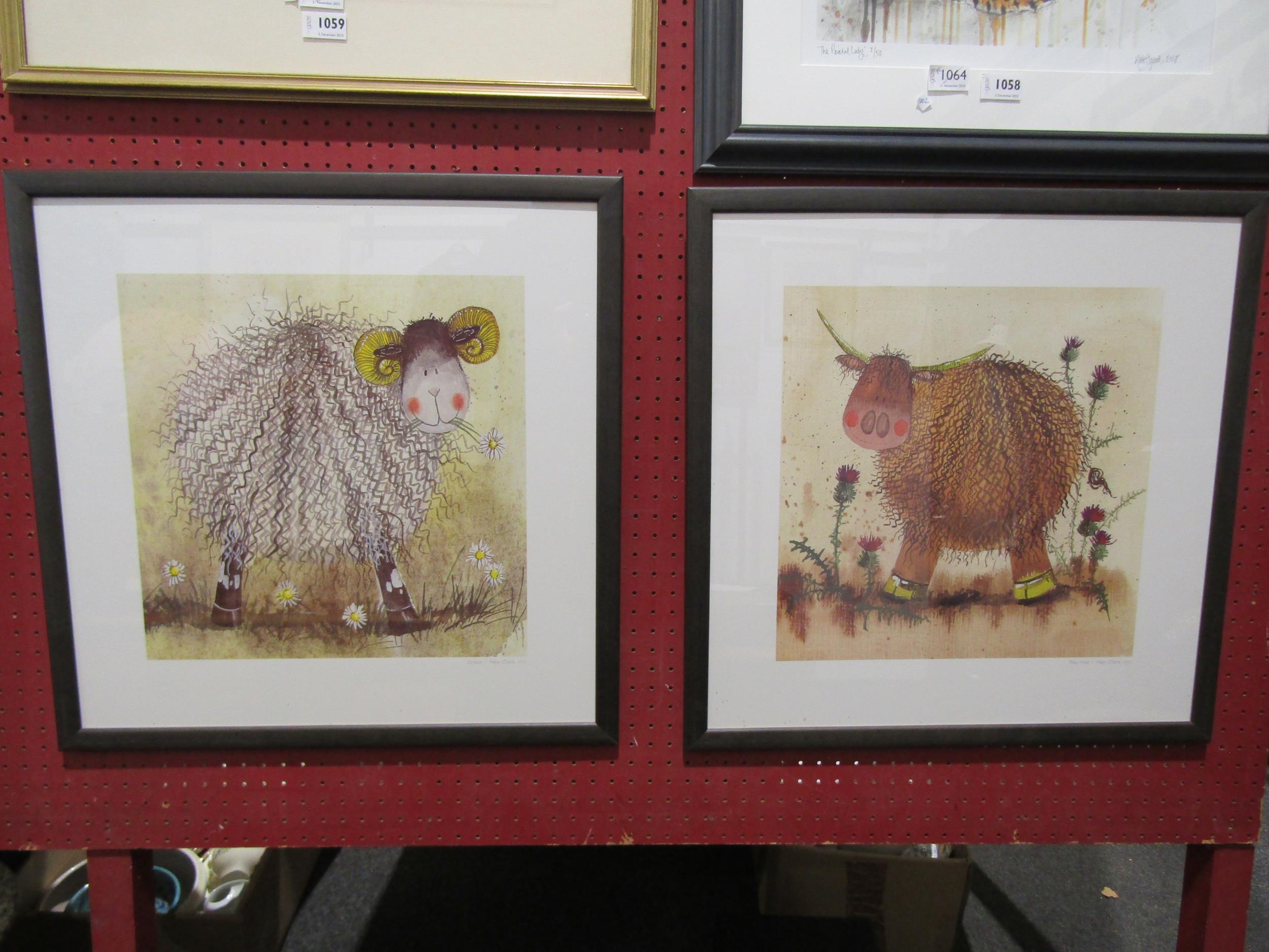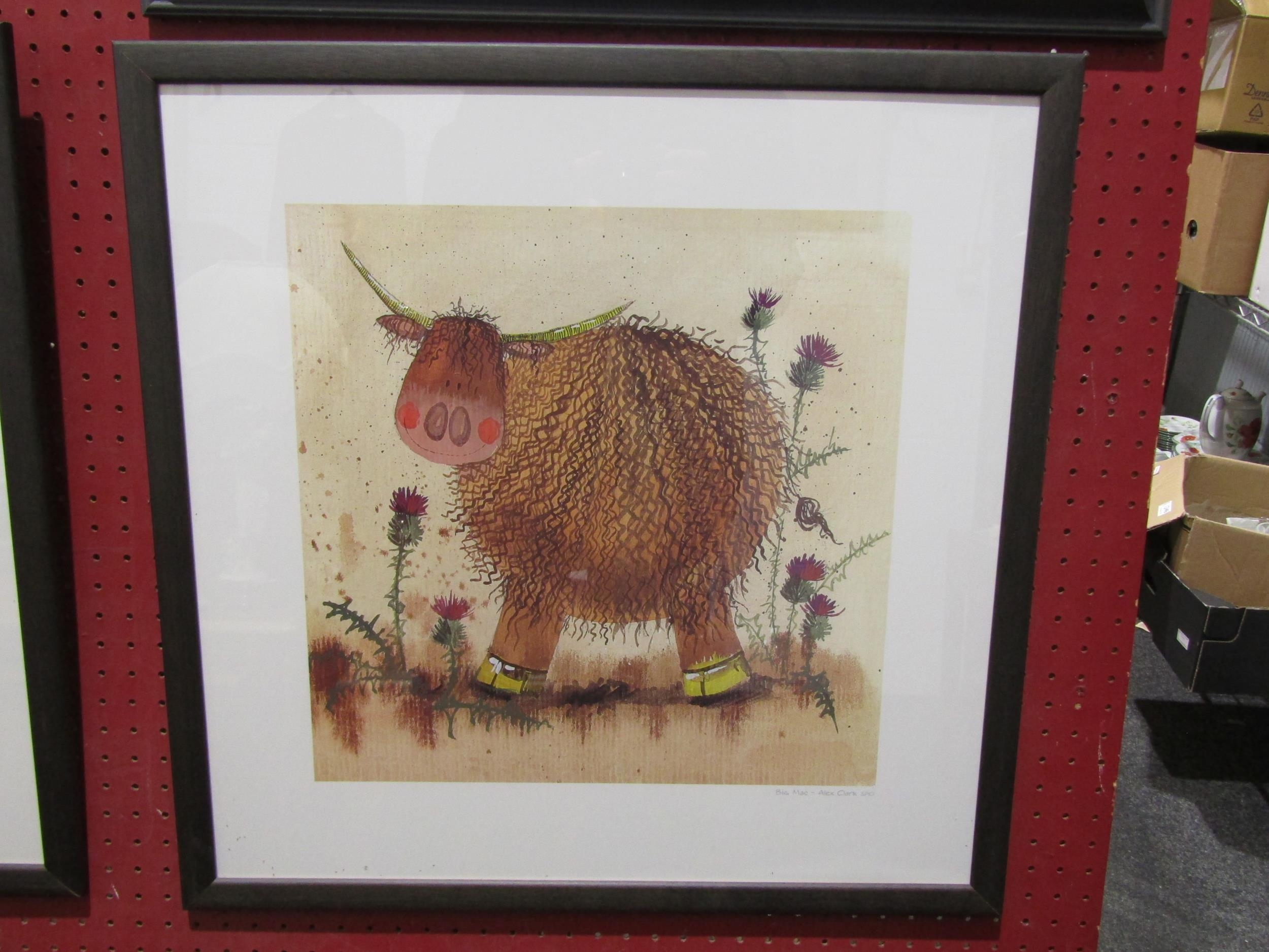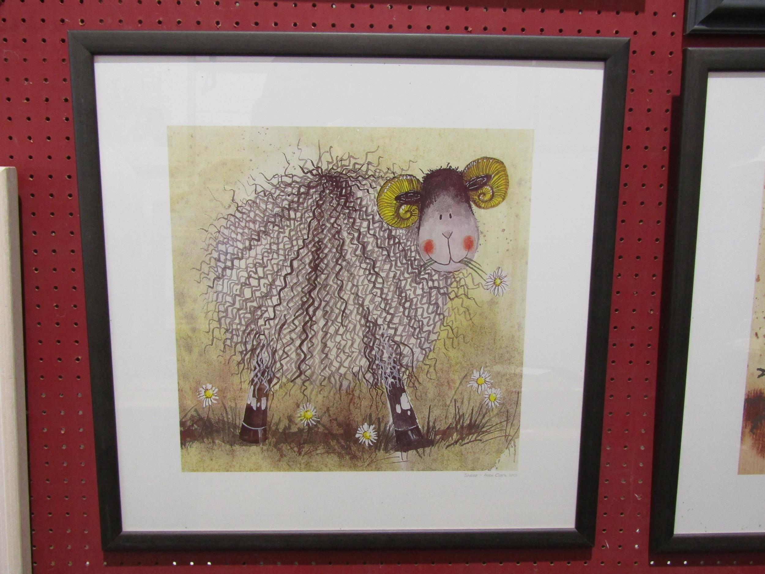 A pair of prints "Sheep" and "Big Mac", framed and glazed, pencil signed Alex Clark lower right. 36cm x 36cm