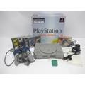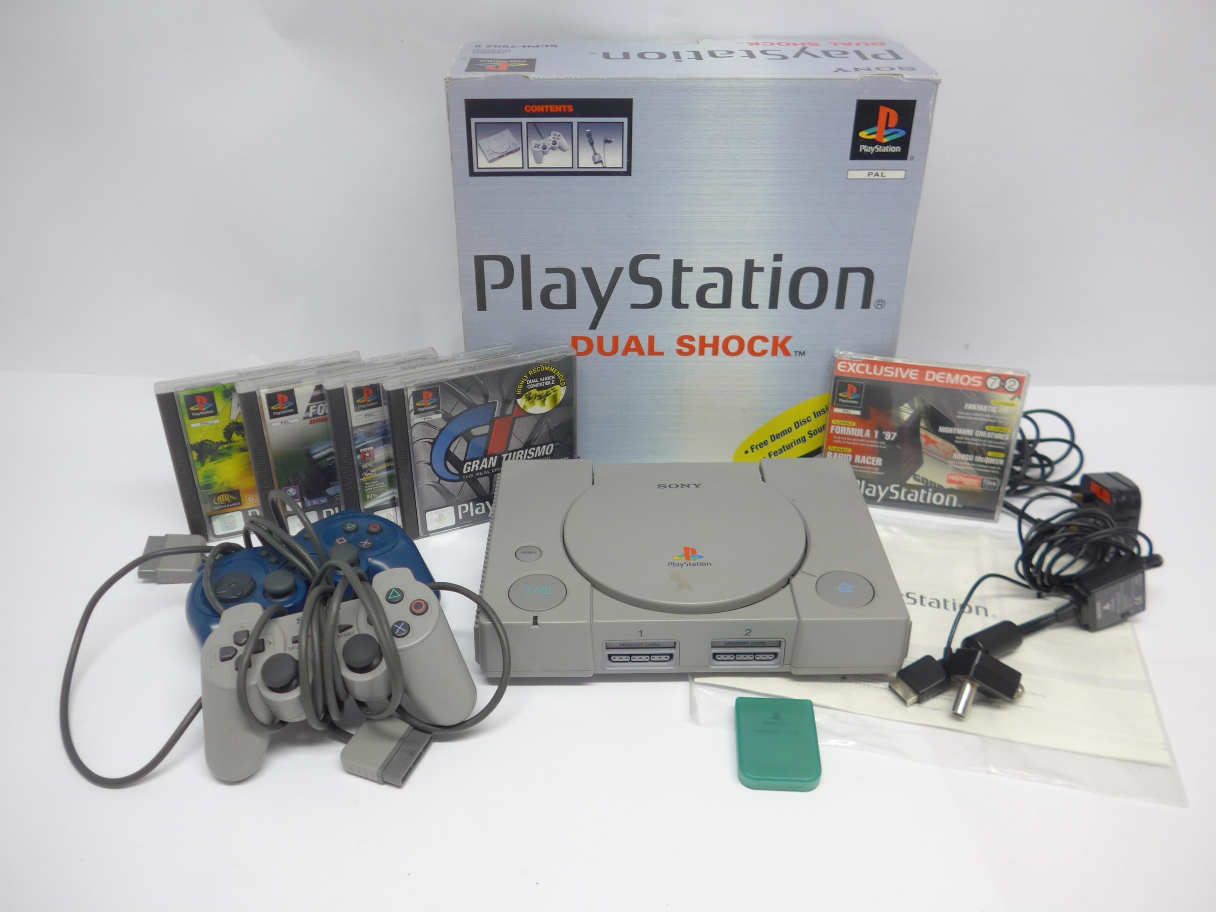 A boxed Sony PlayStation Dual Shock computer games console with one Sony controller and one Nu-Gen controller, memory card, manual, leads, four games to include V-Rally '97, Gran Turismo, Formula 1 '98 and Toca 2, and one demo disc