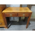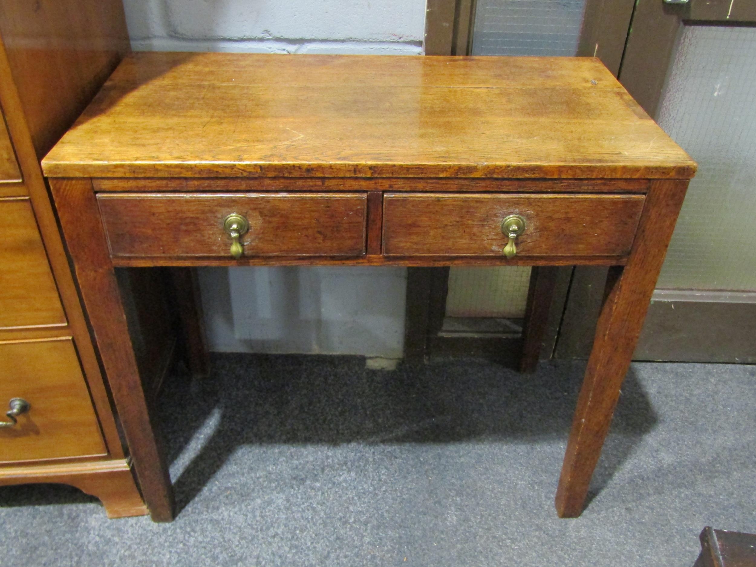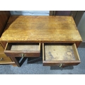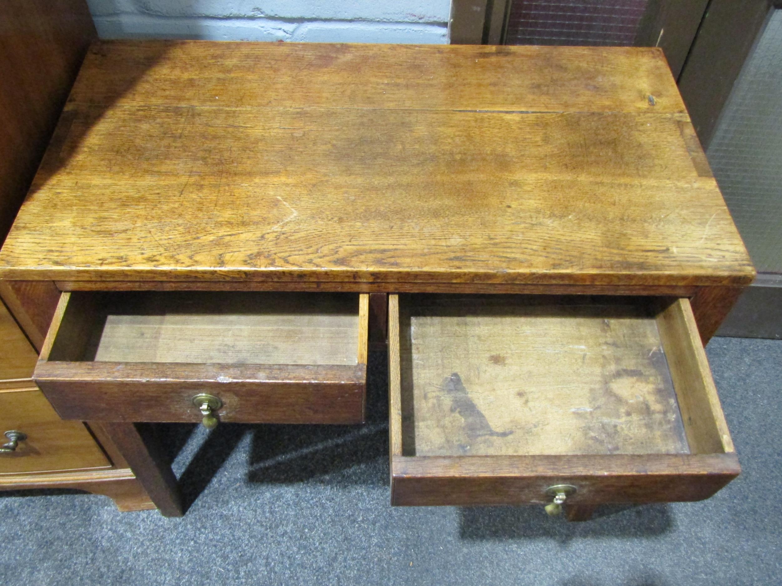 An early 20th Century oak school desk with two drawers on square tapering legs, 70cm tall x 76cm wide x 40cm deep