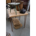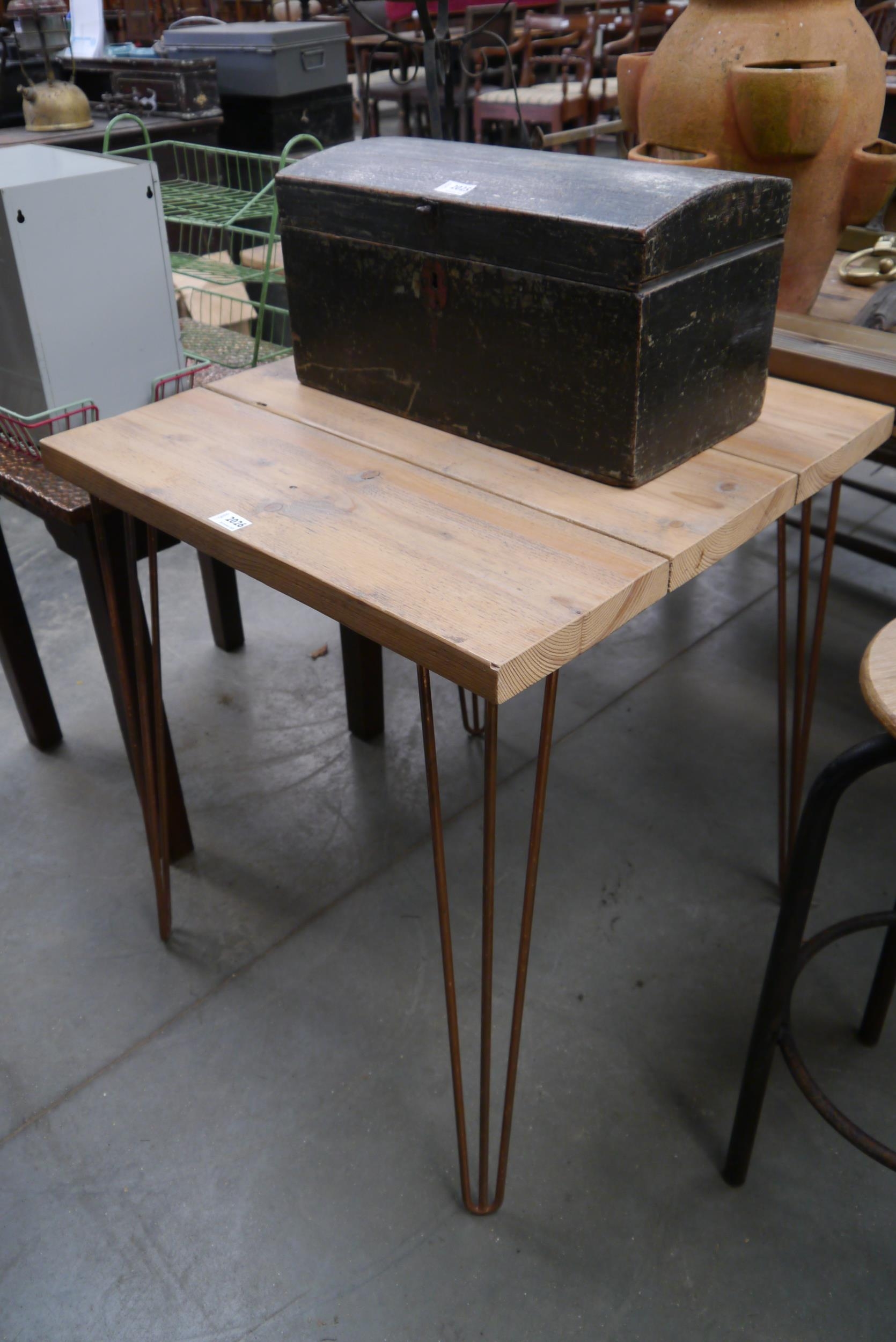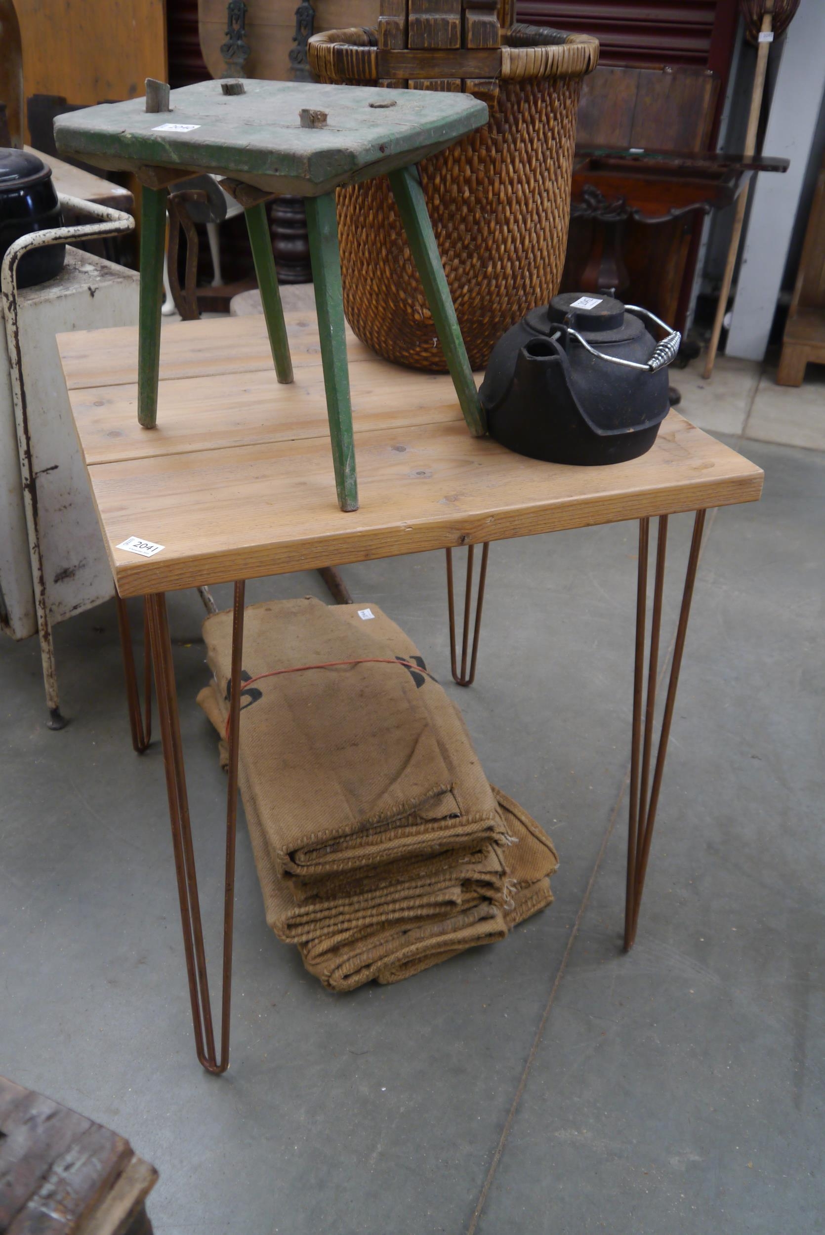A pine café table on metal hair pin legs 2ft square