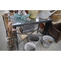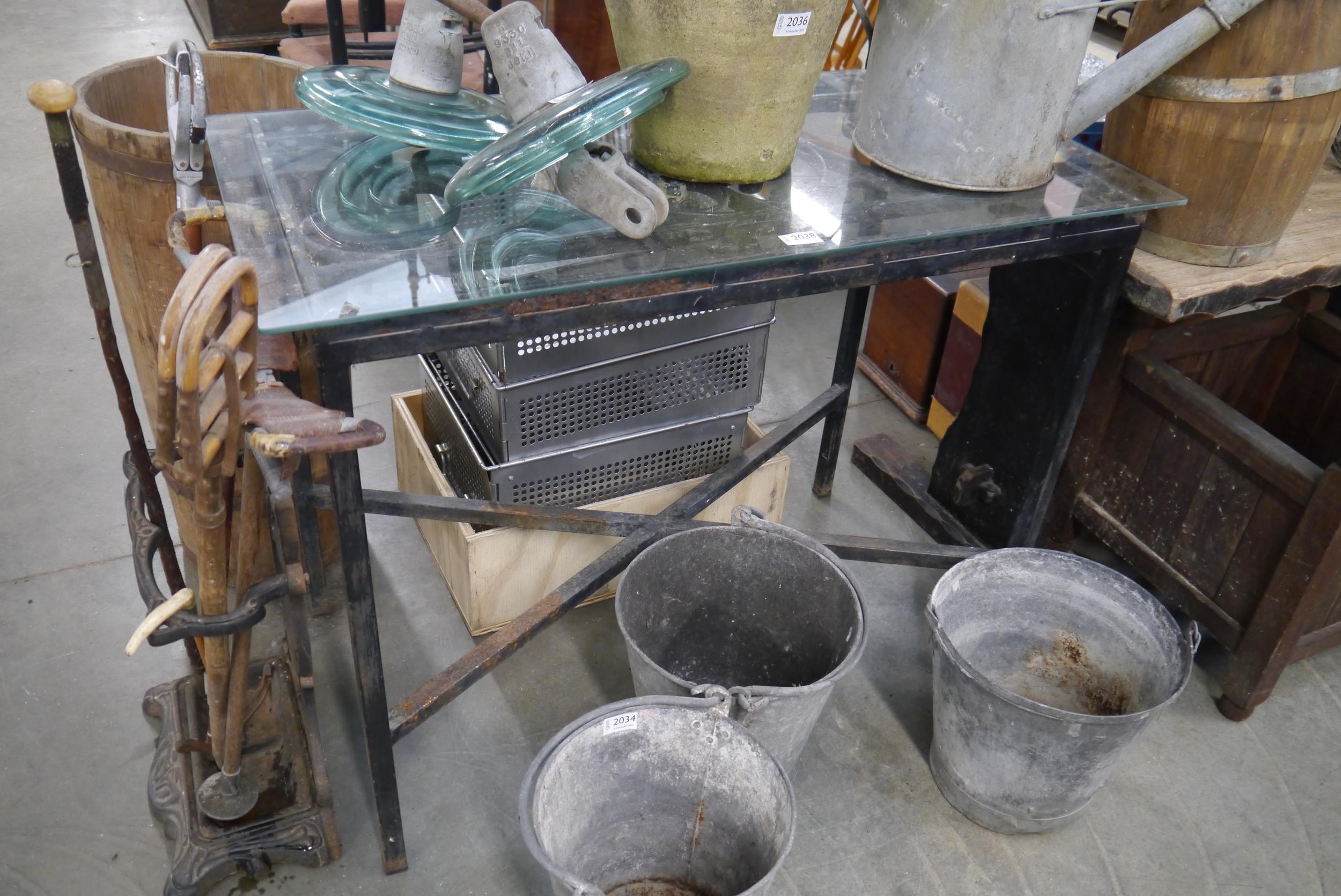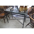 A cast garden table with glass top