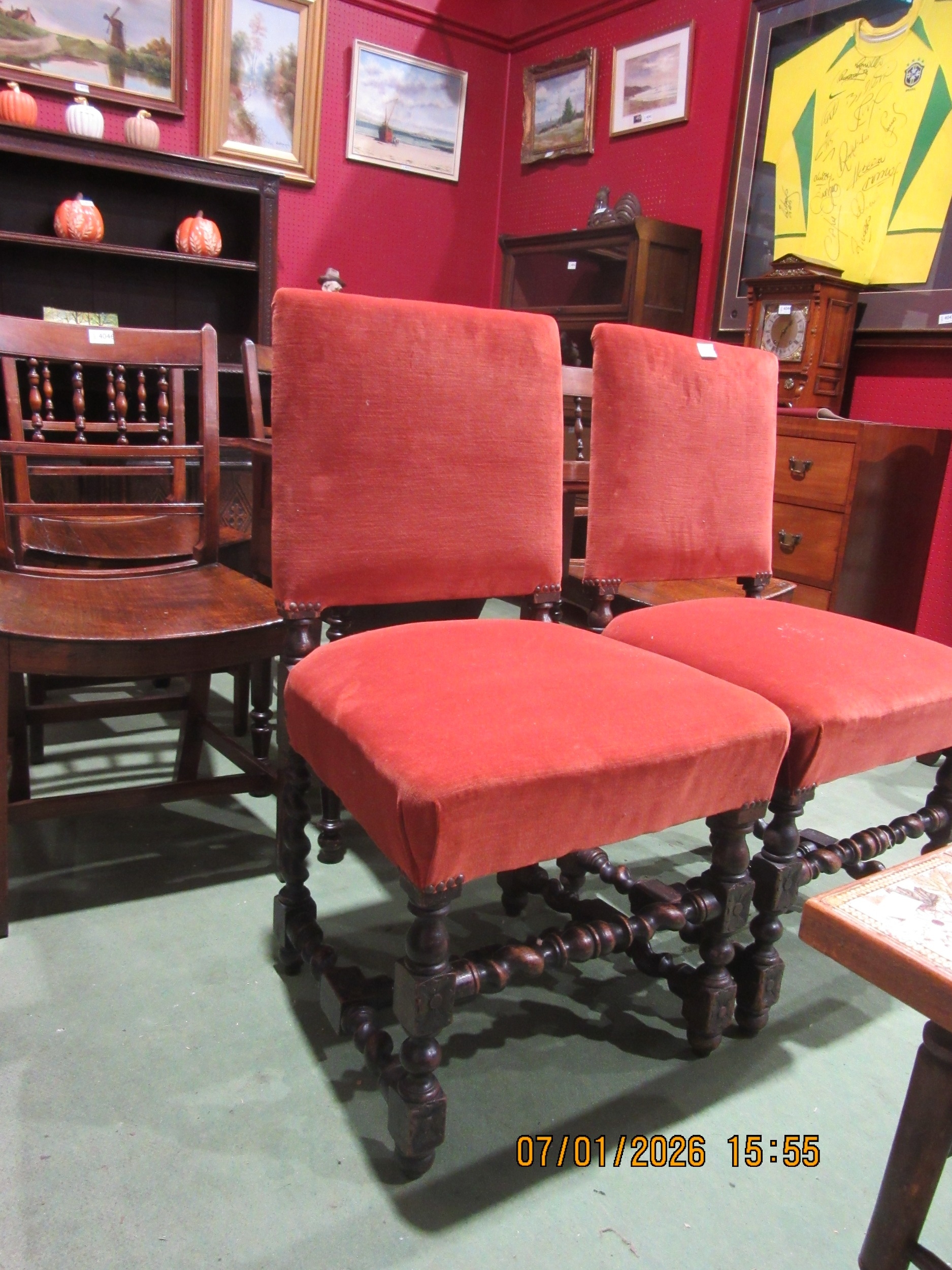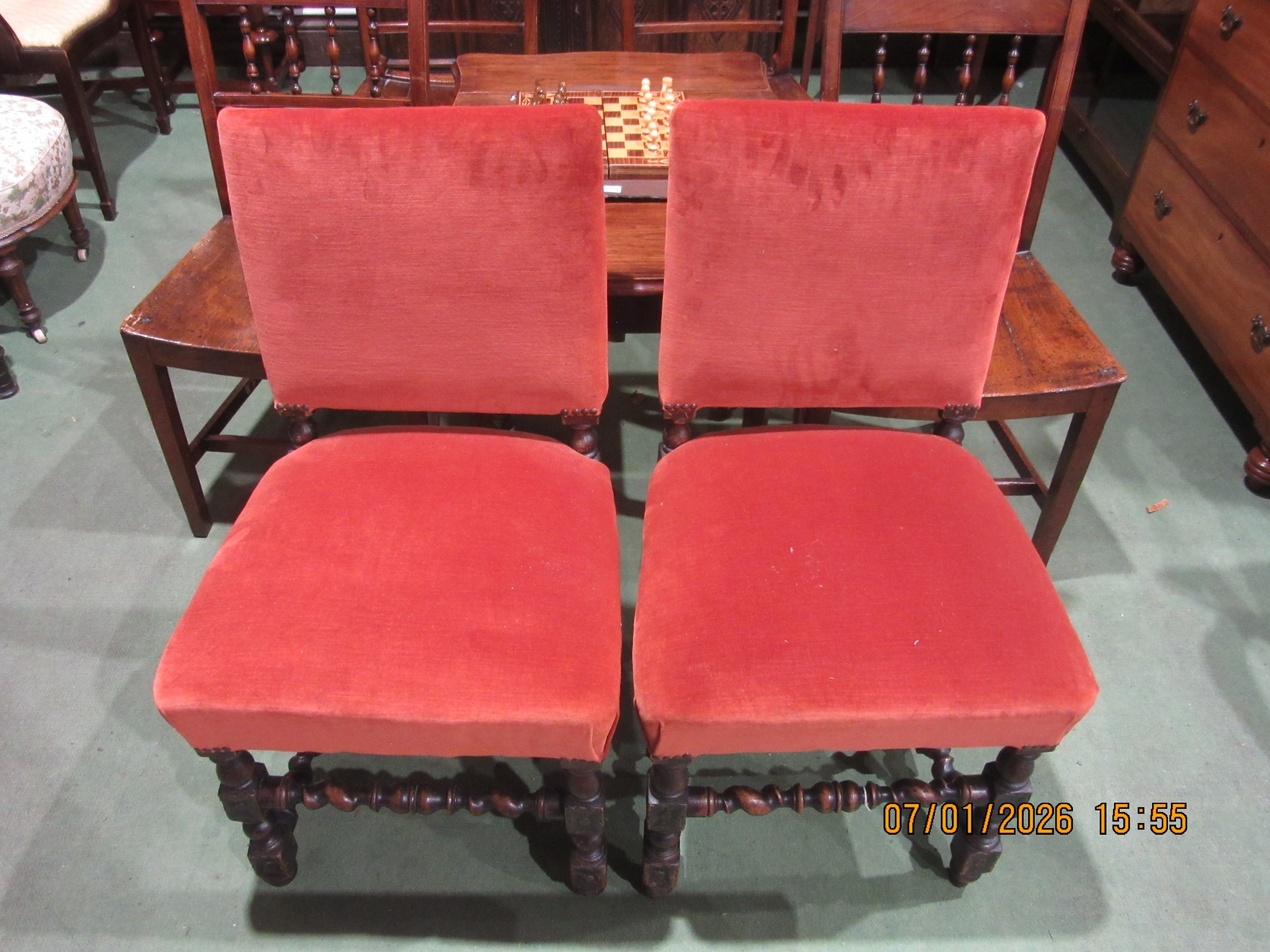 A pair of 17th Century revival oak barley twist chairs