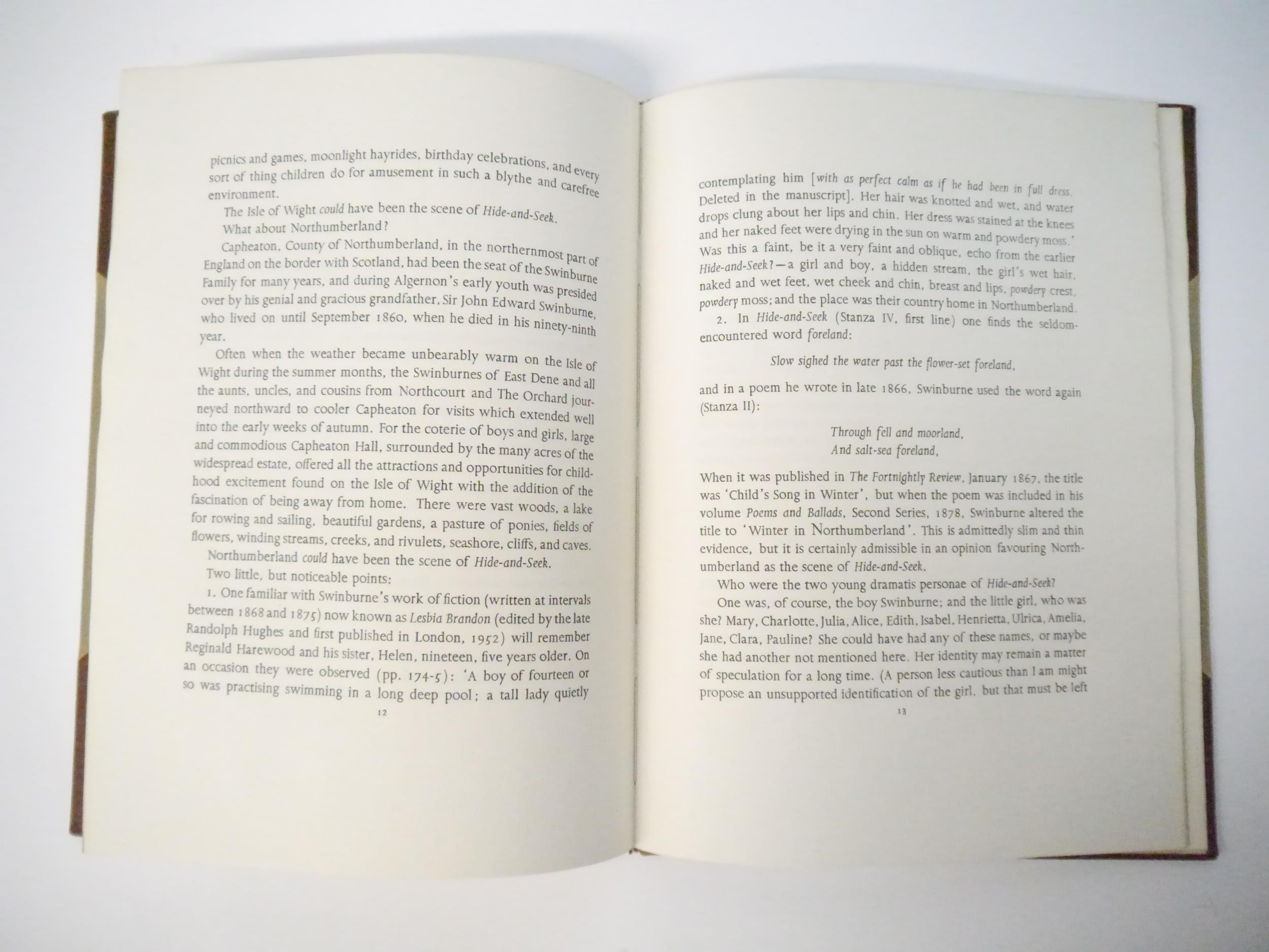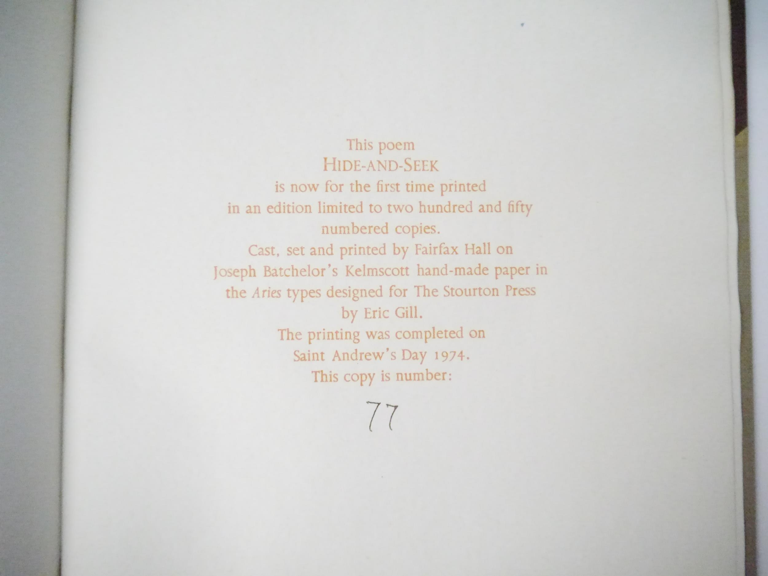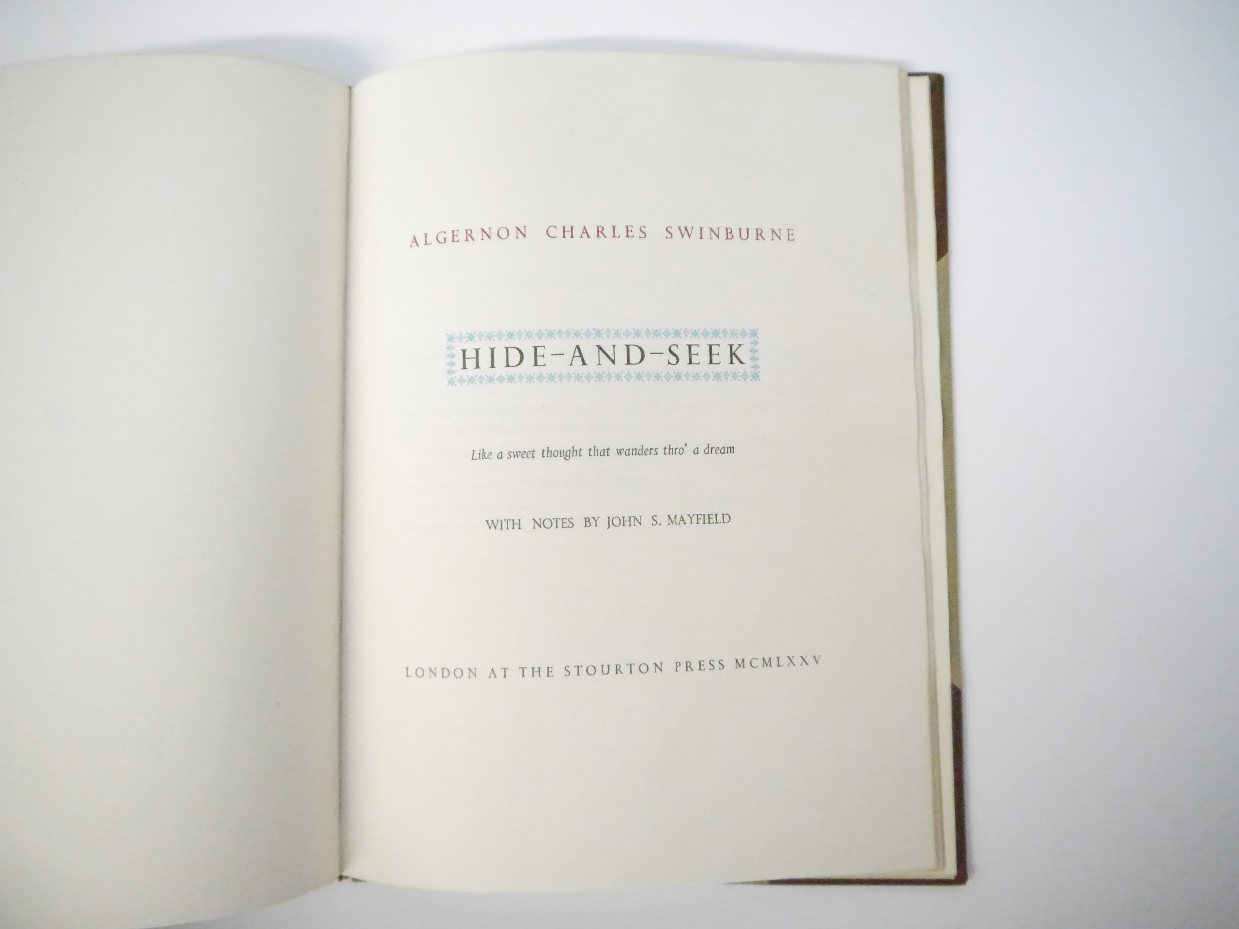 Stourton Press. Algernon Charles Swinburne: 'Hide and Seek. With notes by John S. Mayfield.', London, The Stourton Press, 1975, limited edition, number 77 of 250 copies, printed in several colours by Fairfax Hall on Joseph Batchelor's Kelmscott hand-made paper, in the Aries types designed for The Stourton Press by Eric Gill, [20]pp, 4to (28 x 21cm), original half calf gilt, spine gilt lettered, top edge gilt