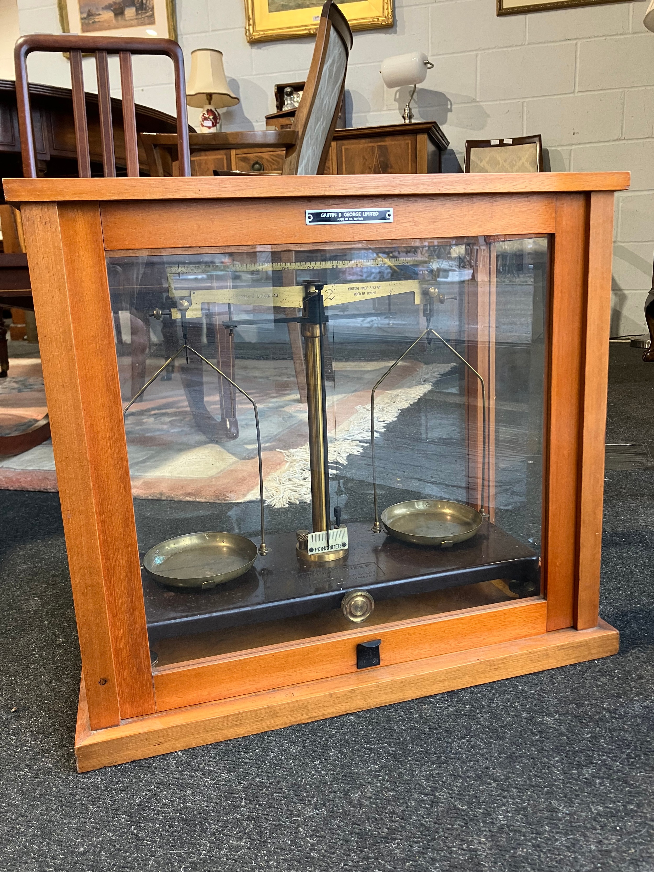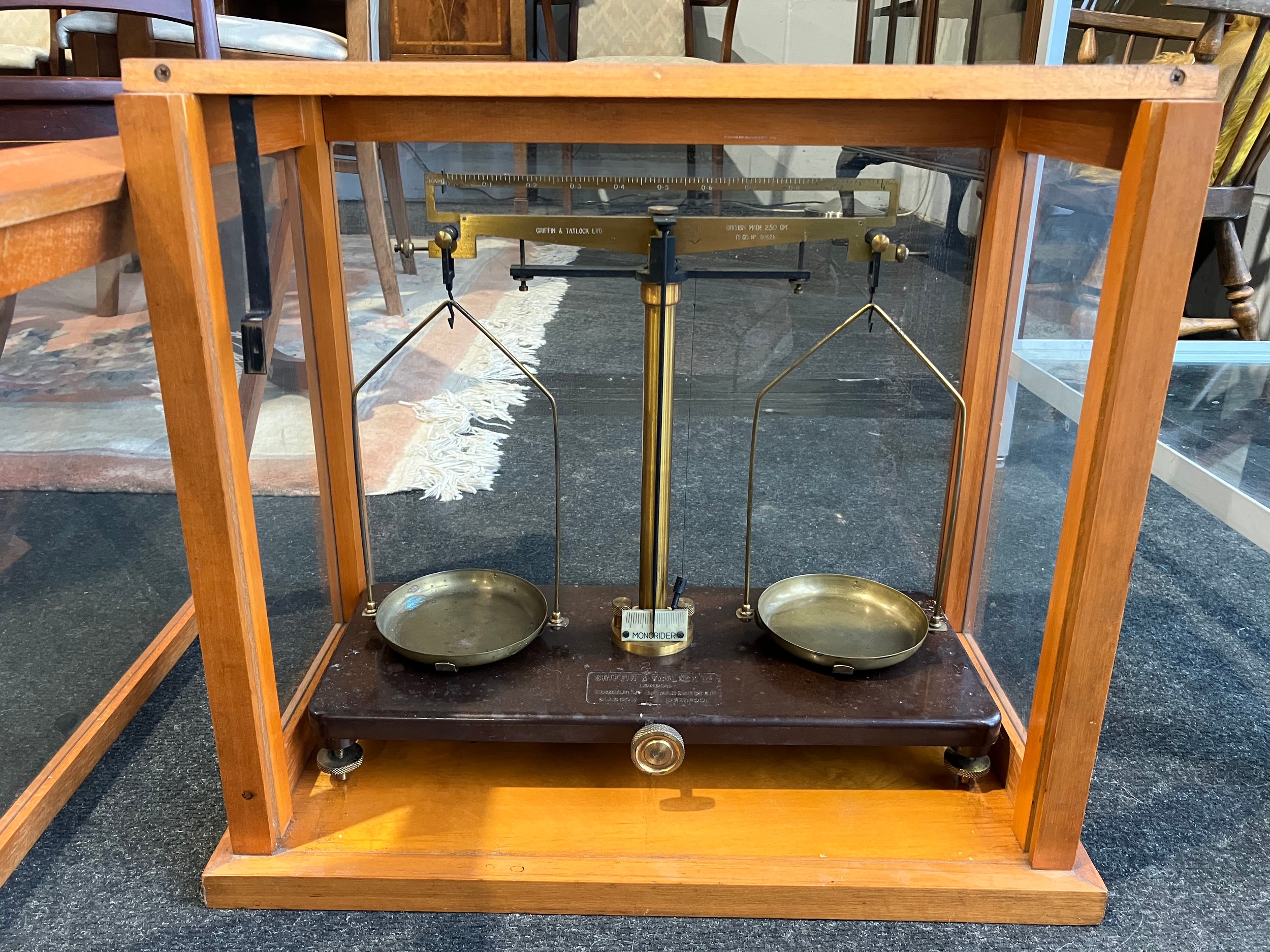 A Griffin & Tatlock Ltd twin pan mono rider laboratory apothecary balance scale. Griffin & George Ltd case