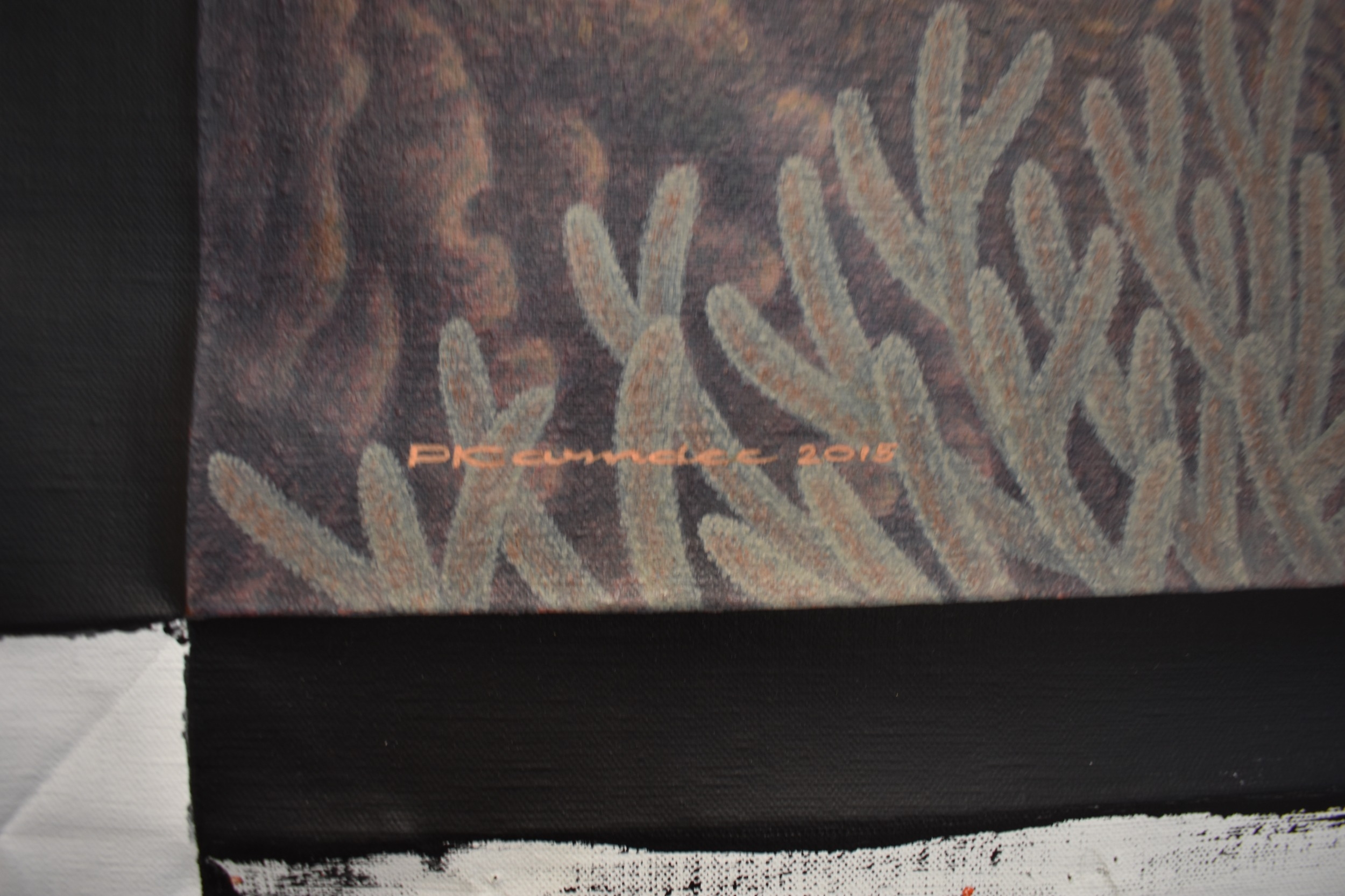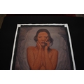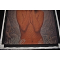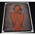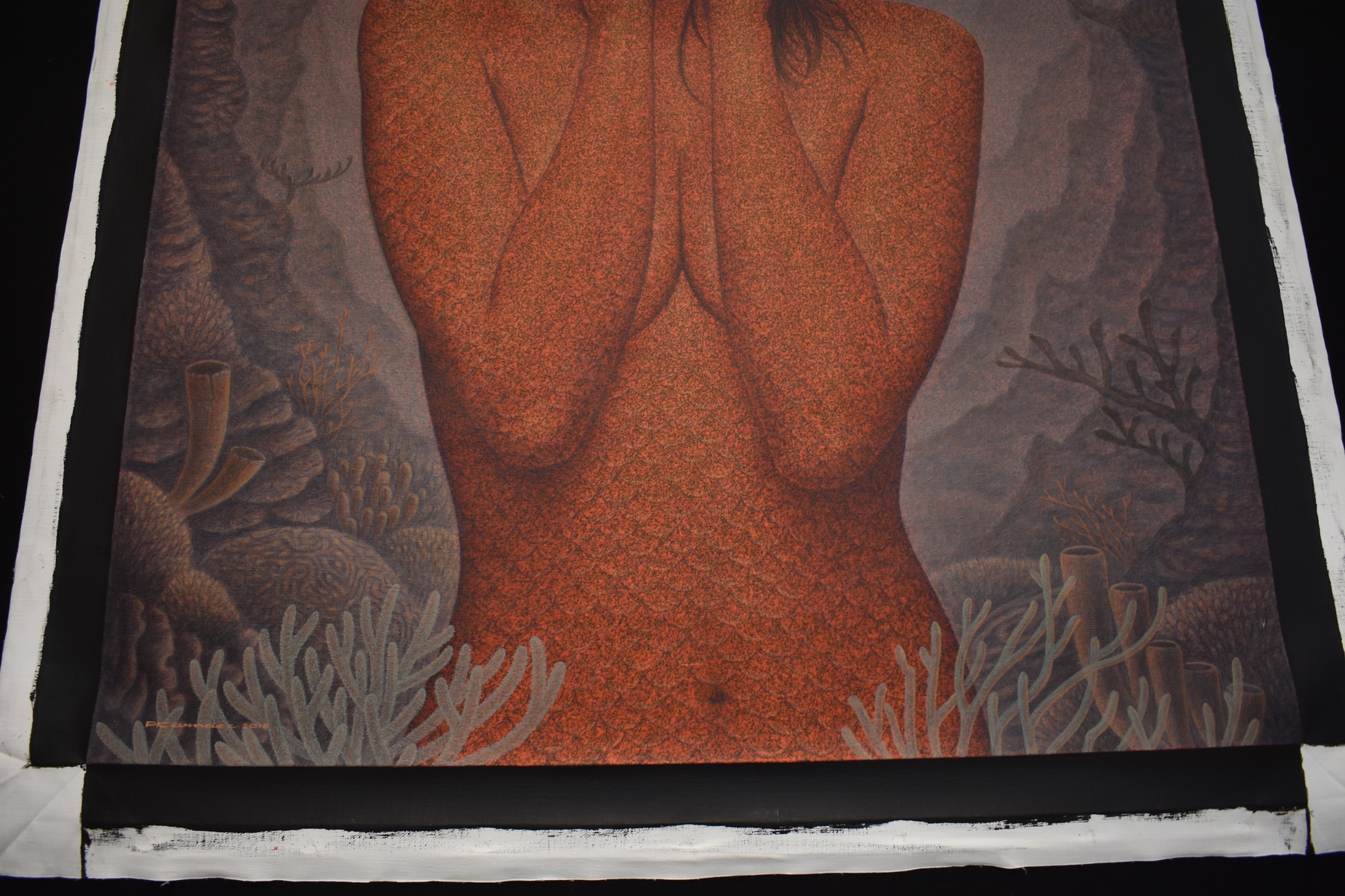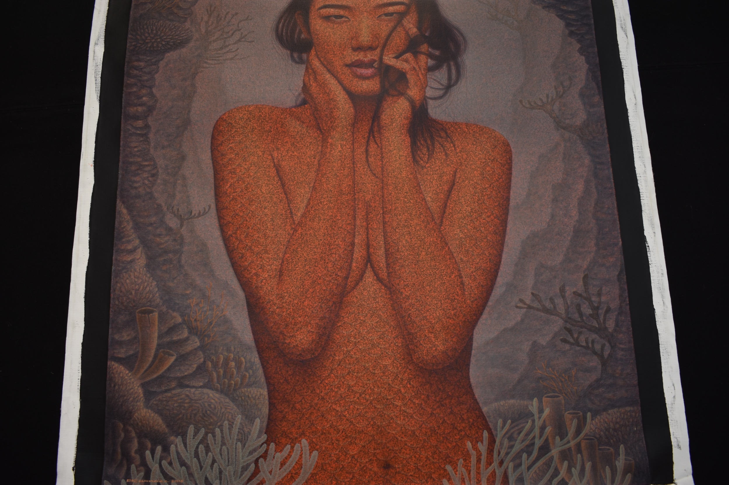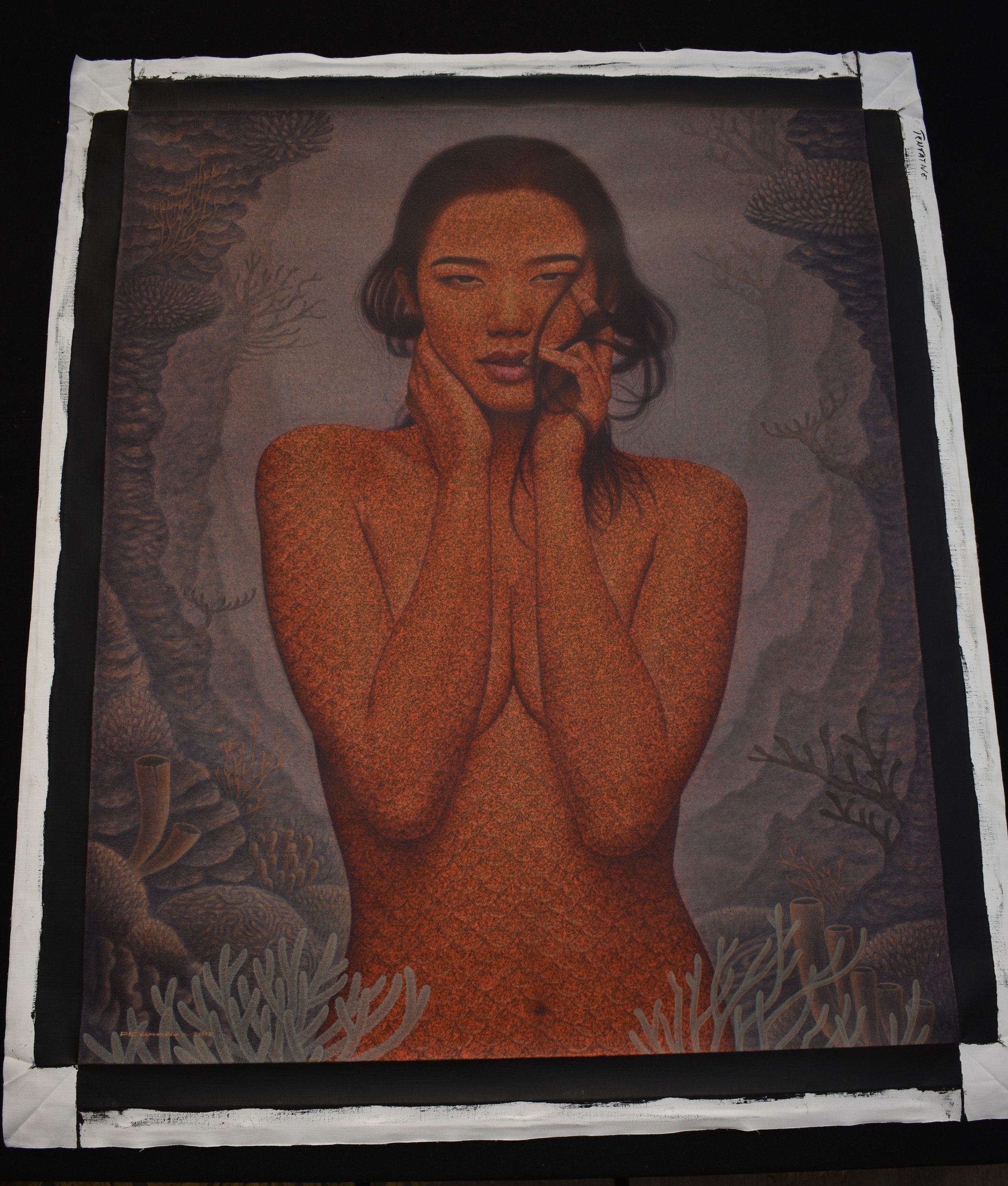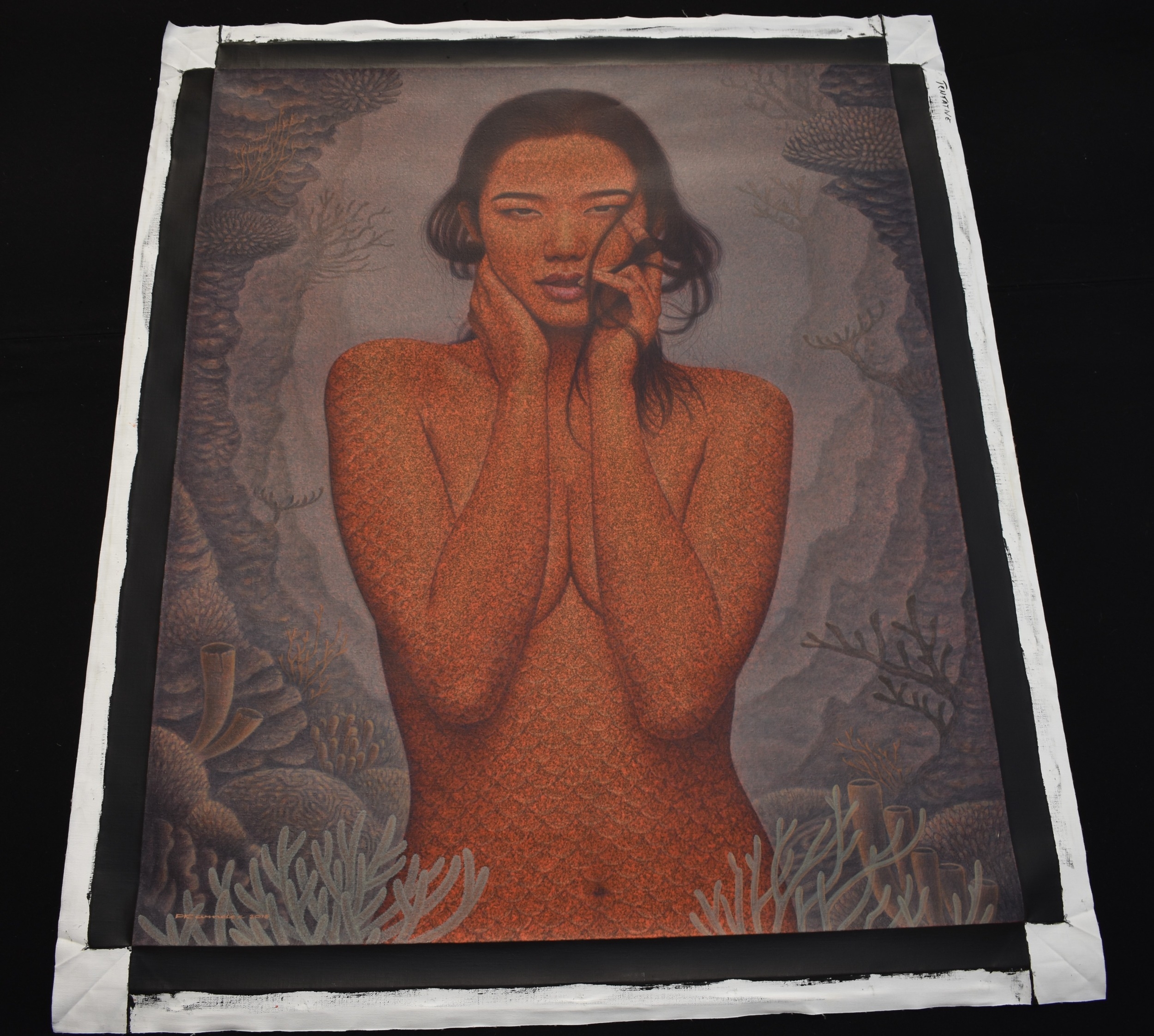 PAIROJ KARNDEE Thai Contemporary Artist: Portrait female in Mermaid form, titled " Tentative" half length portrait with hand holding neck, out swept hair finger touching lips , salmon tonal scale skin in underwater setting, acrylic on canvas. The artist has been influenced by the mysterious Apsaras - the celestial maidens of ancient Asian culture depicted in the galleries of Cambodia's Angkor Wat. His techniques painstakingly recreate the stone textures of those images with a time-consuming rendering of acrylic on linen canvas. His figures show a notable range of emotions. Signed and dated, 2015, image size 109cm x 89cm