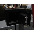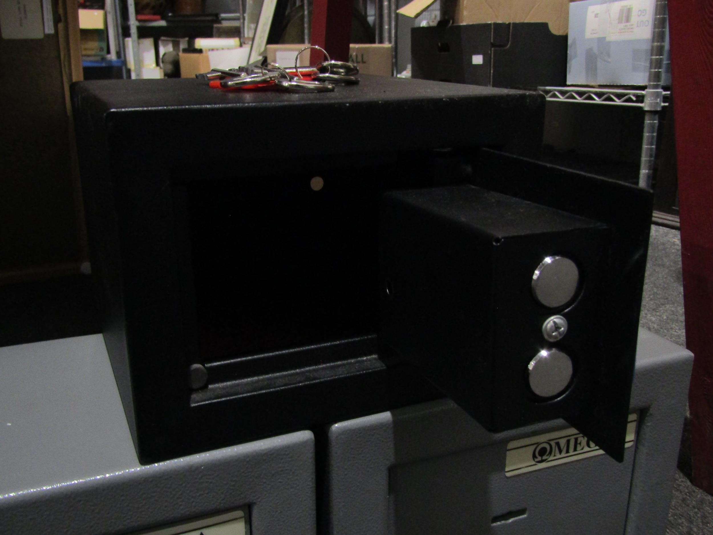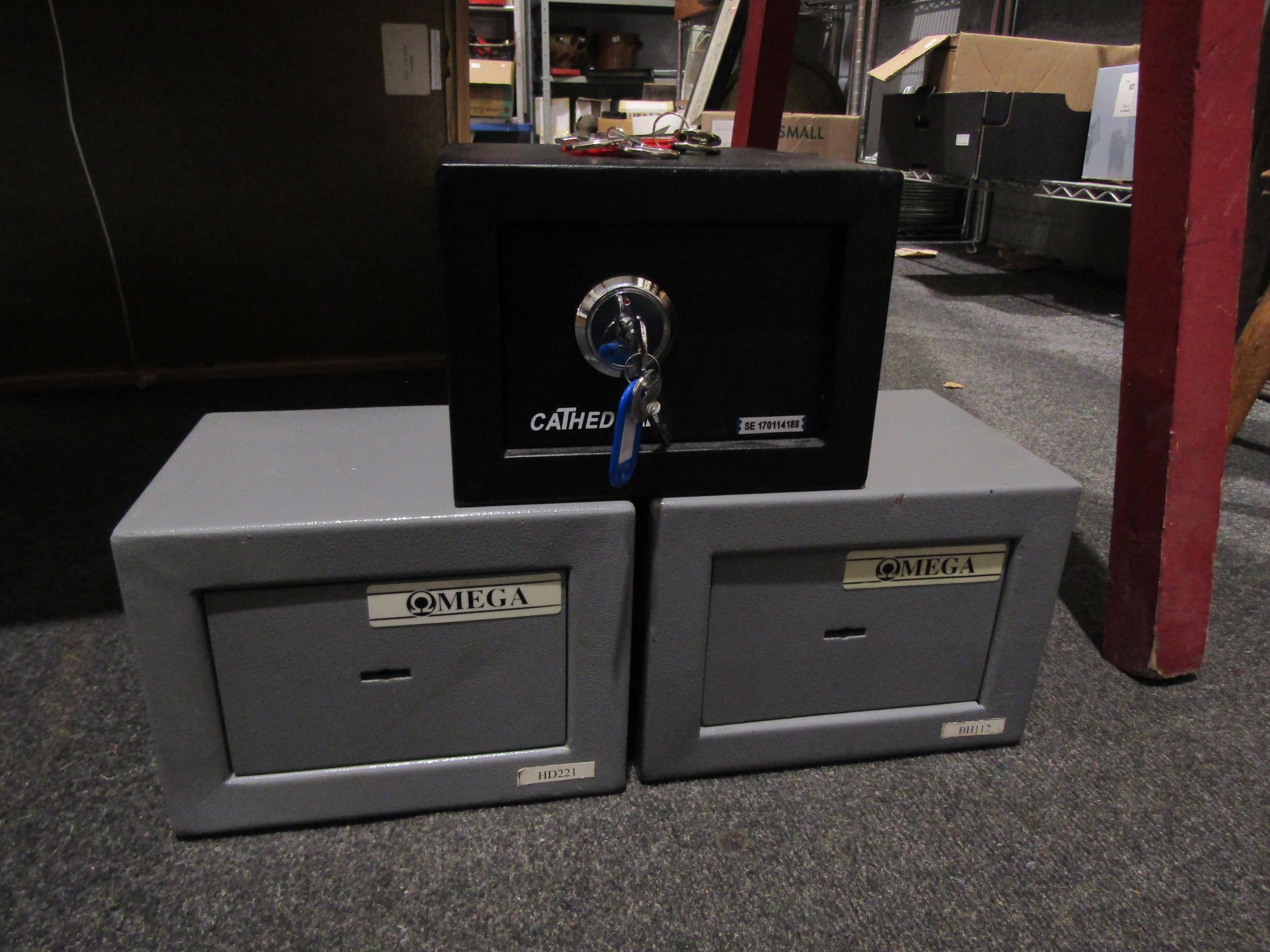 Two Omega metal safes and a Cathedral example, table-top size, with keys (3)