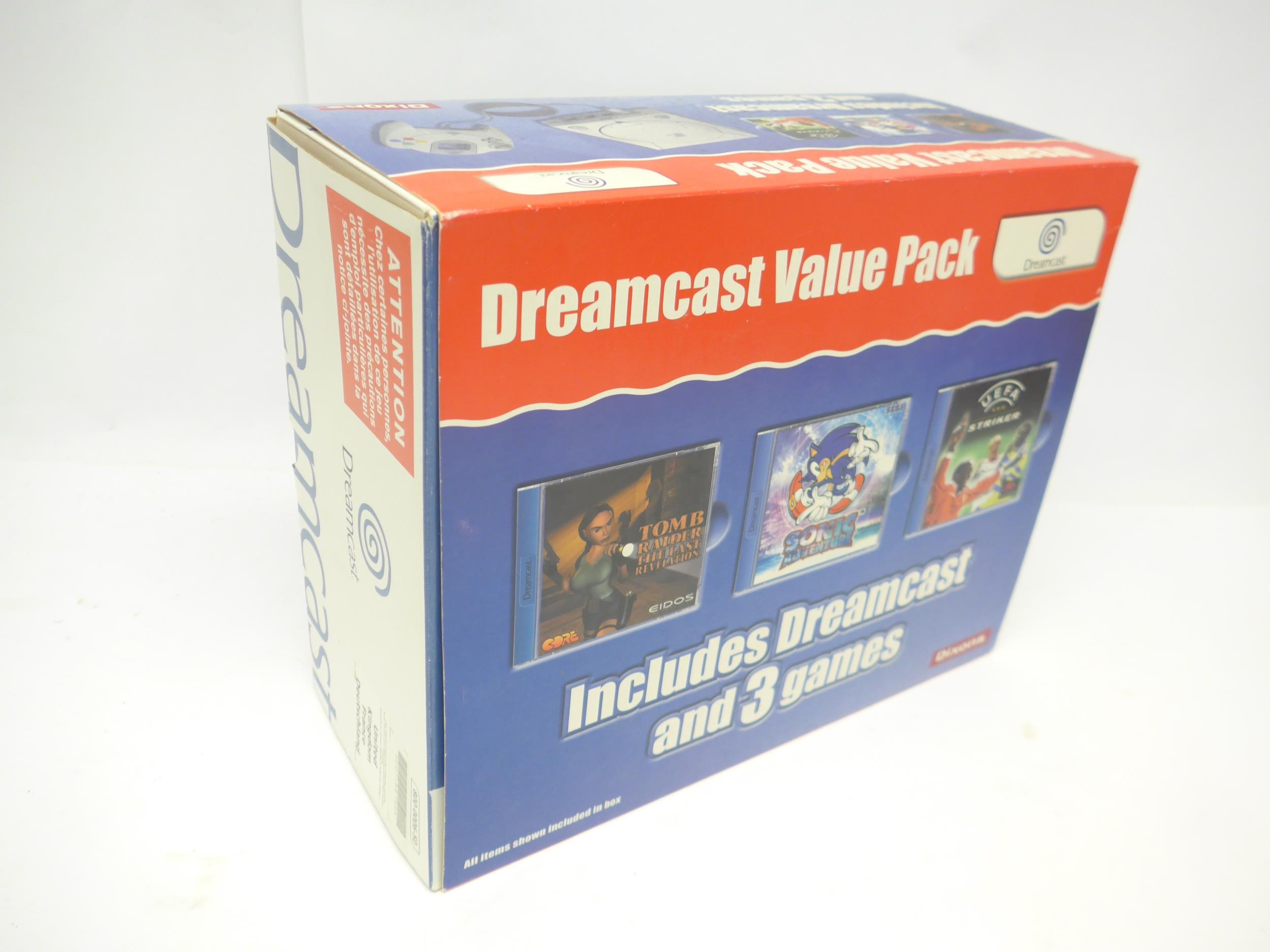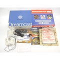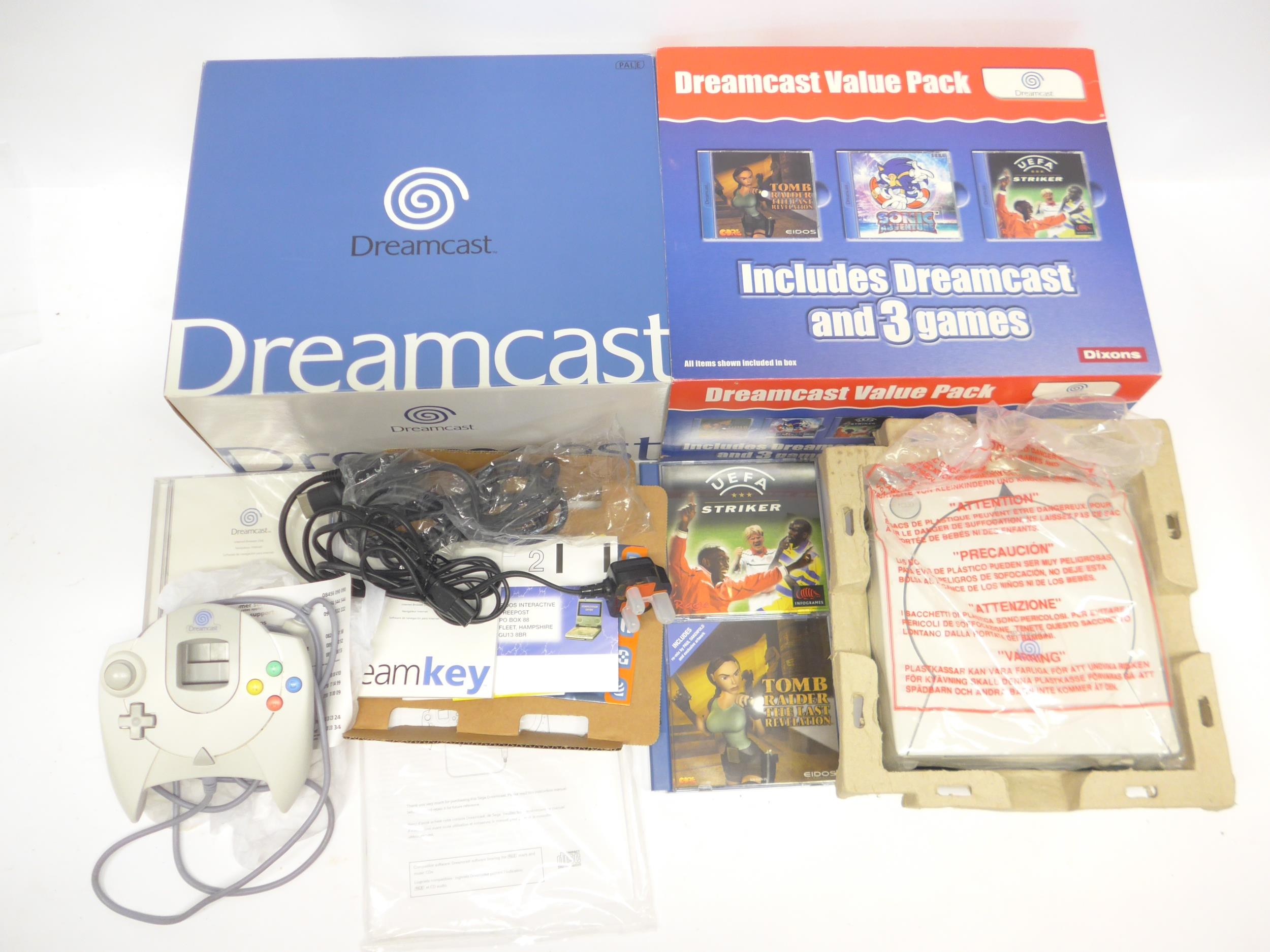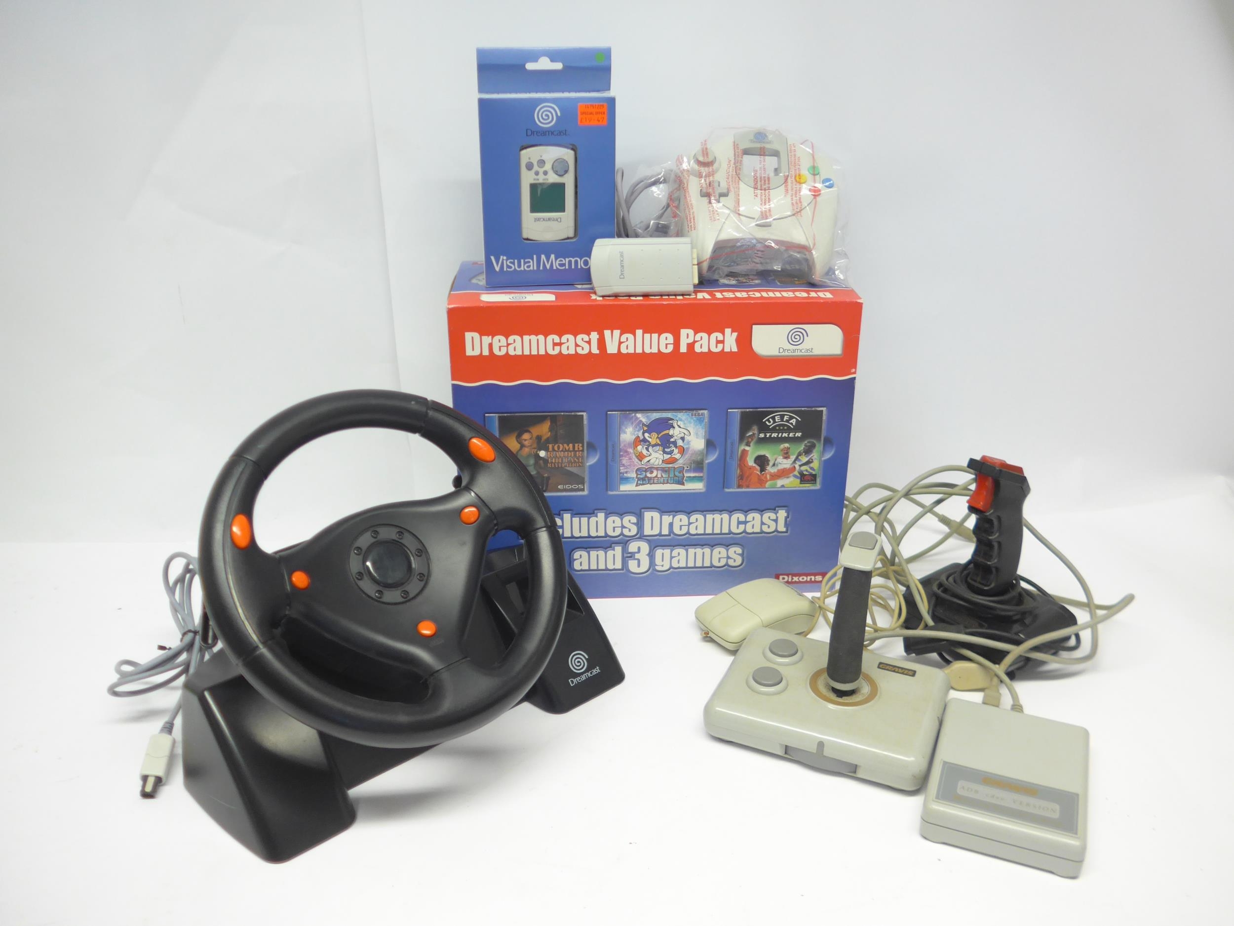 Retro Gaming - A boxed Sega Dreamcast Value Pack, comprising console, controller, Tomb Raider: The Last Revelation and UEFA Striker games (missing Sonic Adventure), leads, manuals, and sealed Dream Key disc. Together with a boxed Visual Memory card, unboxed controller and Vibration Pak, Dreamcast steering wheel, a Gravis MouseStick joystick, Spectravideo joystick and an Essential mouse