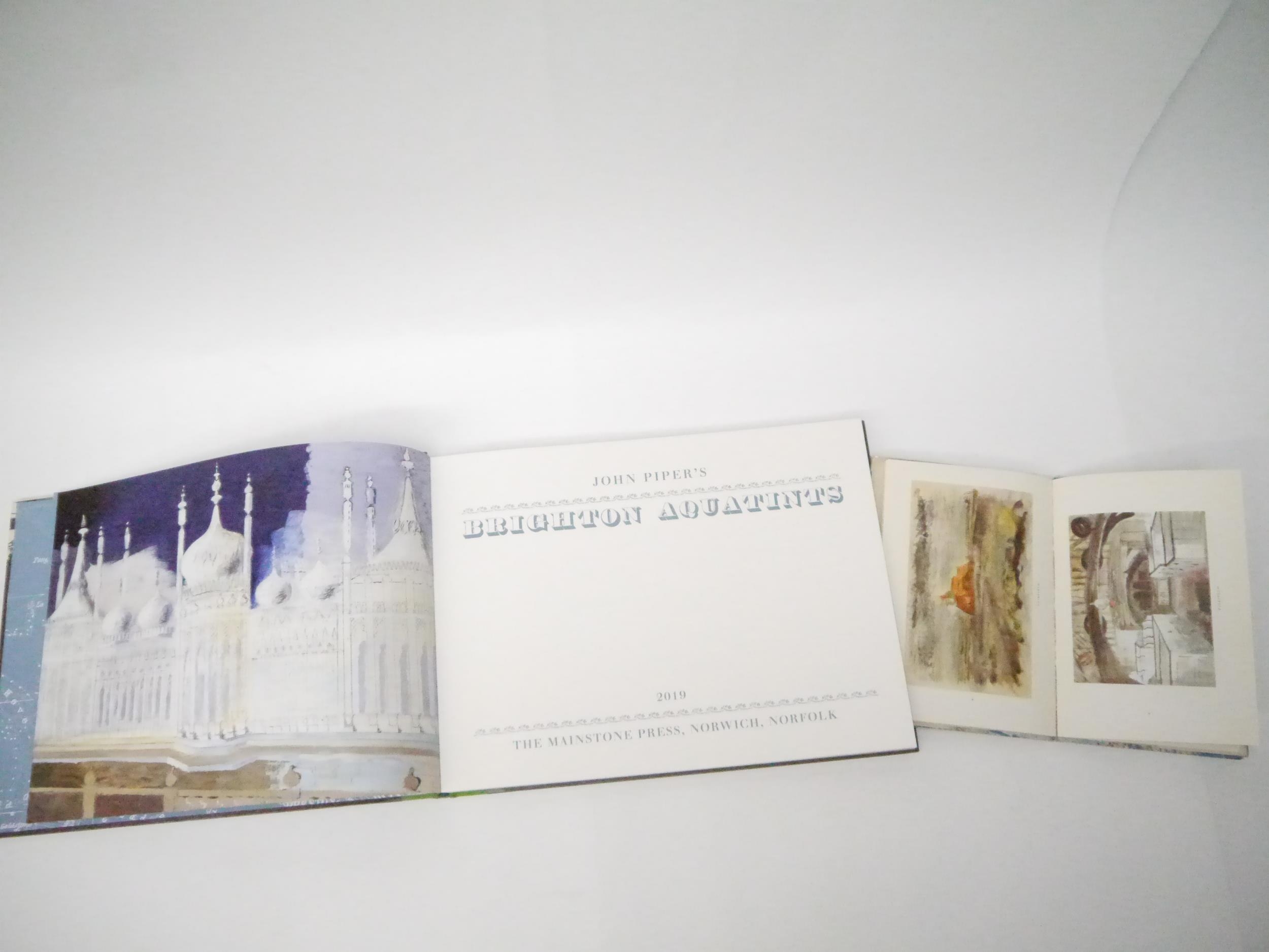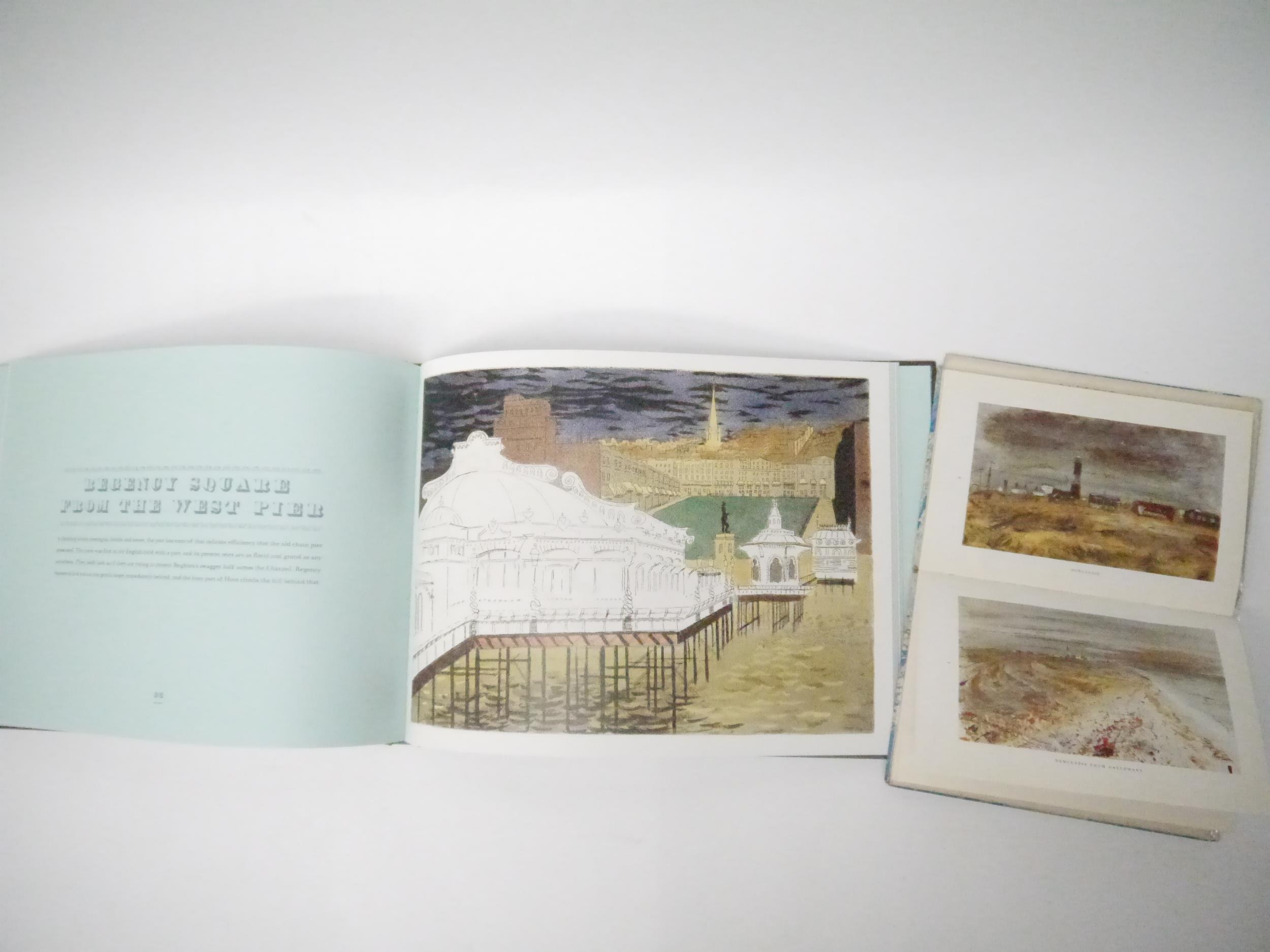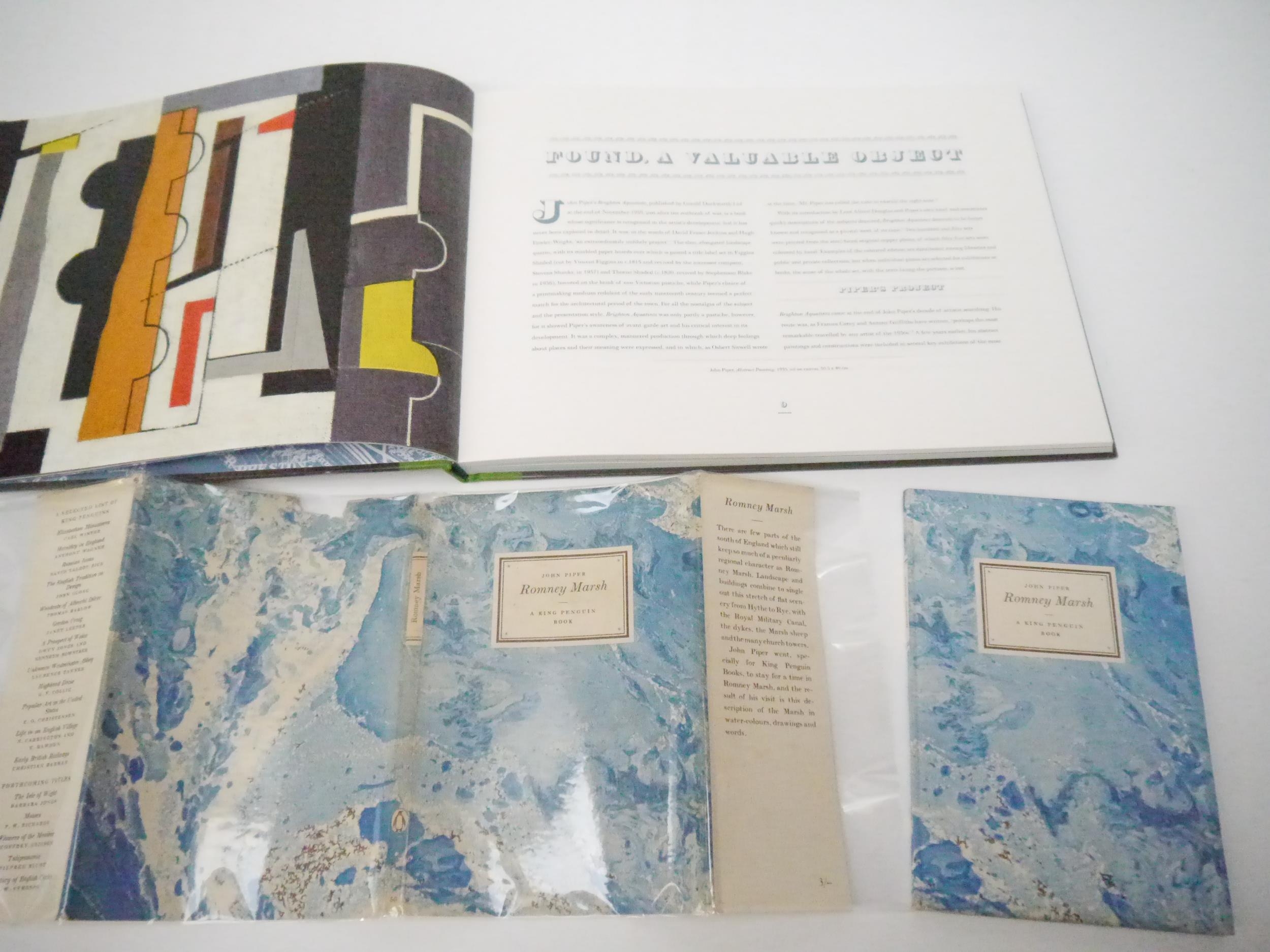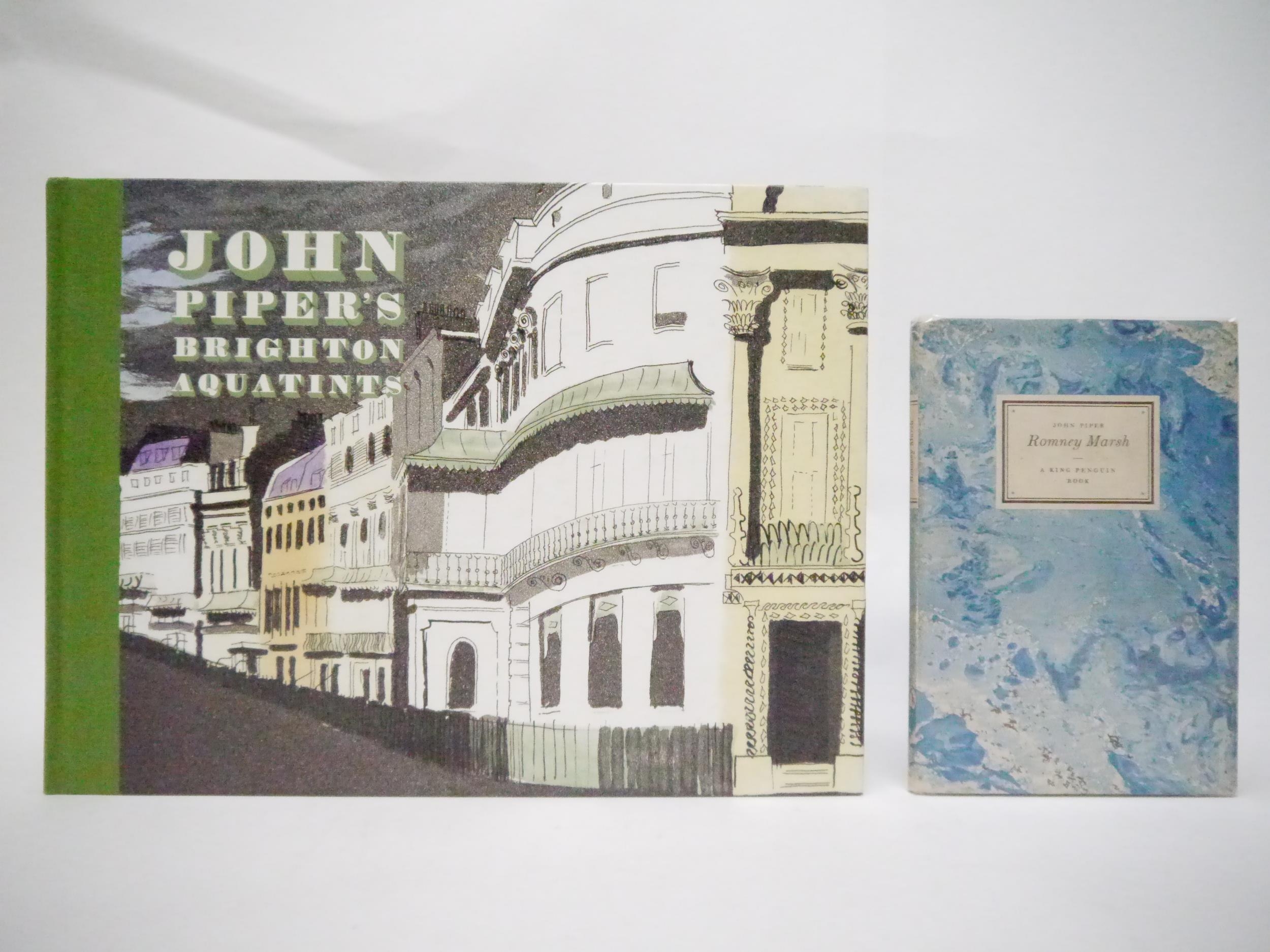 John Piper: 'Romney Marsh', London, Penguin Books, 1950, 1st edition, King Penguin no. 55, 16 full page colour and 16 b/w illustrations by John Piper complete, 35,[1]pp followed by 16 colour illustrations, original patterned paper covered boards, dust wrapper (3/- price intact); together with Alan Powers: 'John Piper's Brighton Aquatints', Norwich, The Mainstone Press, 2019, 1st edition, 111,[1]pp, colour and b/w illustrated throughout reproducing Piper's aquatints, oblong 4to (23.5 x 32cm), original clotyh backed pictorial paper covered boards, spine silver lettered (2)