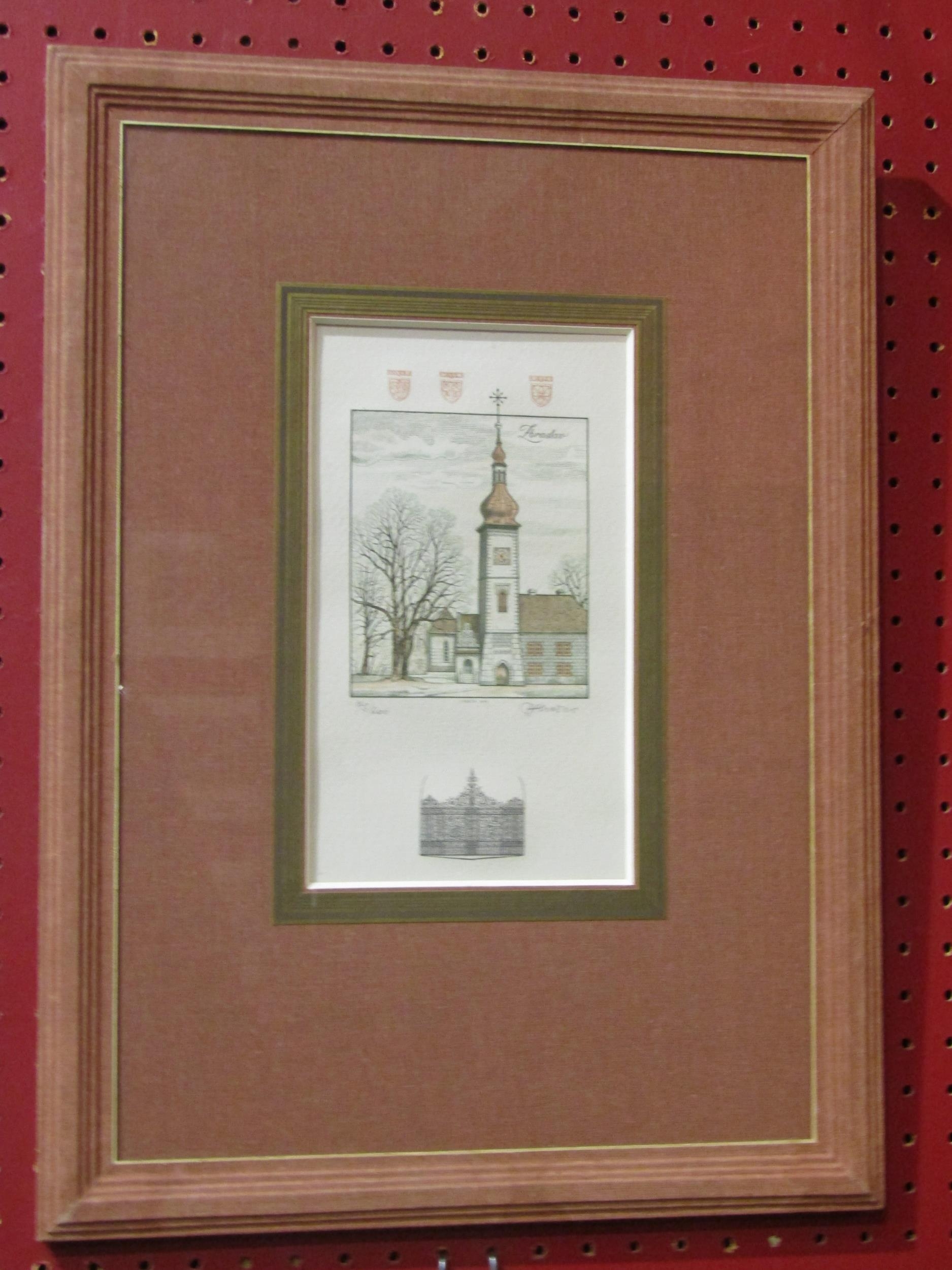 Two pencil signed prints by Joseph Hercik depicting a view of a basilica inside Prague castle and a country church, both framed and glazed, 20cm x 14cm and 21cm x 12cm image size