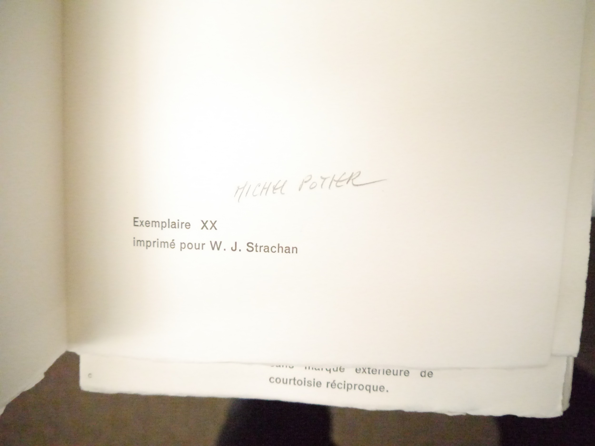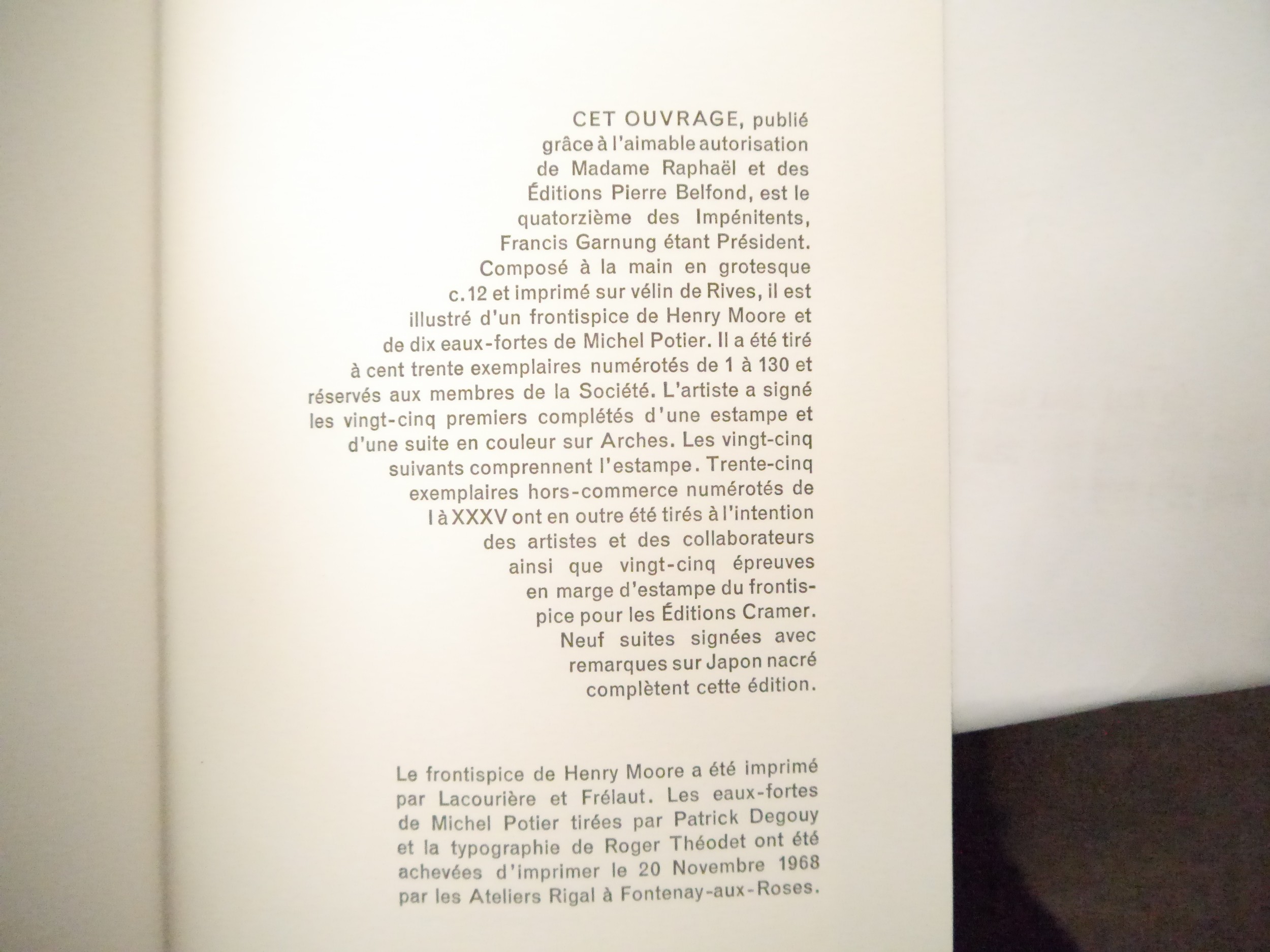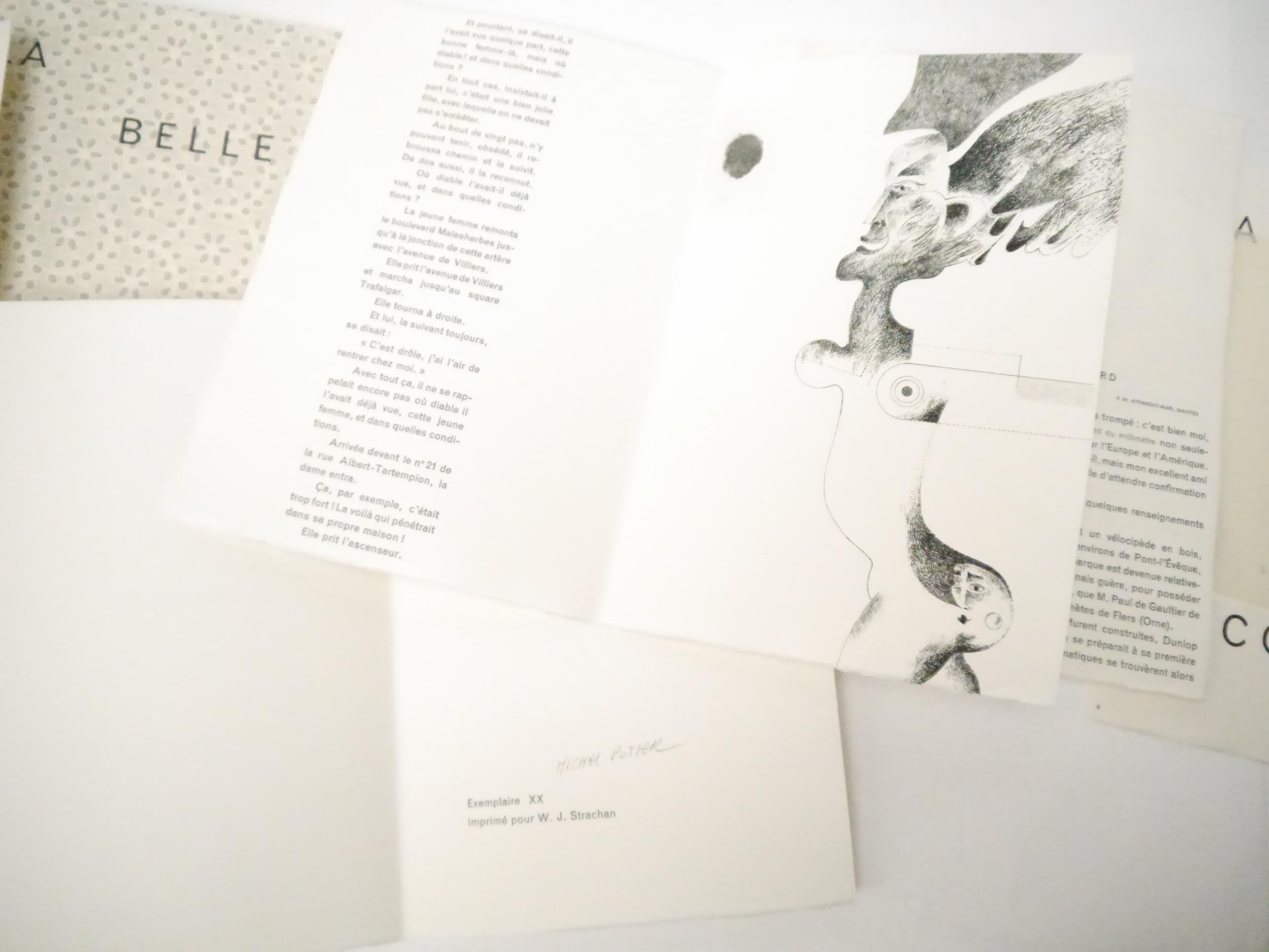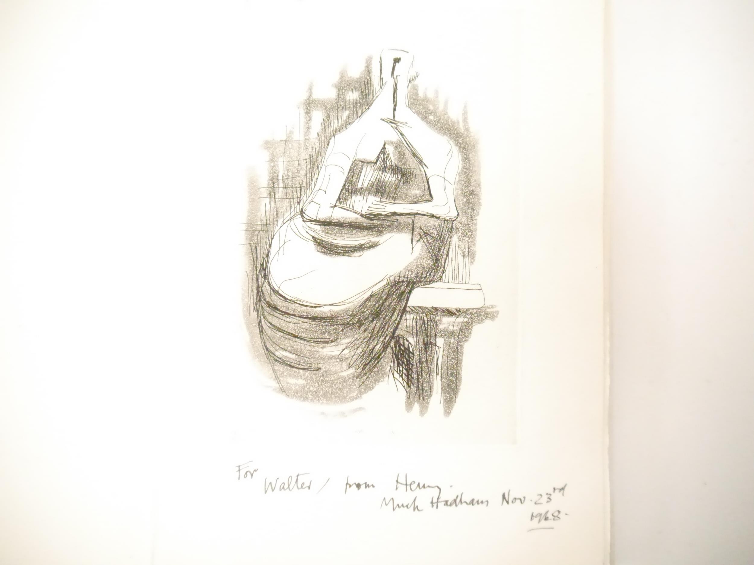 Henry Moore (illustrated); Allais (Alphonse): ‘La Belle Inconnue’, Paris: [Fontenay-aux-Roses], Les Impenitents, 1968. Presentation copy signed & inscribed by Henry Moore to Walter Strachan at lower margin of engraved frontispiece by Moore “For Walter, from Henry. Much Hadham Nov. 23rd 1968.”, engraved frontispiece by Moore, illustrated with ten etchings by Michel Potier (one double-page), limited to 130 copies, this being one of only 30 personally dedicated hors-commerce, Exemplaire XX for Walter Strachan, additionally signed by Michel Potier in pencil to limitation page. 28.5cm, pp. [lxxvi], captioned & patterned card covers, housed loosely within paper-covered boards with slipcase. Provenance: By descent of Walter J. Strachan (1903-1994), poet, translator and champion of the arts. Strachan taught at Bishop's Stortford College and was the author of numerous works, including A Relationship with Henry Moore 1942-1976 [Elliott Group, 1988]; Towards Sculpture: Drawings and Maquettes from Rodin to Oldenburg [Thames & Hudson, 1976]; Apollinaire to Aragon: Thirty Modern French Poets [Methuen, 1948]. Much of his personal collection went to the Tate, the V&A and the Taylor Institution, as well as forming the basis of The Walter Strachan Collection, University of Manchester Library.