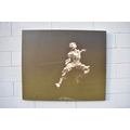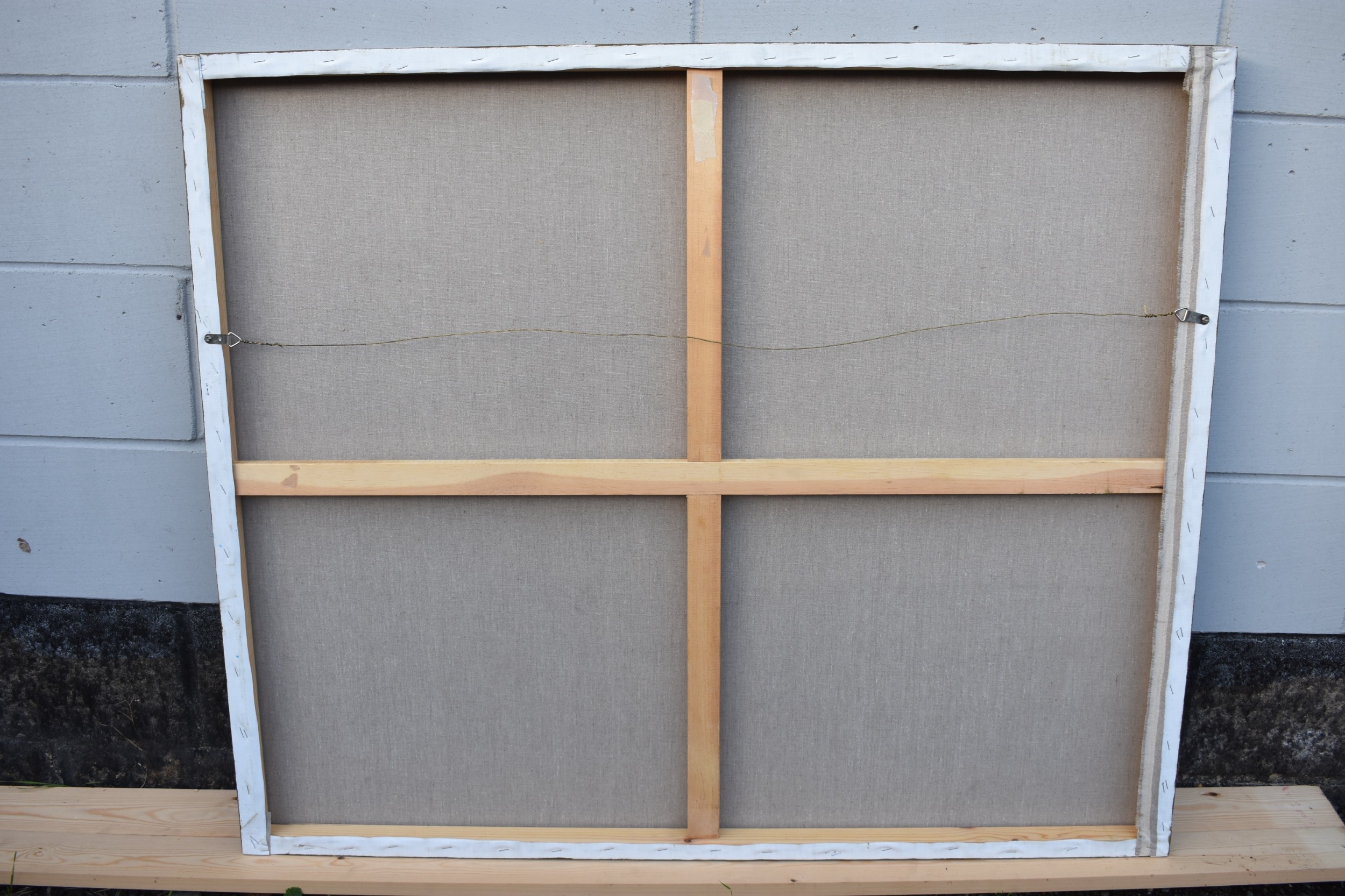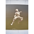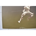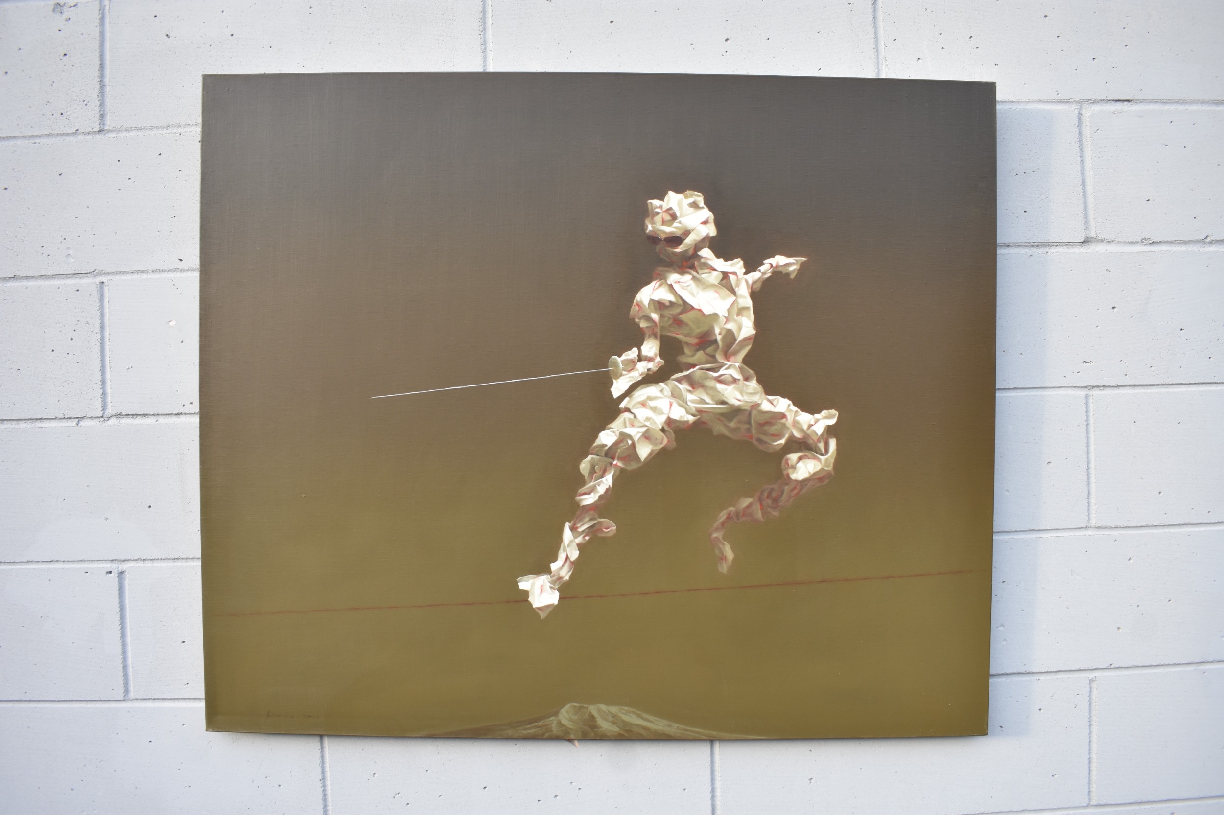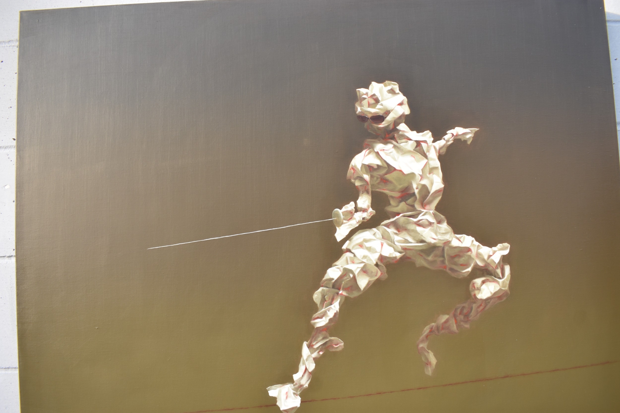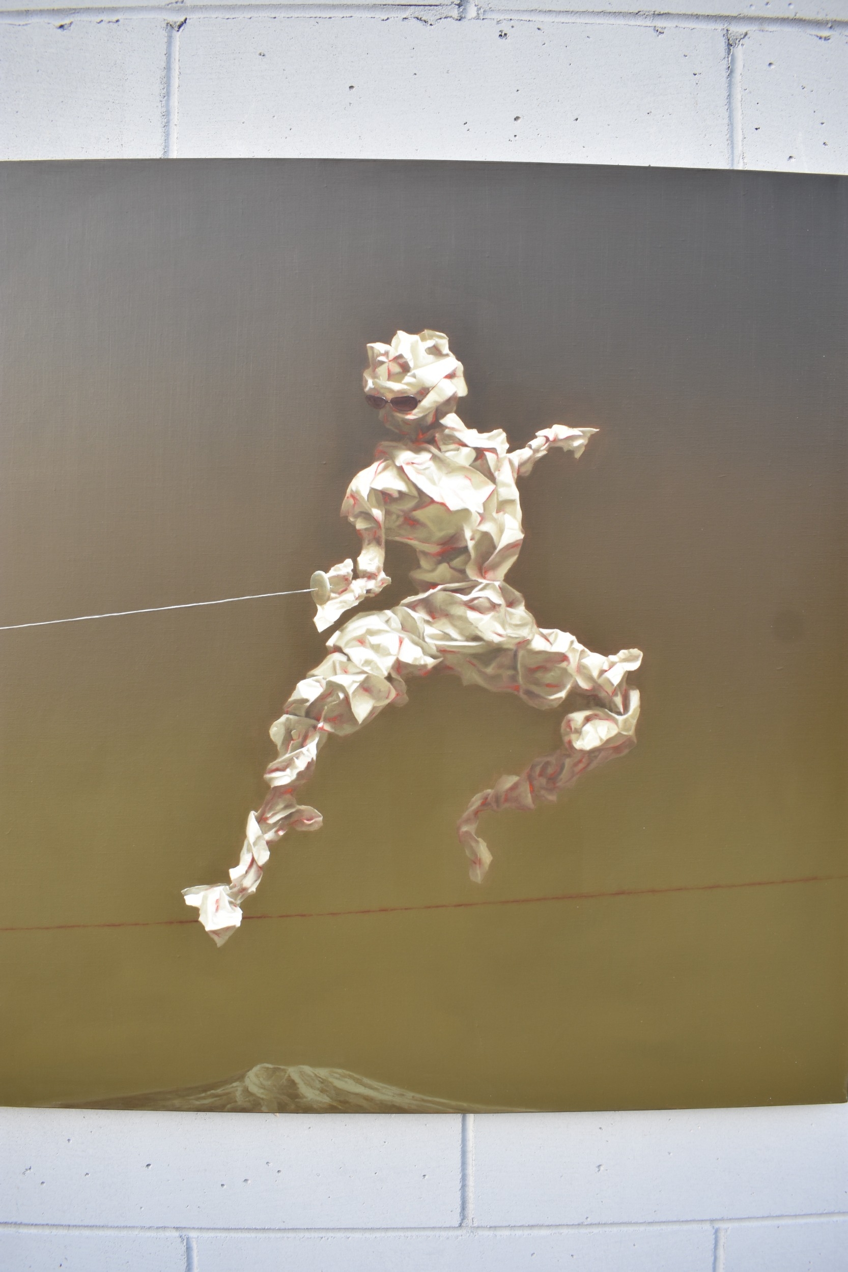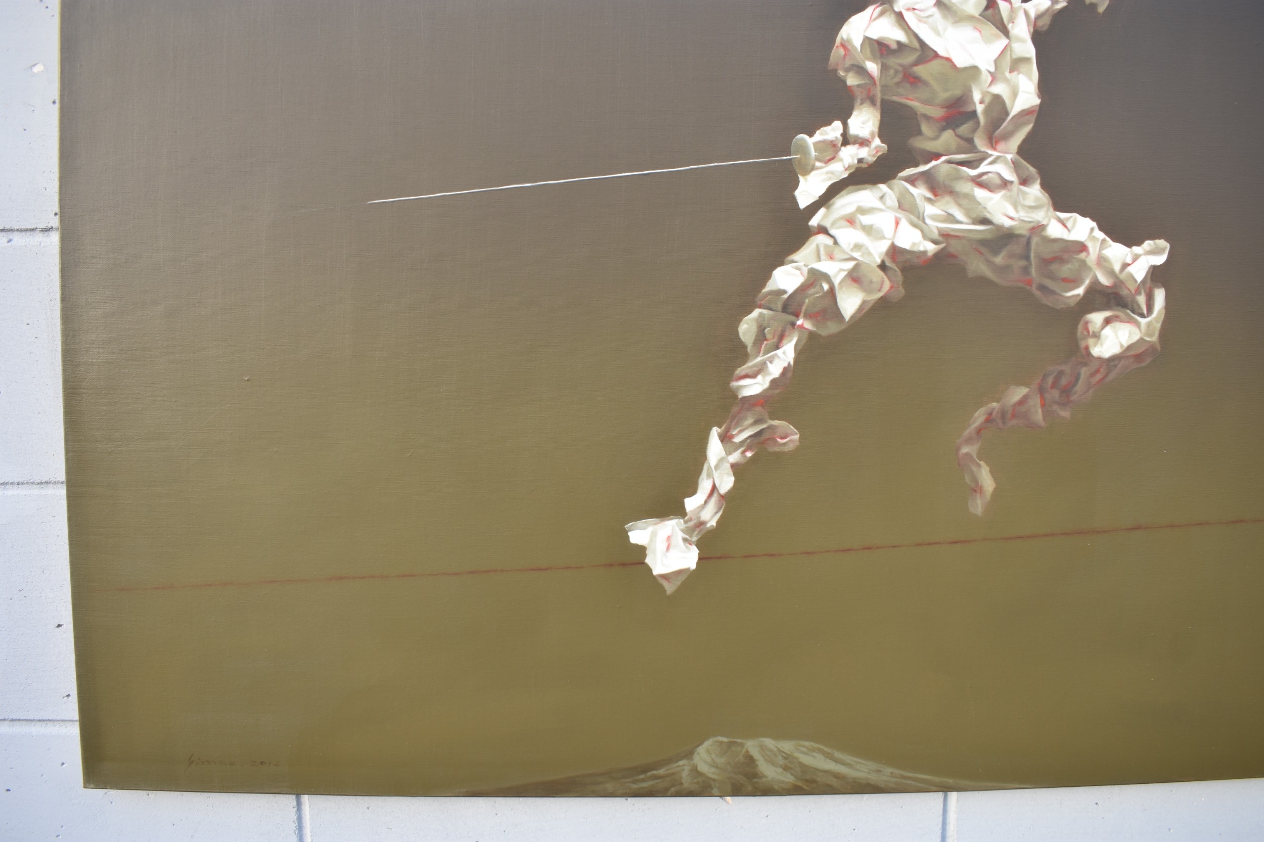 HUANG SIMAO (b.1967) Jingdezhen (China) Contemporary Artist: An oil painting from the "Edge of Reason" Series. The image uses paper as its subject matter. This painting takes the form of a figure wearing sunglasses fencing on a tight wire above a mountain top, dated 2012. It represents the fragility of life both psychologically and physically. 100.5cm x 121cm