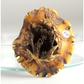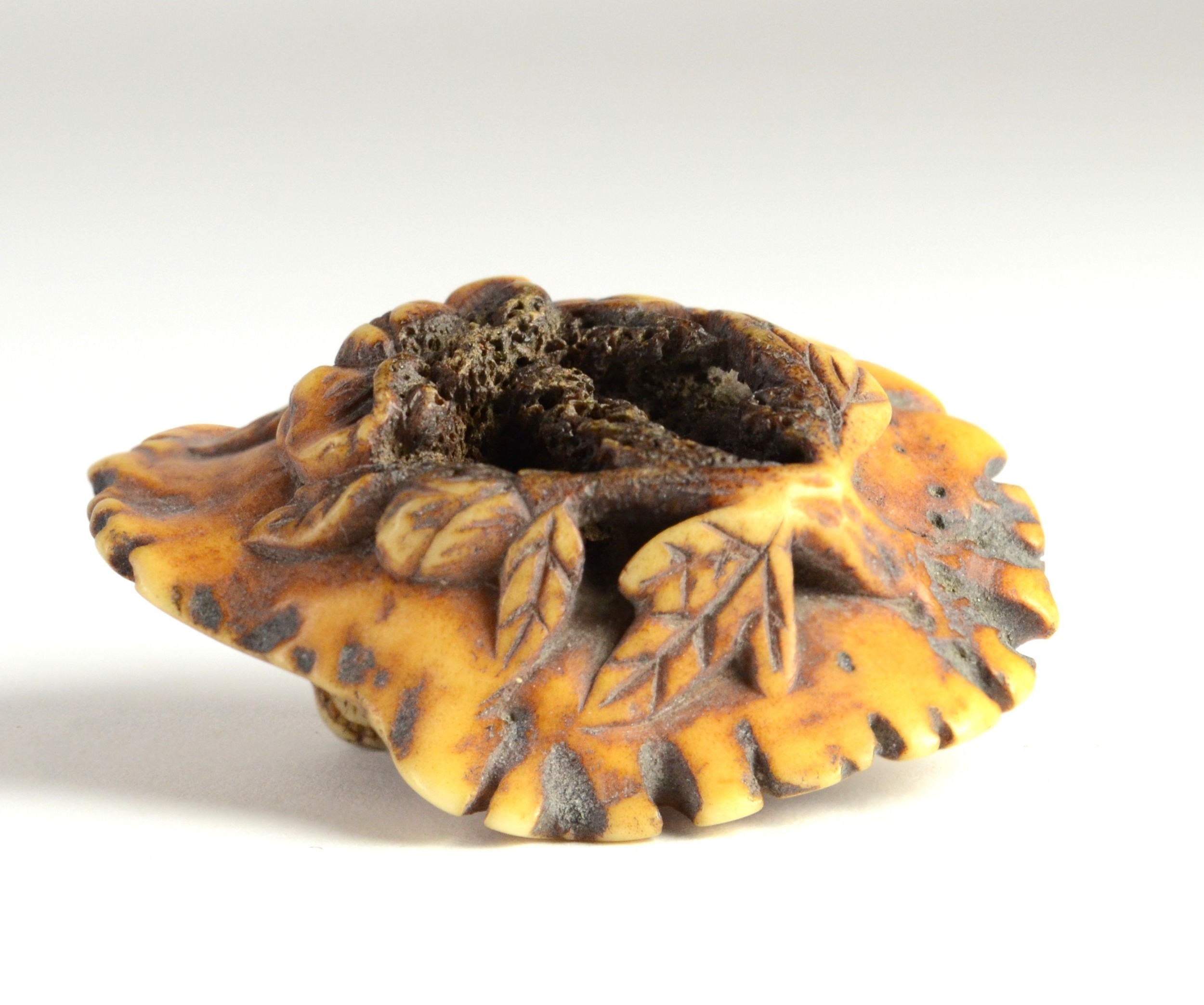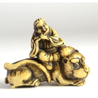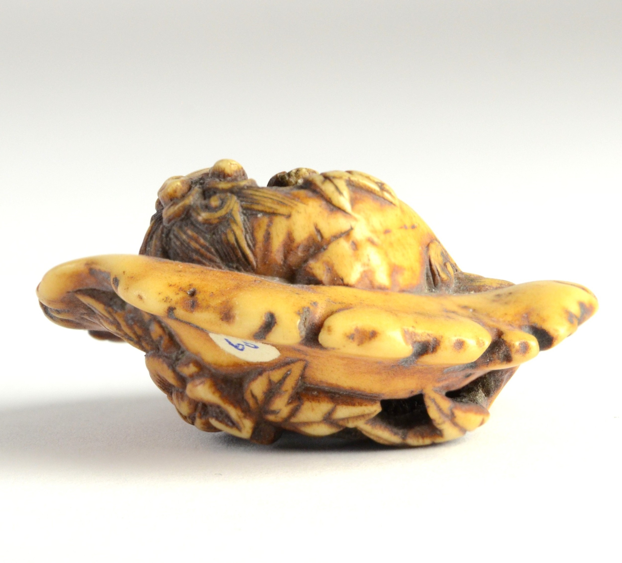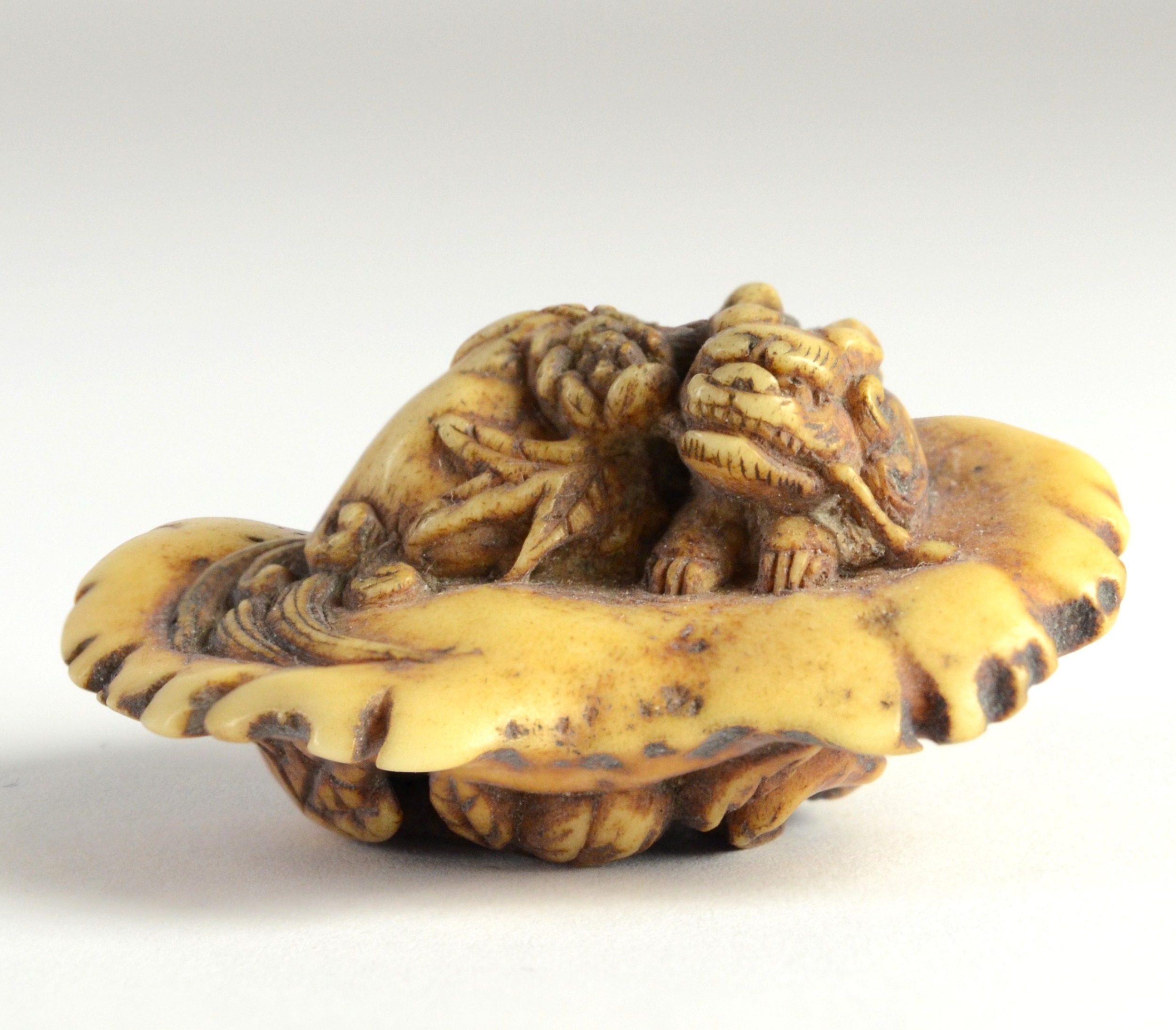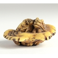 A manju stag horn netsuke of a dragon reclining on a platform, carved beneath with flowers4.5cm wide x 1.7cm highProvenanceDorothy Ann Stevens Collection no.65