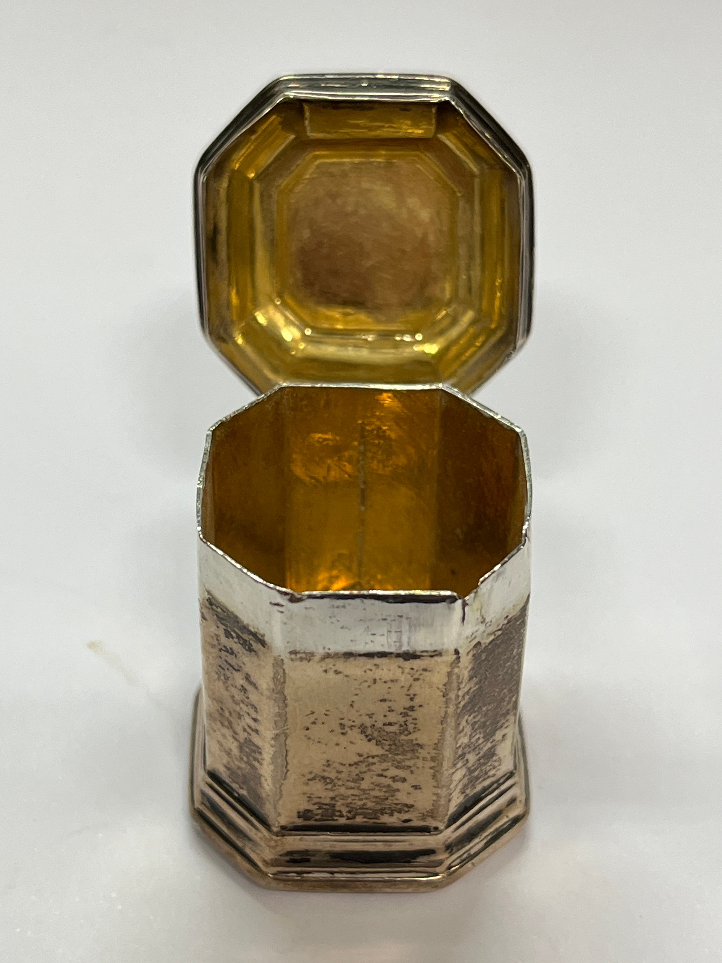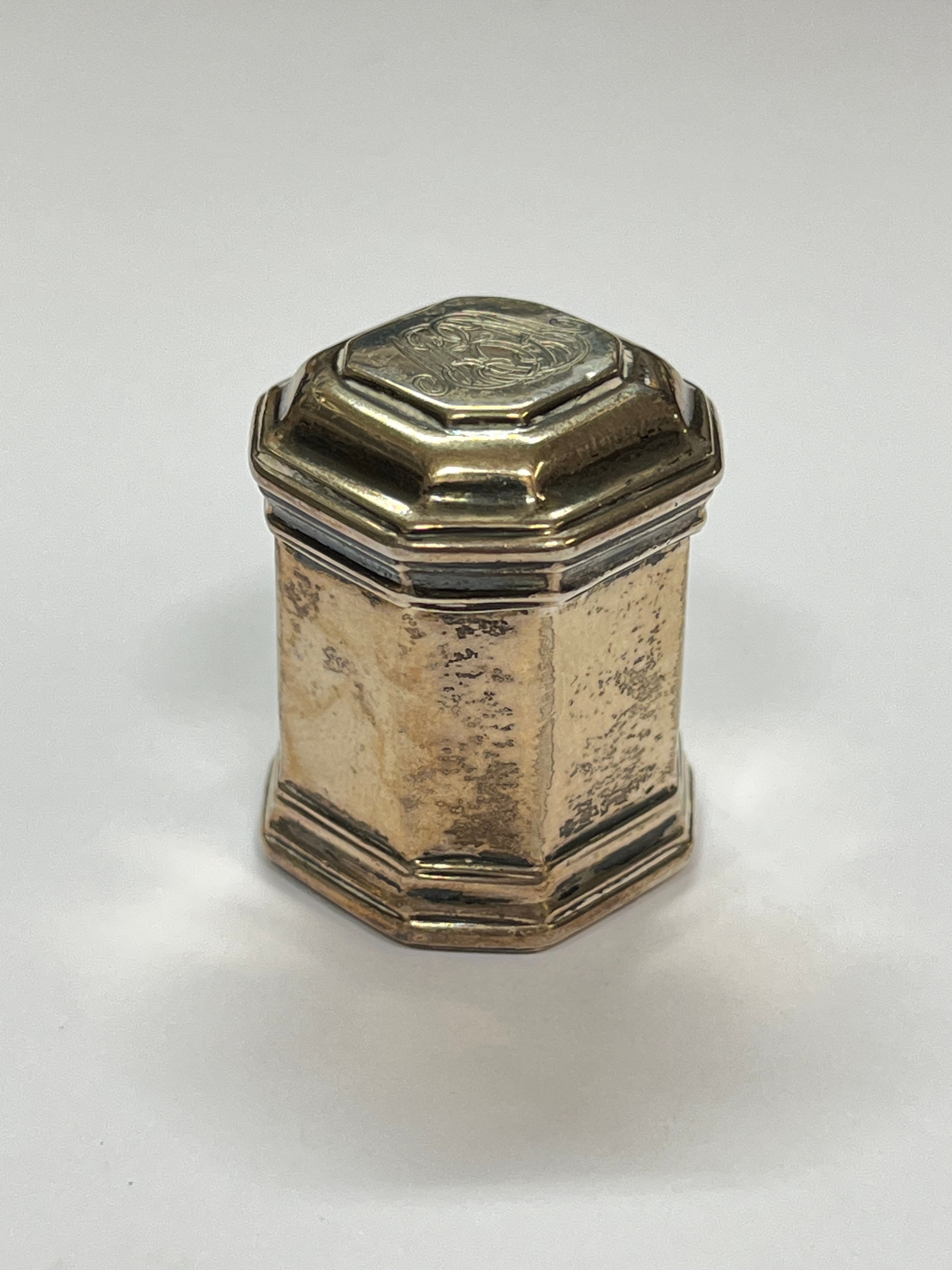 A Georgian silver Lodderein box (viniagrette), canted square form with monogram to lid, initialled C.V to underside, 3.2cm x 2.5cm x 2.5cm