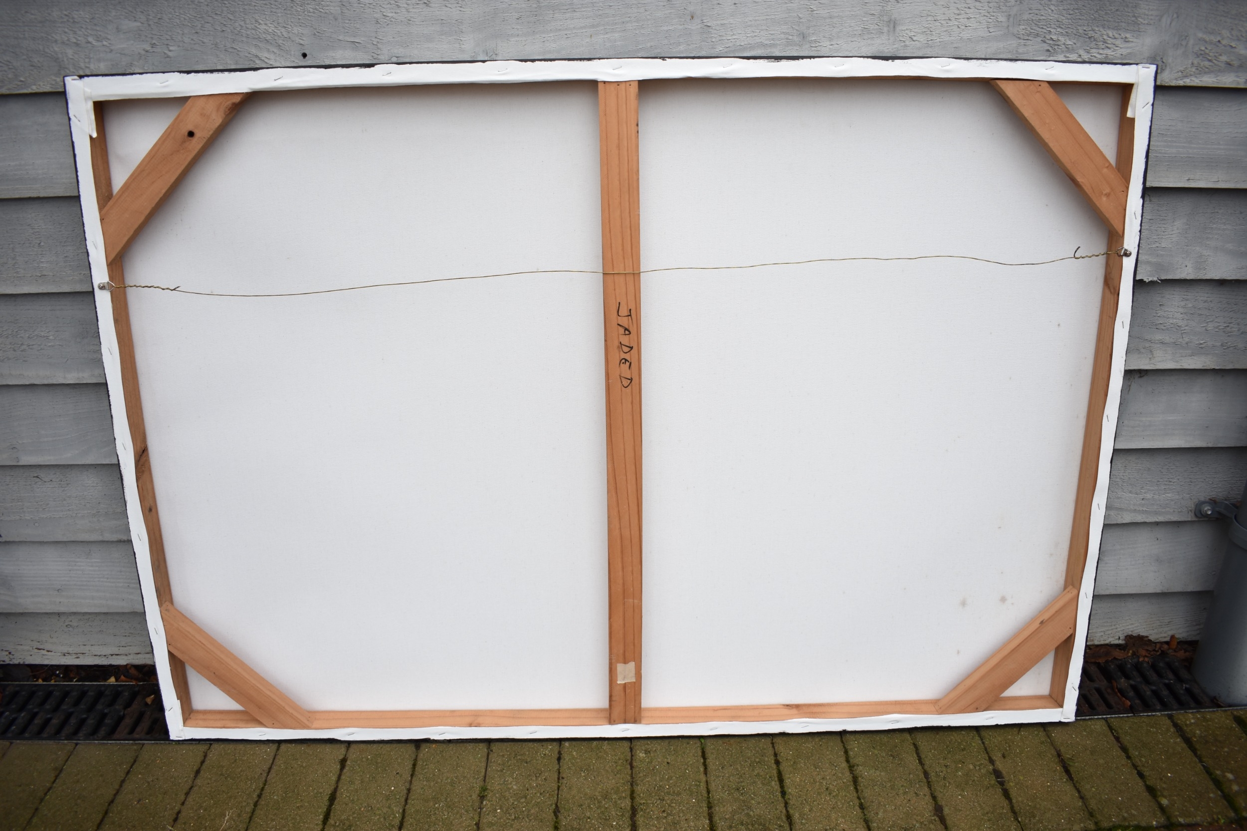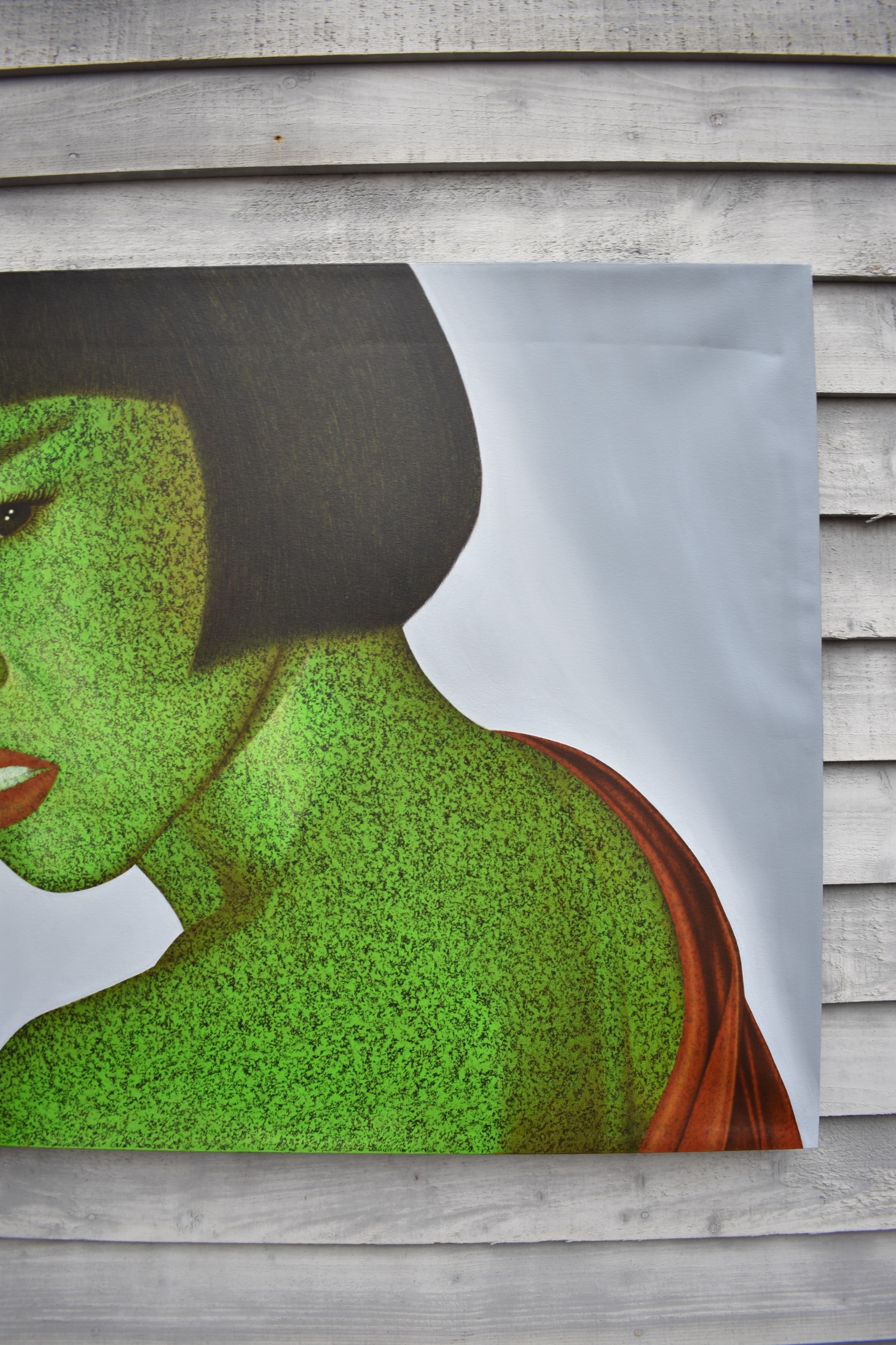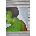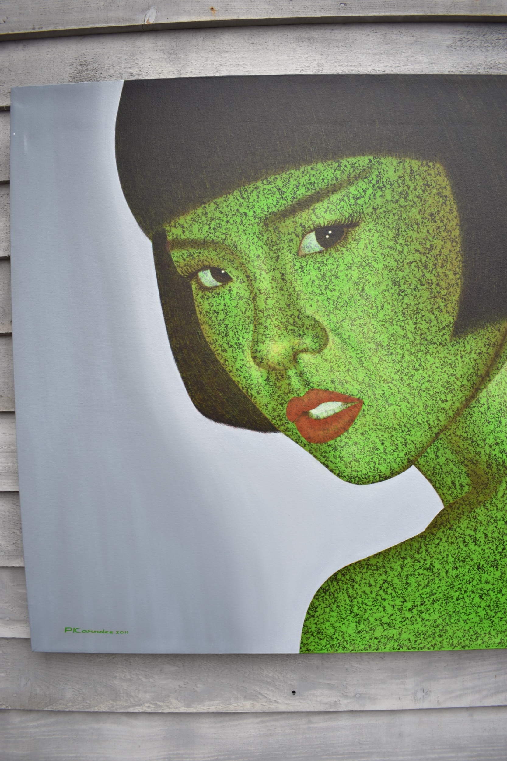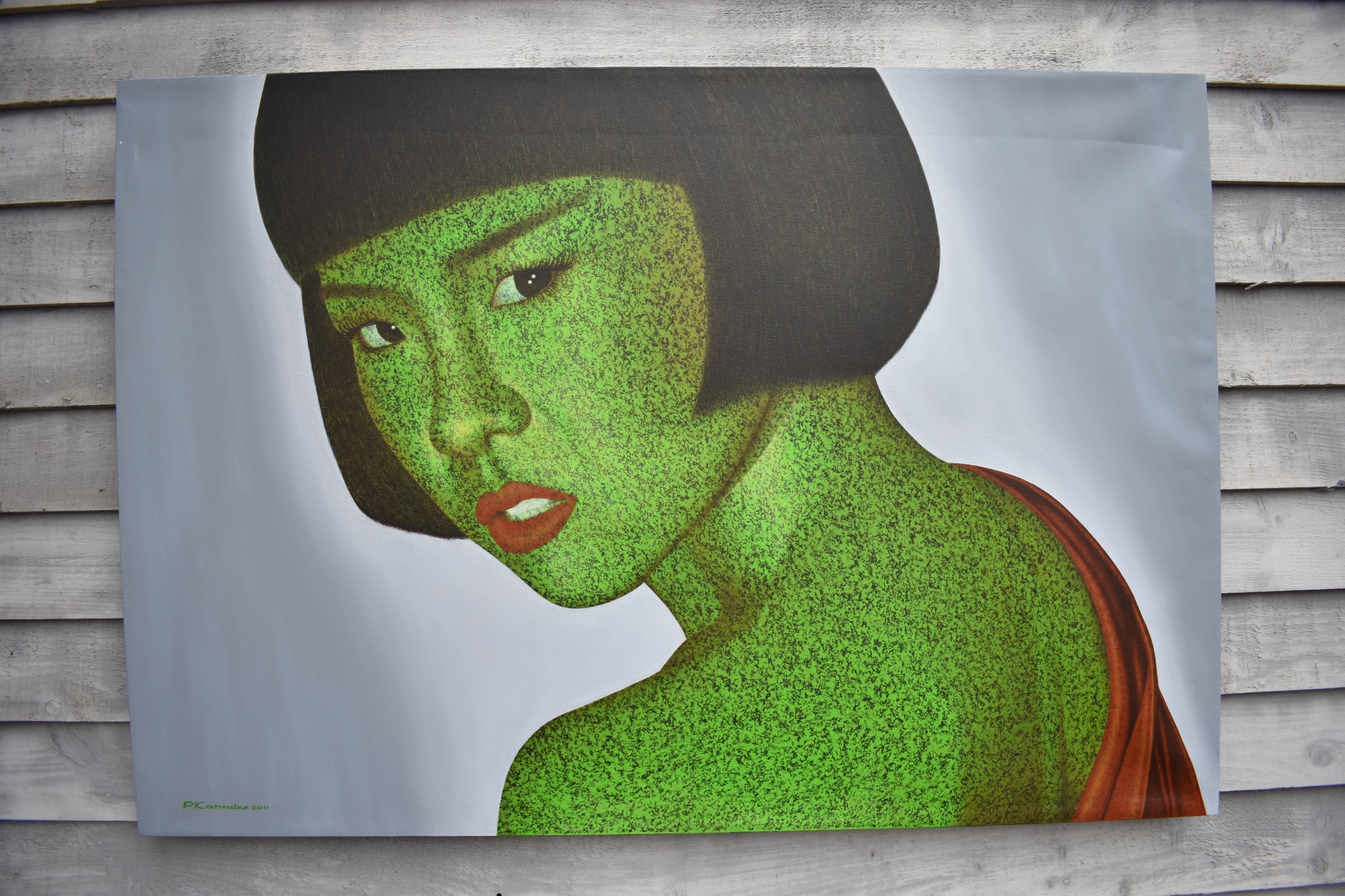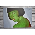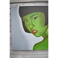 PAIROJ KARNDEE Thai Contemporary Artist: Portrait titled "Jaded" in greens and grey of female looking back over her shoulder wearing a loose garment with bobbed hair, acrylic on canvas. The artist has been influenced by the mysterious Apsaras - the celestial maidens of ancient Asian culture depicted in the galleries of Cambodia's Angkor Wat. His techniques painstakingly recreate the stone textures of those images with a time-consuming rendering of acrylic on linen canvas. His figures show a notable range of emotions. Signed and dated, 2011, 90cm x 130cm