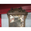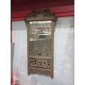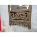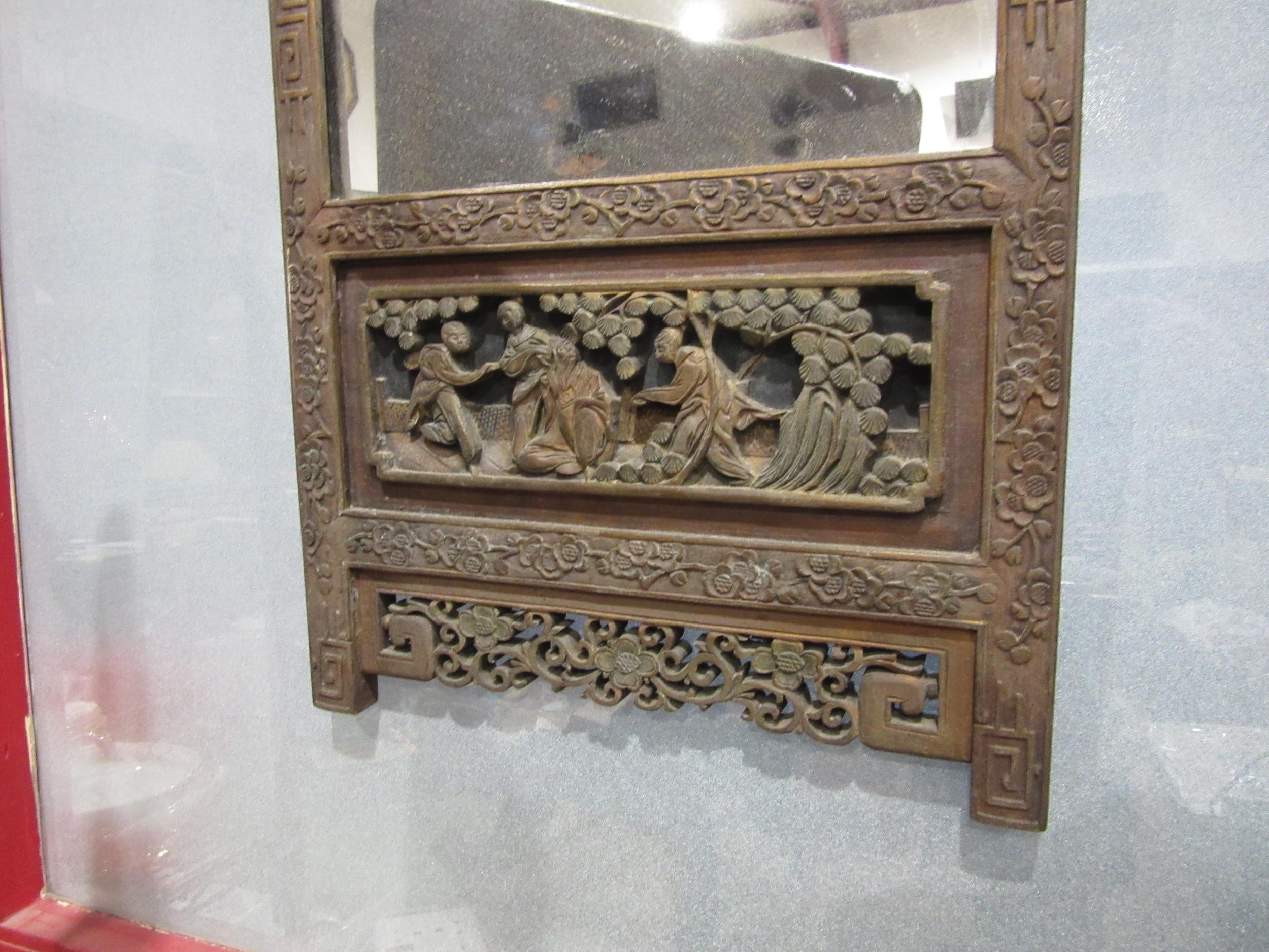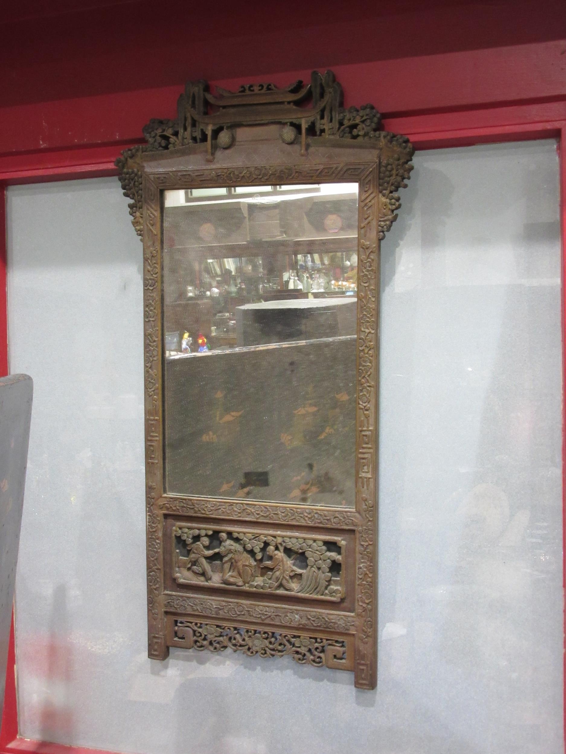 A rectangular carved Chinese wall hanging mirror with building to top and carved figures below, frame decorated with cherry blossom, 86cm x 45cm total