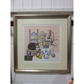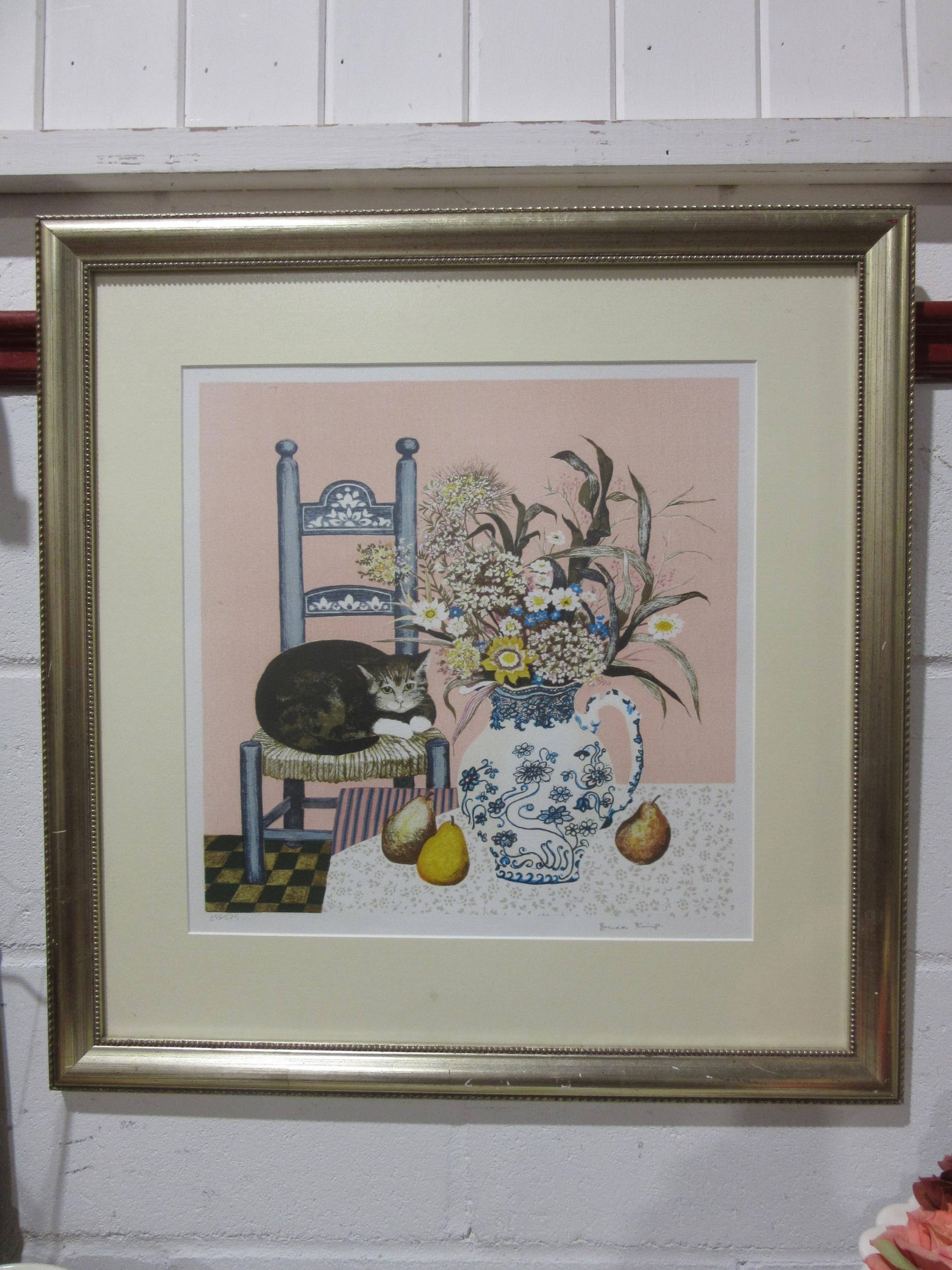 BRENDA KING (XX): A limited edition print, still life of cat resting on chair beside jug of flowers, no. 256/275, framed and glazed, 43cm x 43cm image size