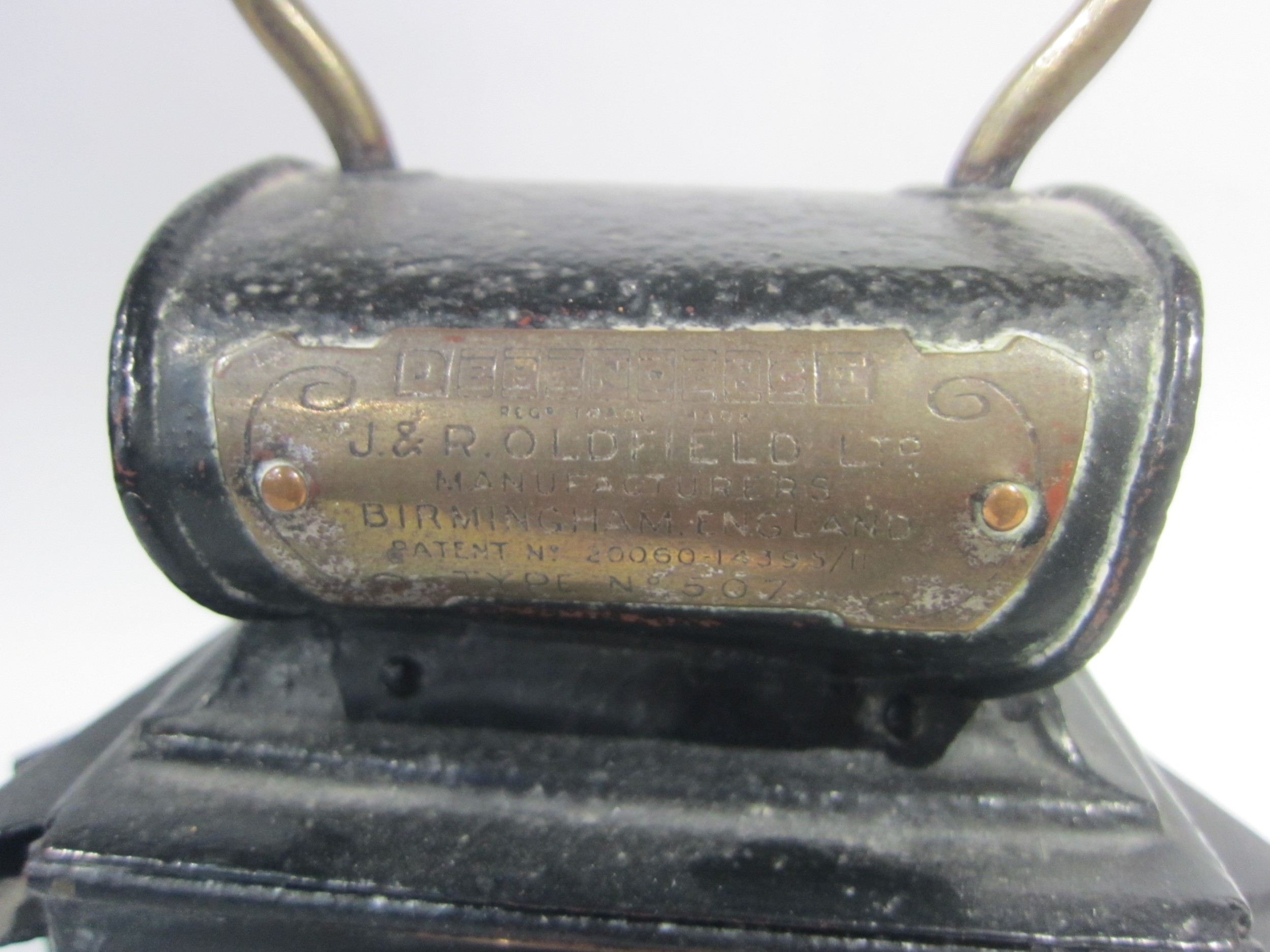 A metal and brass J&R Oldfield Ltd three aspect lantern