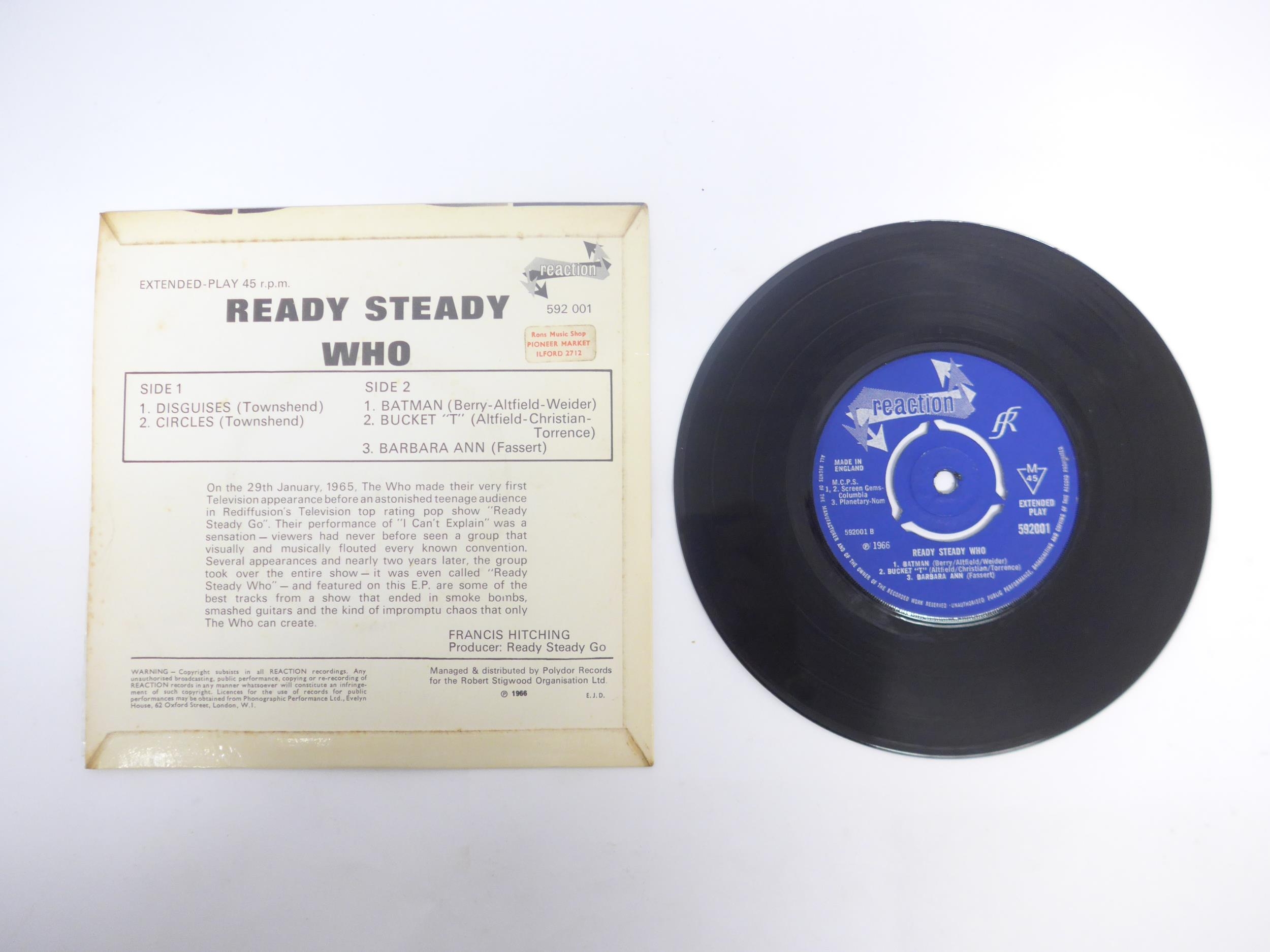 THE WHO: 'Ready Steady Who' EP, original 1966 UK pressing in flipback picture sleeve (Reaction 592 001, vinyl and sleeve VG+ with original shop sticker to back cover). Together with four 7" singles to include 'Happy Jack' (Reaction 59101), 'Substitute' (Polydor 2058 803), 'Pinball Wizard' (Track Record 60402) and 'I Can't Explain' 1973 US reissue (MCA-60110) (5, vinyl VG-VG+)