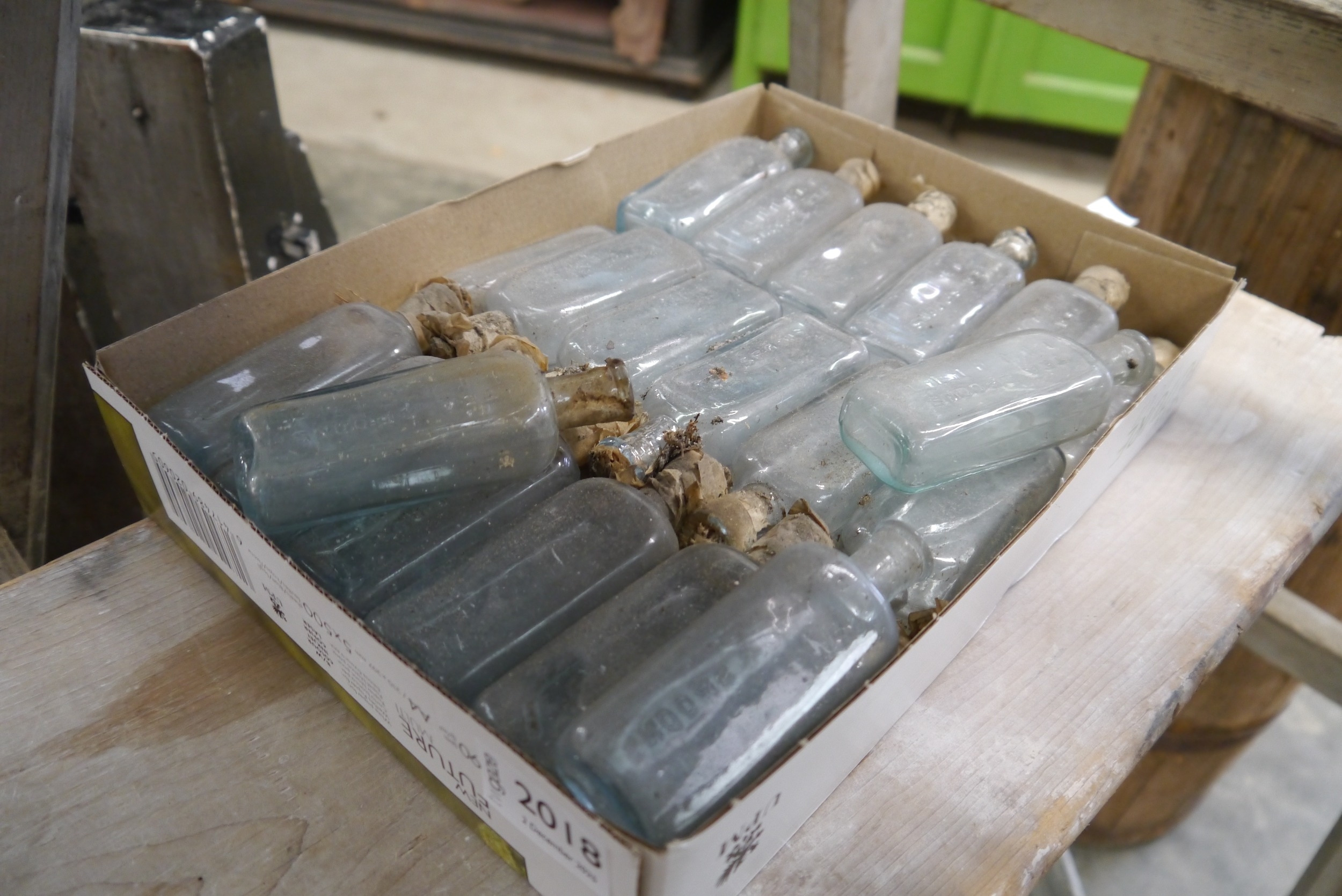 A box of approx. 35 vintage glass teaspoon measure bottles