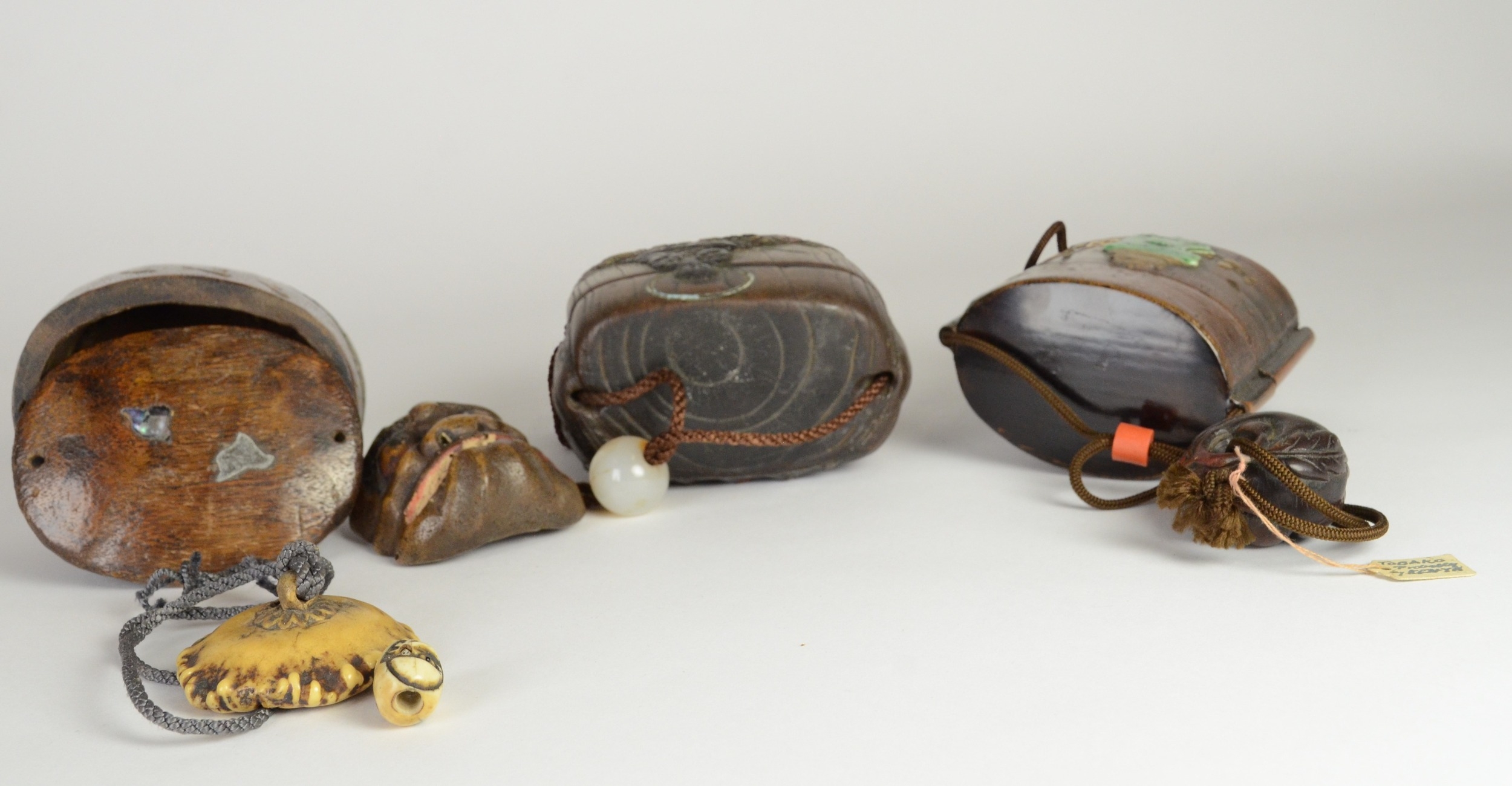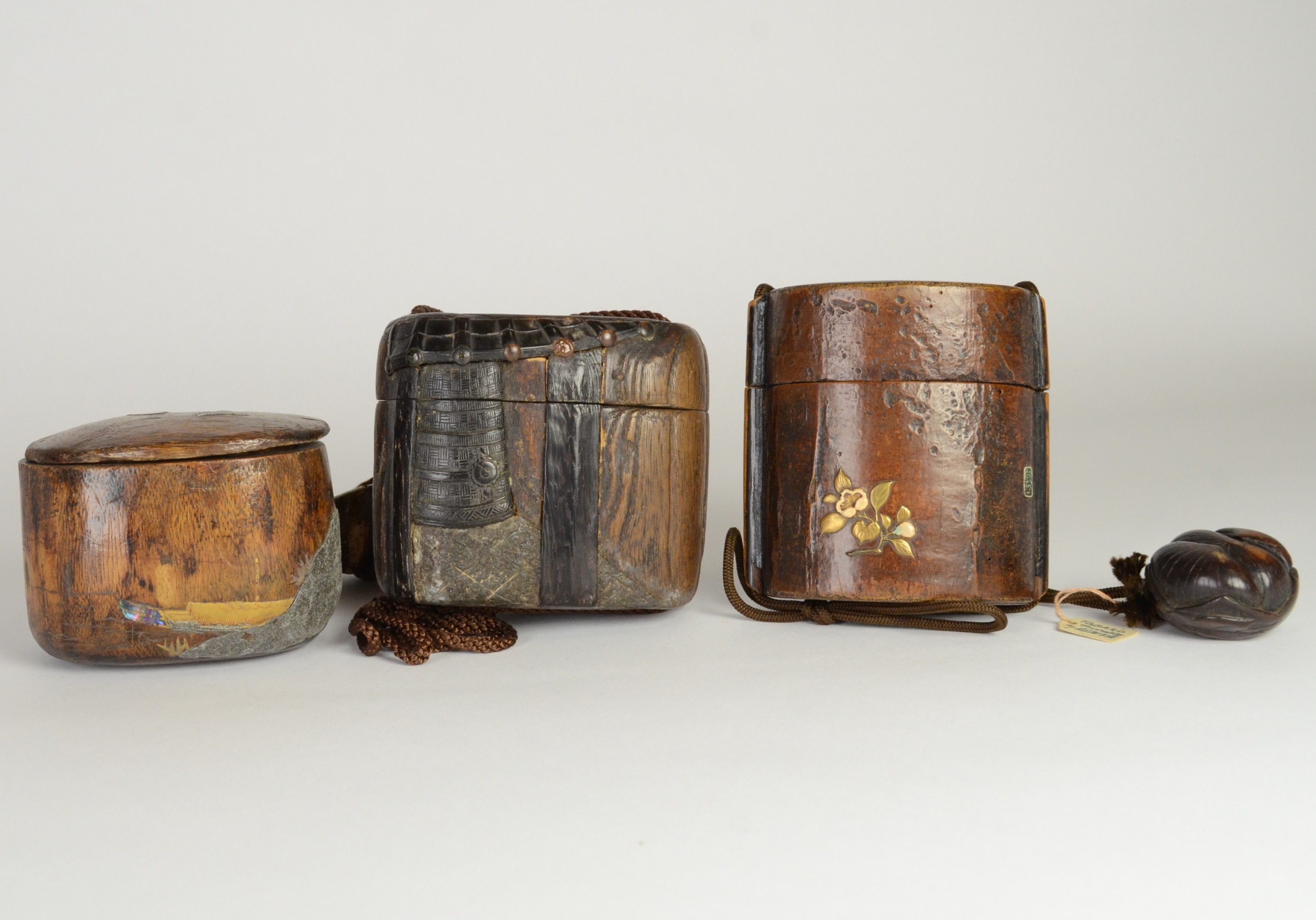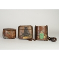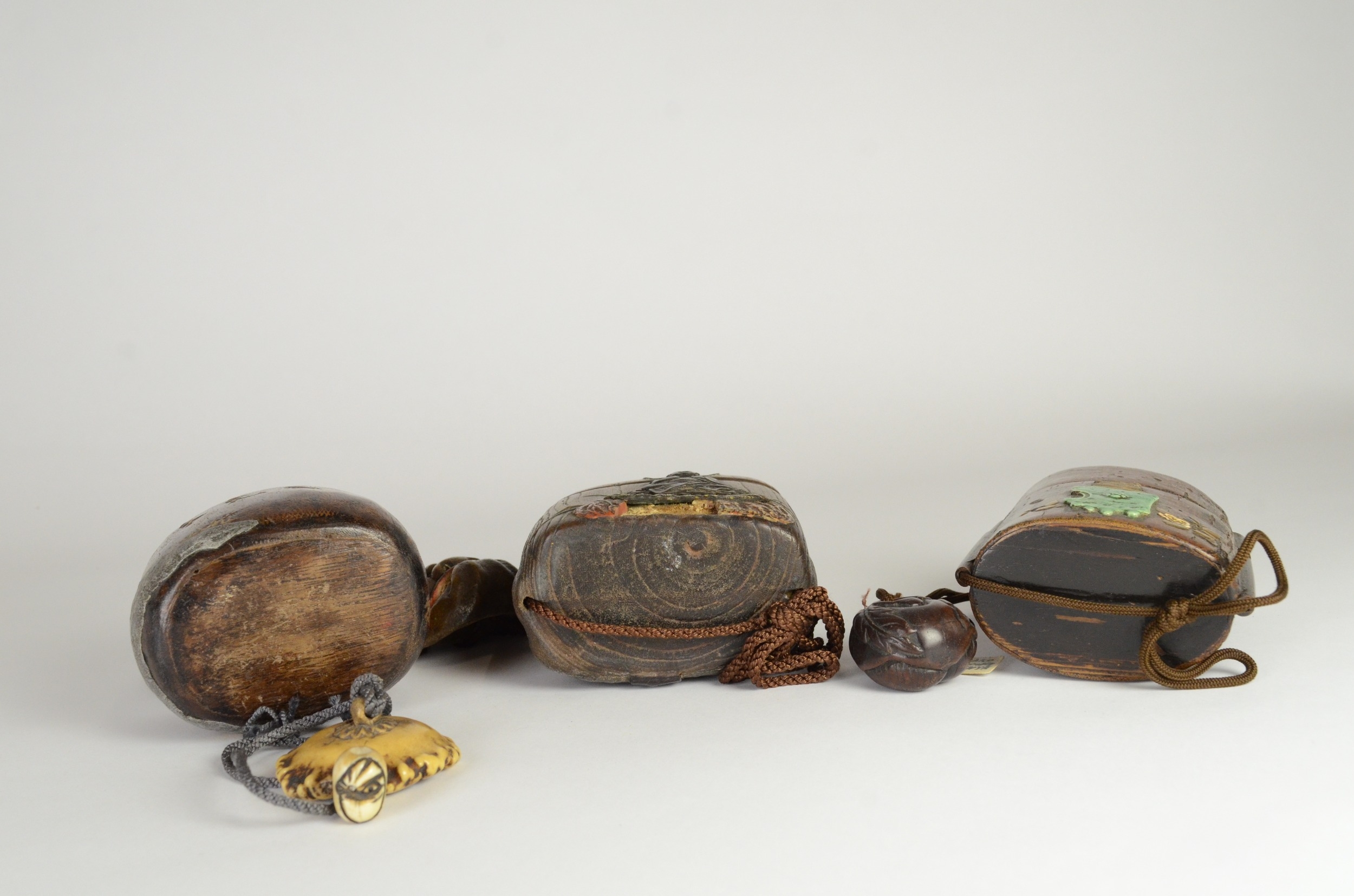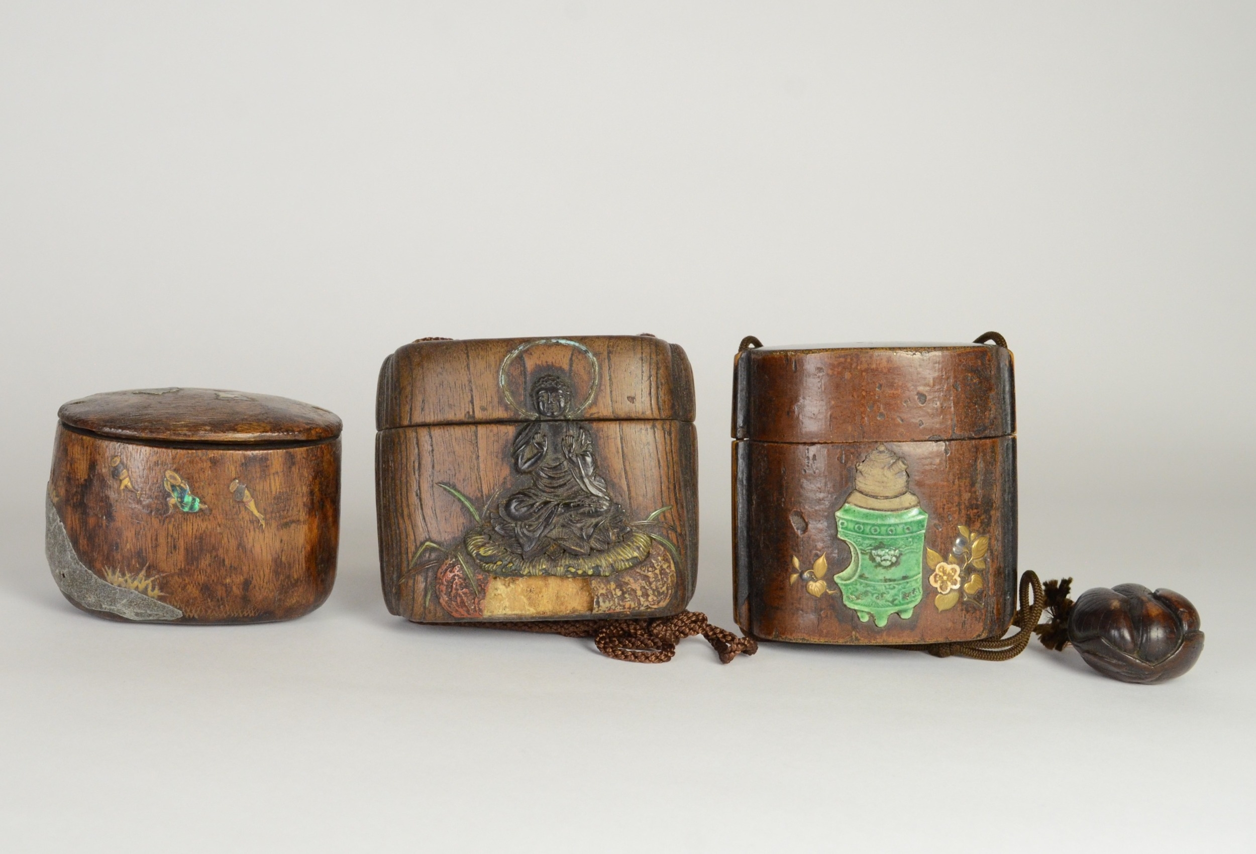A wood Tonkotsu (tobacco box) depicting buddha and two others (3)Tallest 9cmProvenanceHenry Potter Stevens collection no 724 & 564Ivory ref no-FMP6YSKL