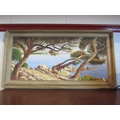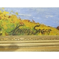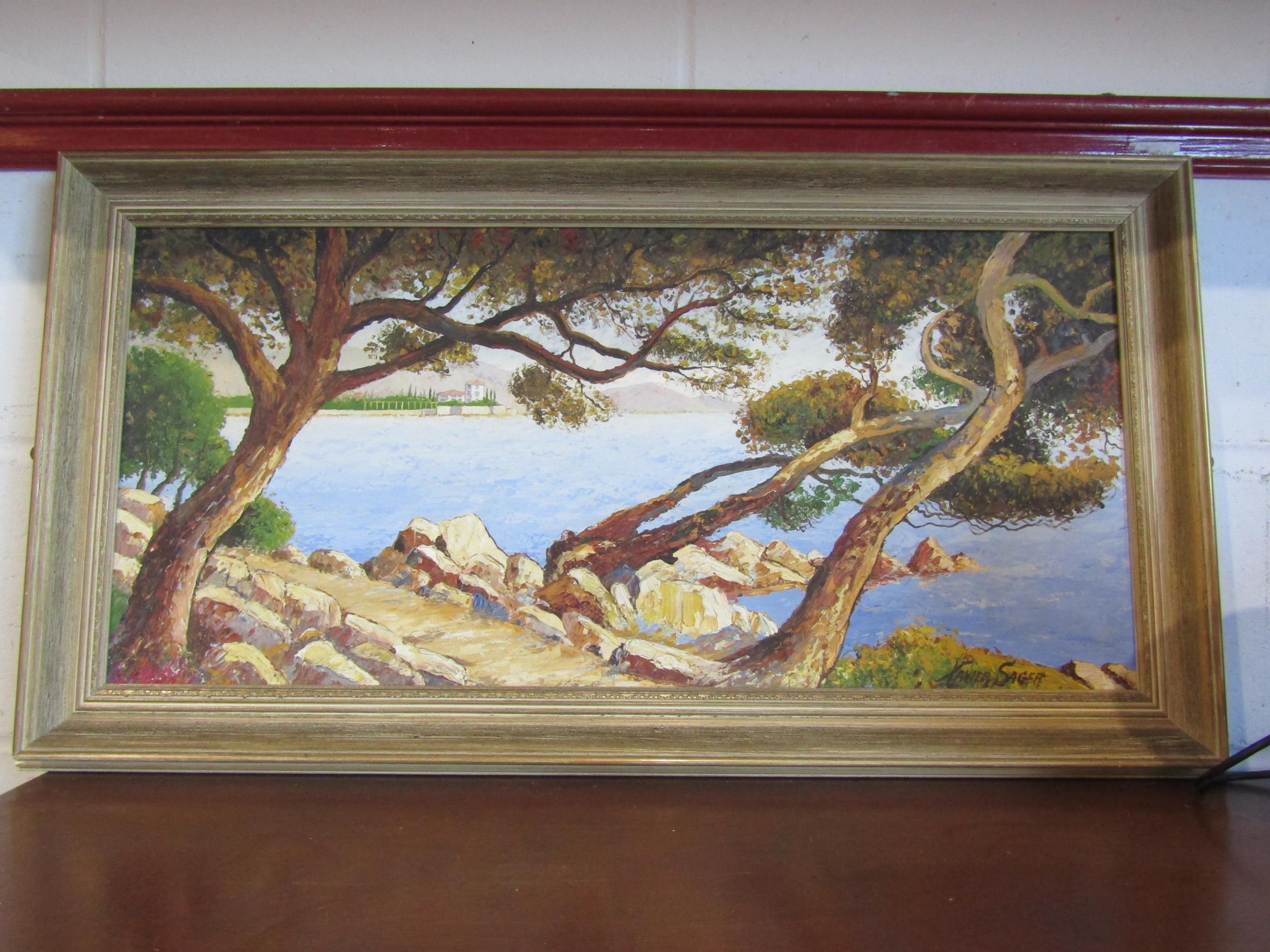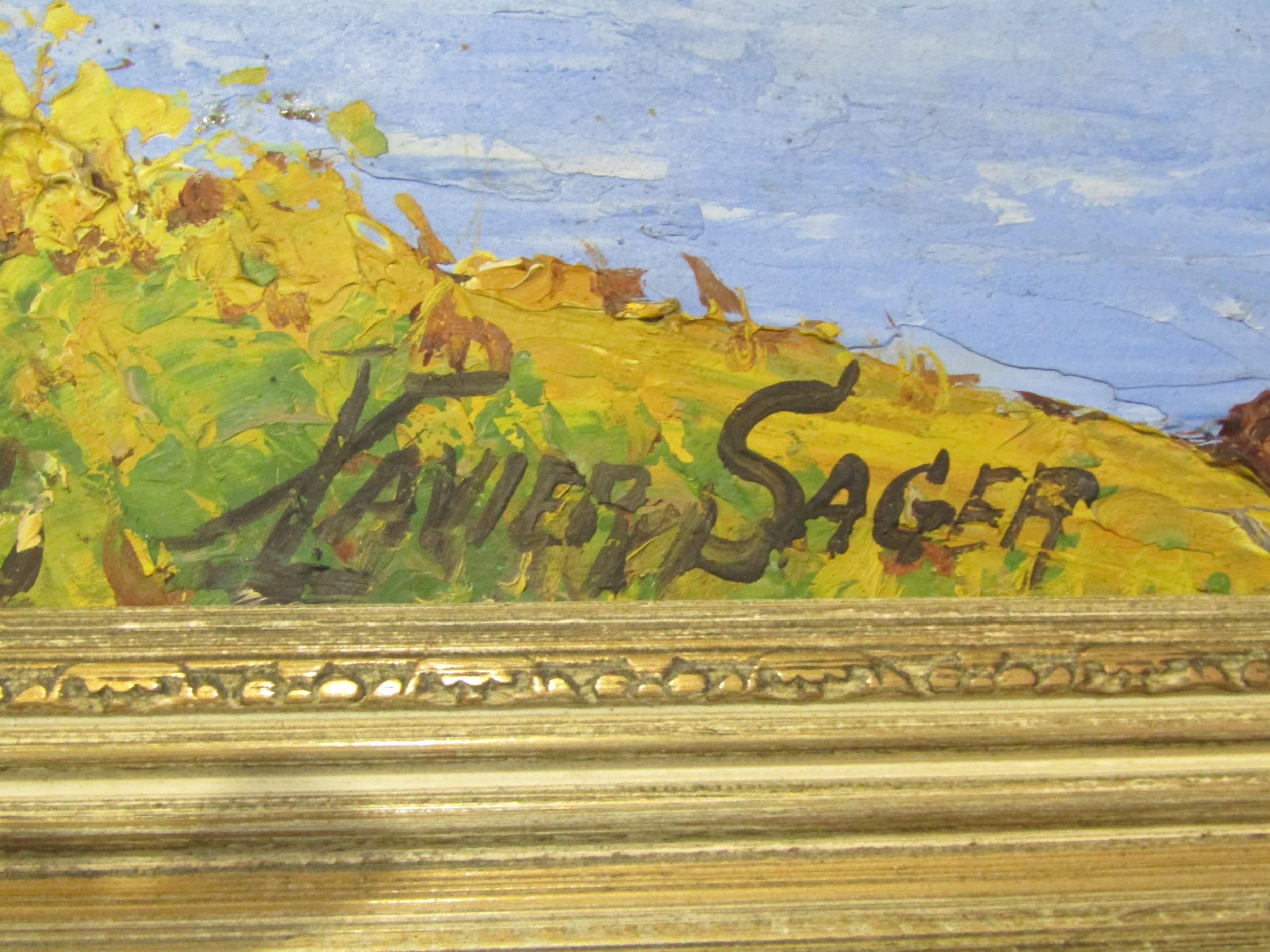 XAVIER SAGER: An oil on board depicting a European coastal scene, trees to the foreground and a house with hills to background, signed lower right, framed, 33cm x 72cm image size