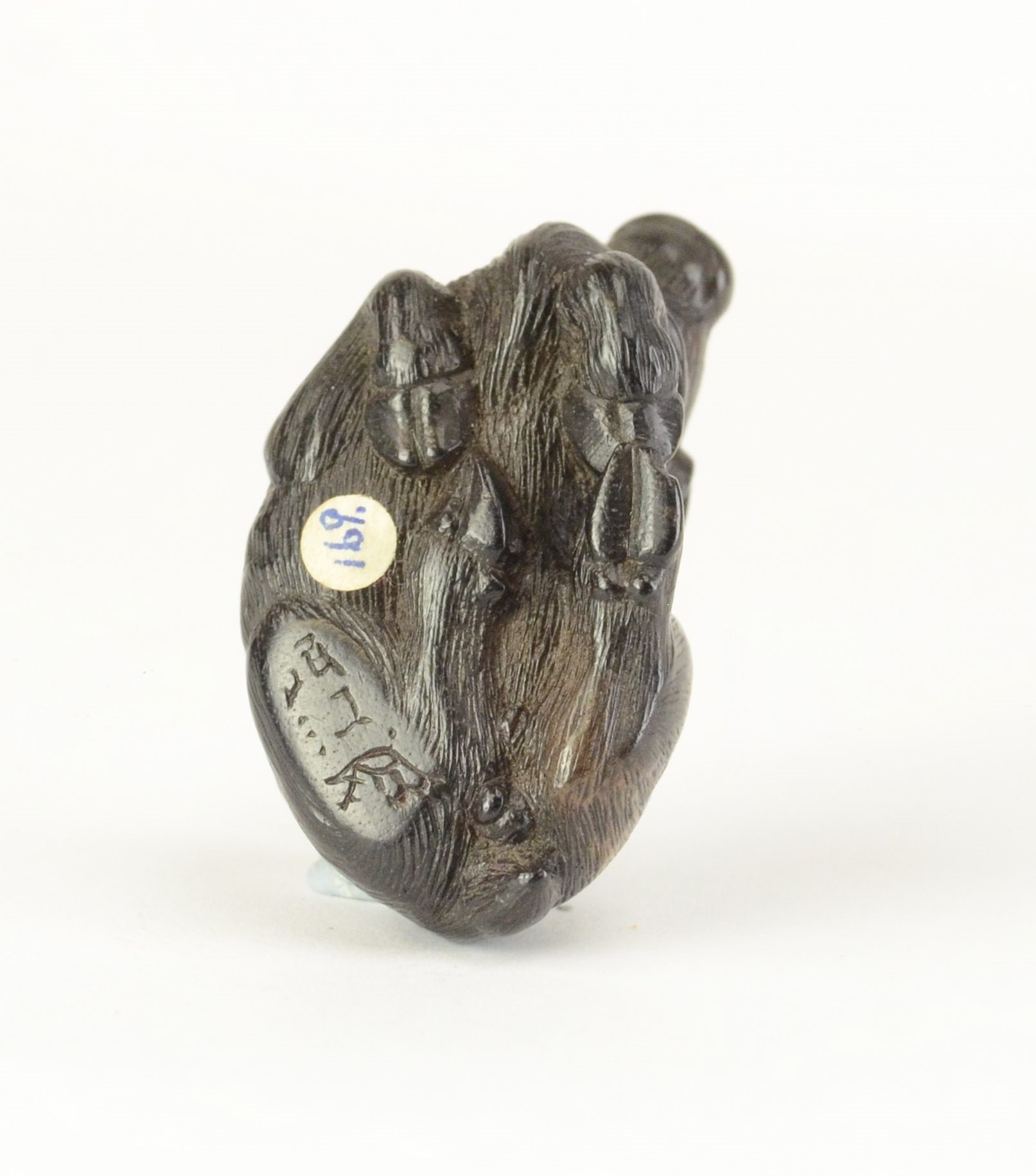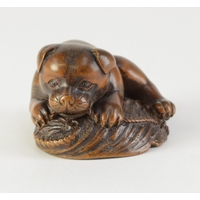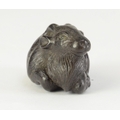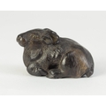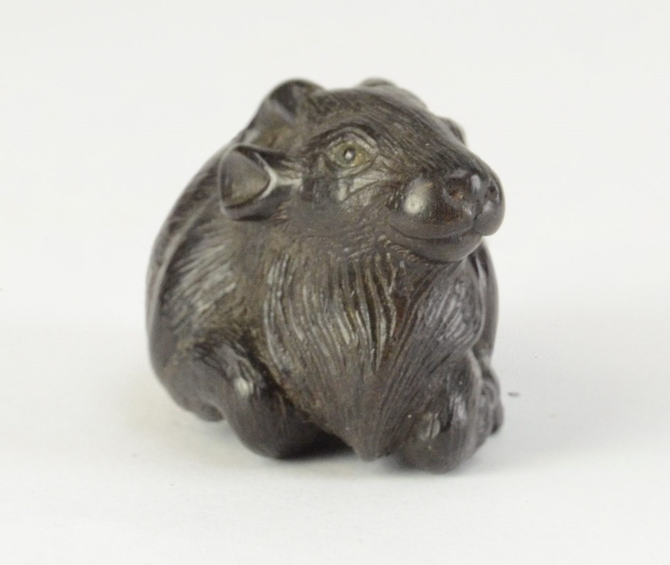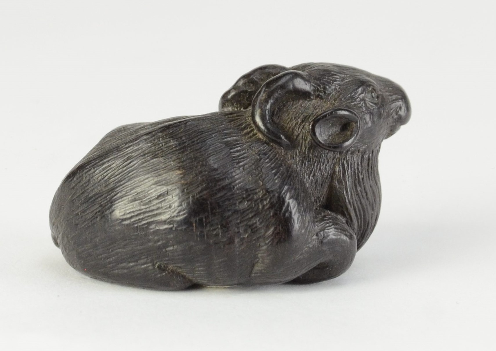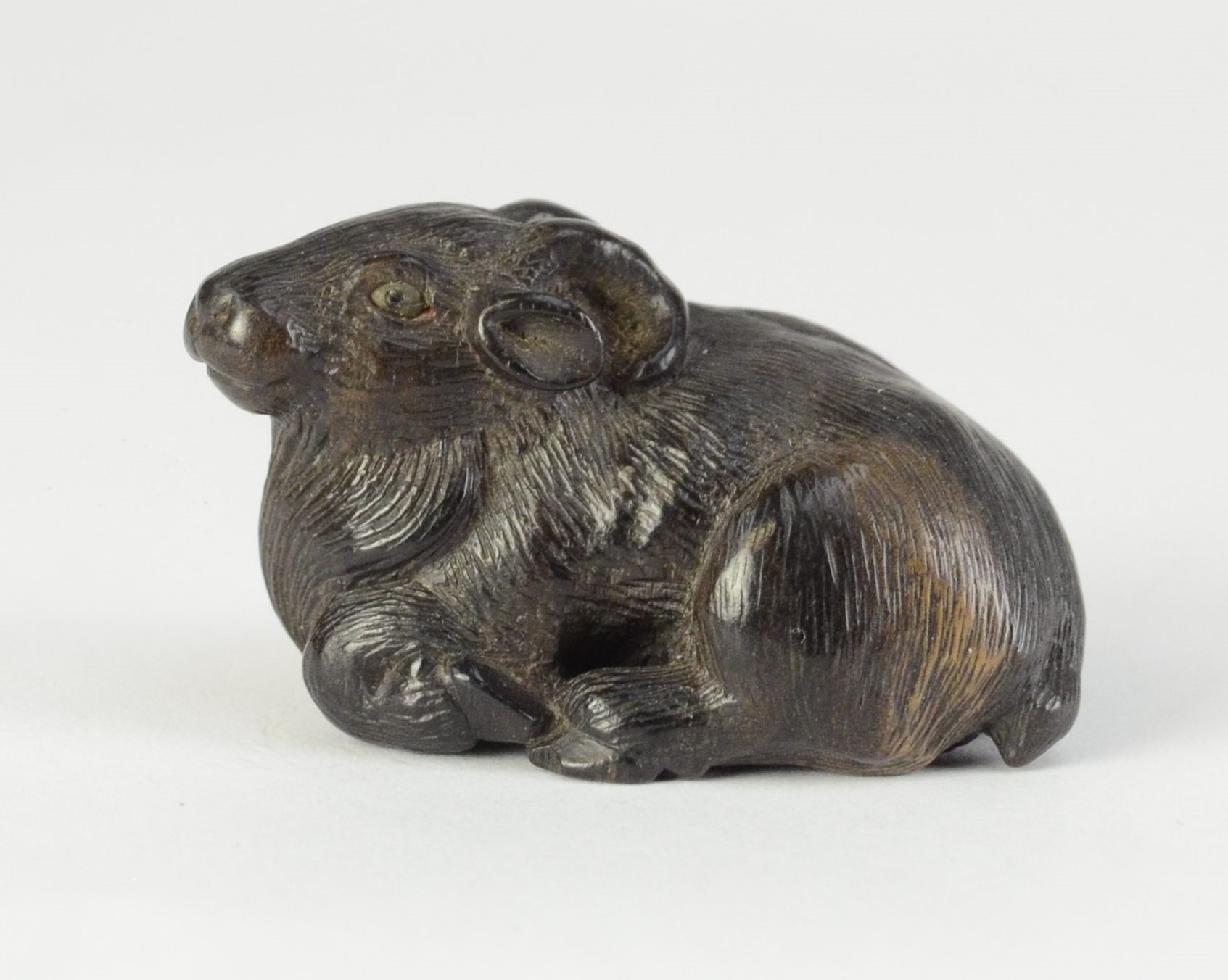 MINKO a carved persimmon wood netsuke in the form of a recumbent goat, signed Minko to base4cm wide, 2.8cm deep and 2.6cm highProvenanceDorothy Ann Stevens Collection no. 391Bought from Norton 21/1/53