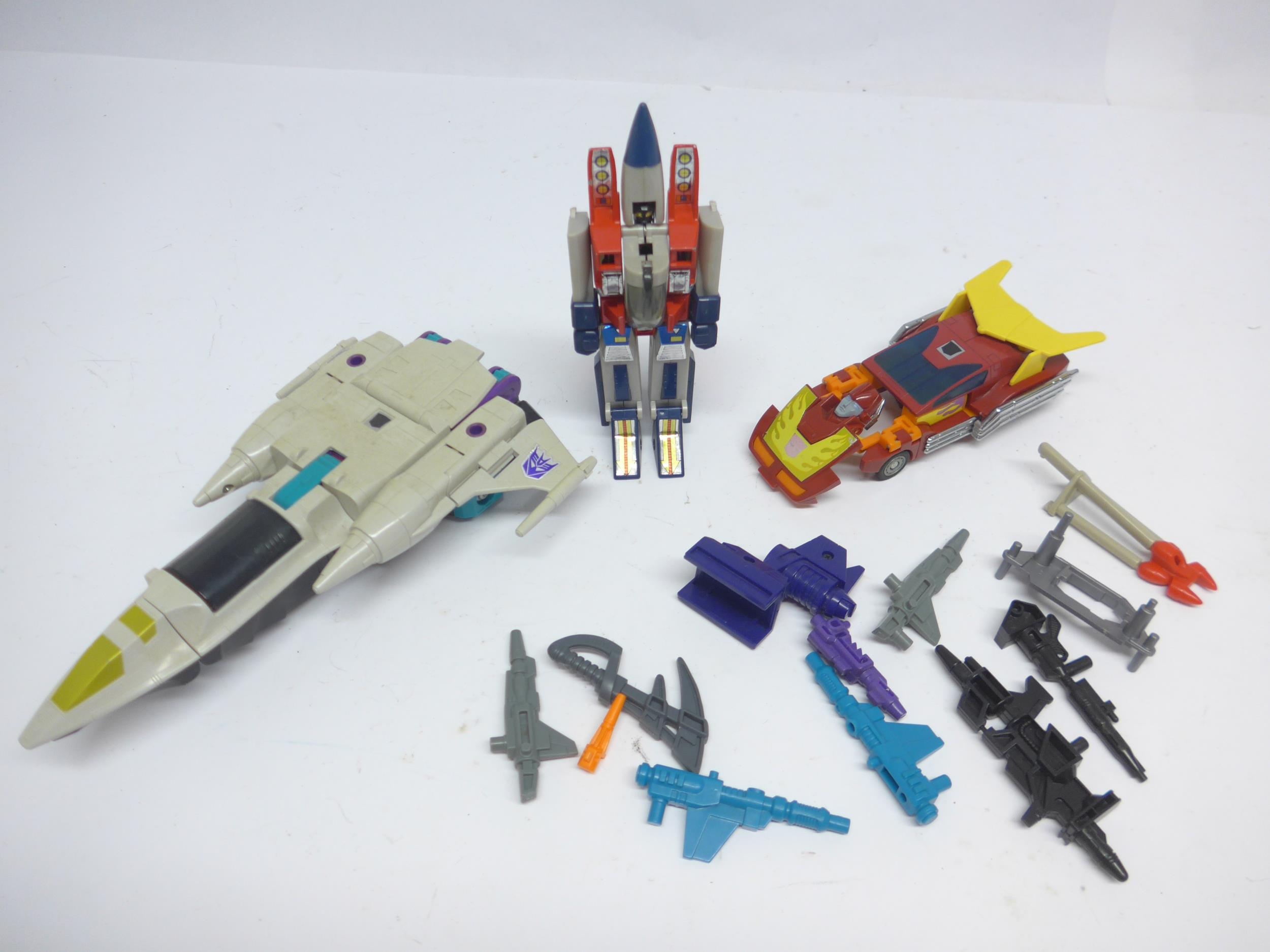 A collection of loose Hasbro/Takara vintage G1 Transformers including Scorponrok, Apeface, Joyride, Landfill Targetmaster, Starscream, Headmaster Snapdragon, Hot Rod, etc. (unchecked for completeness)