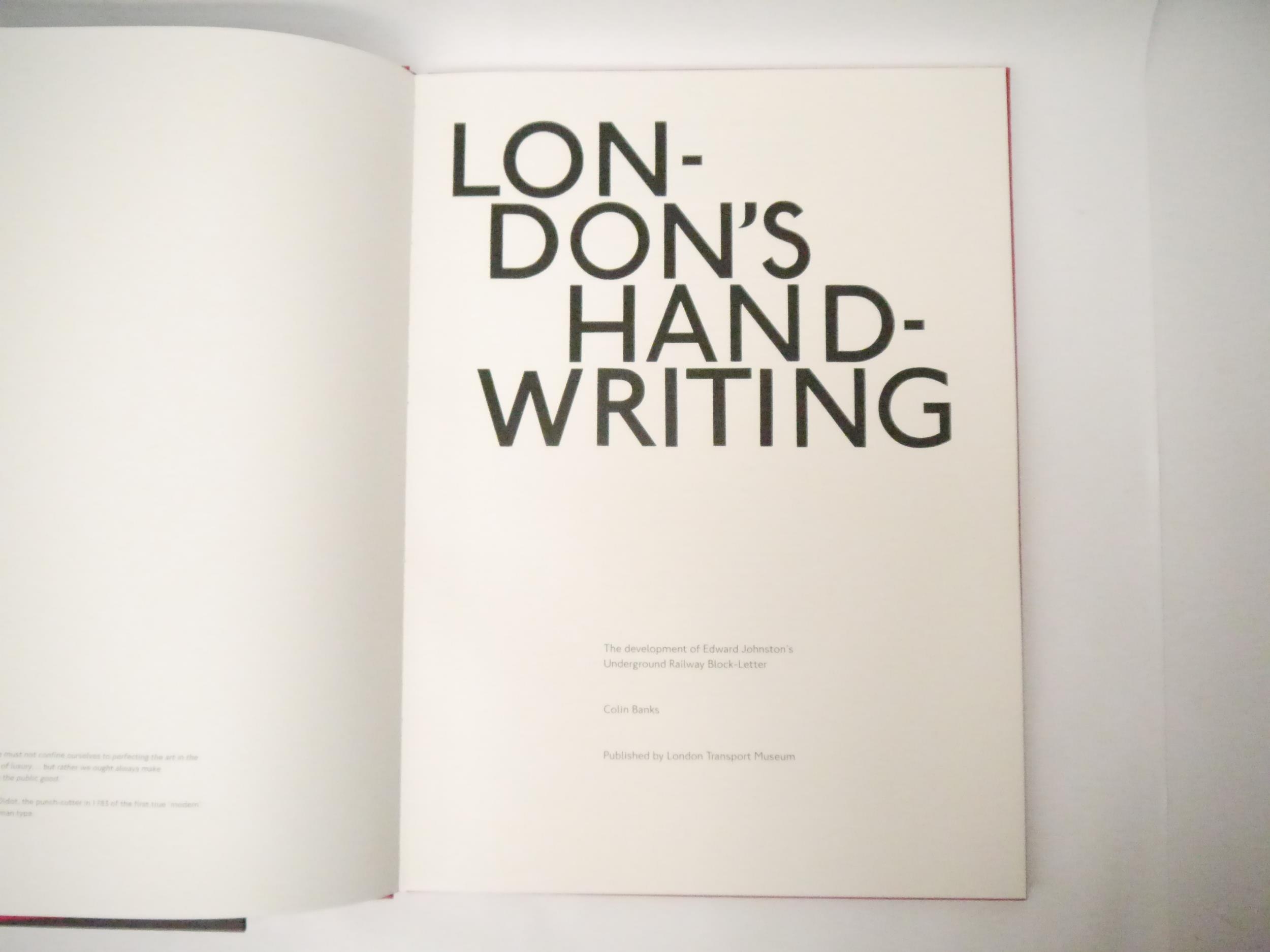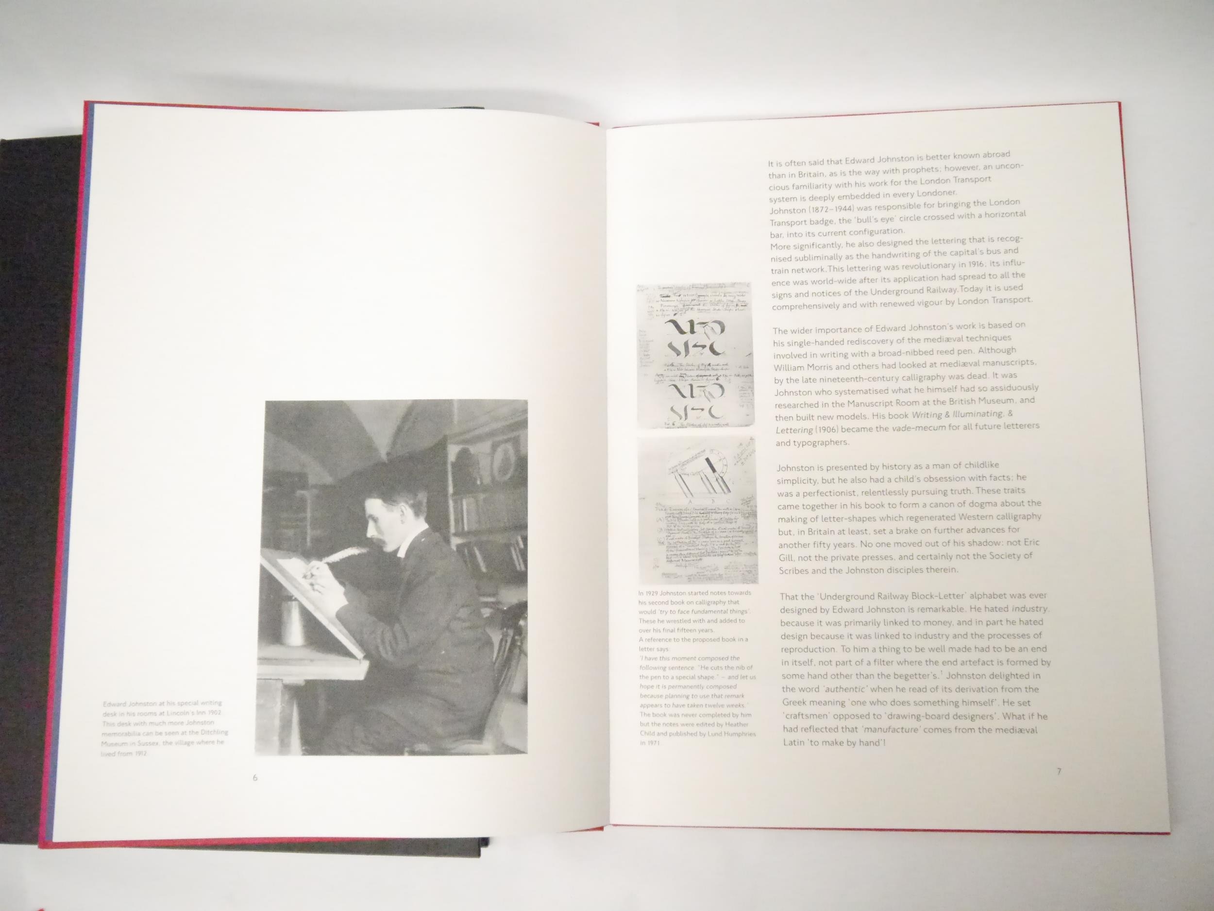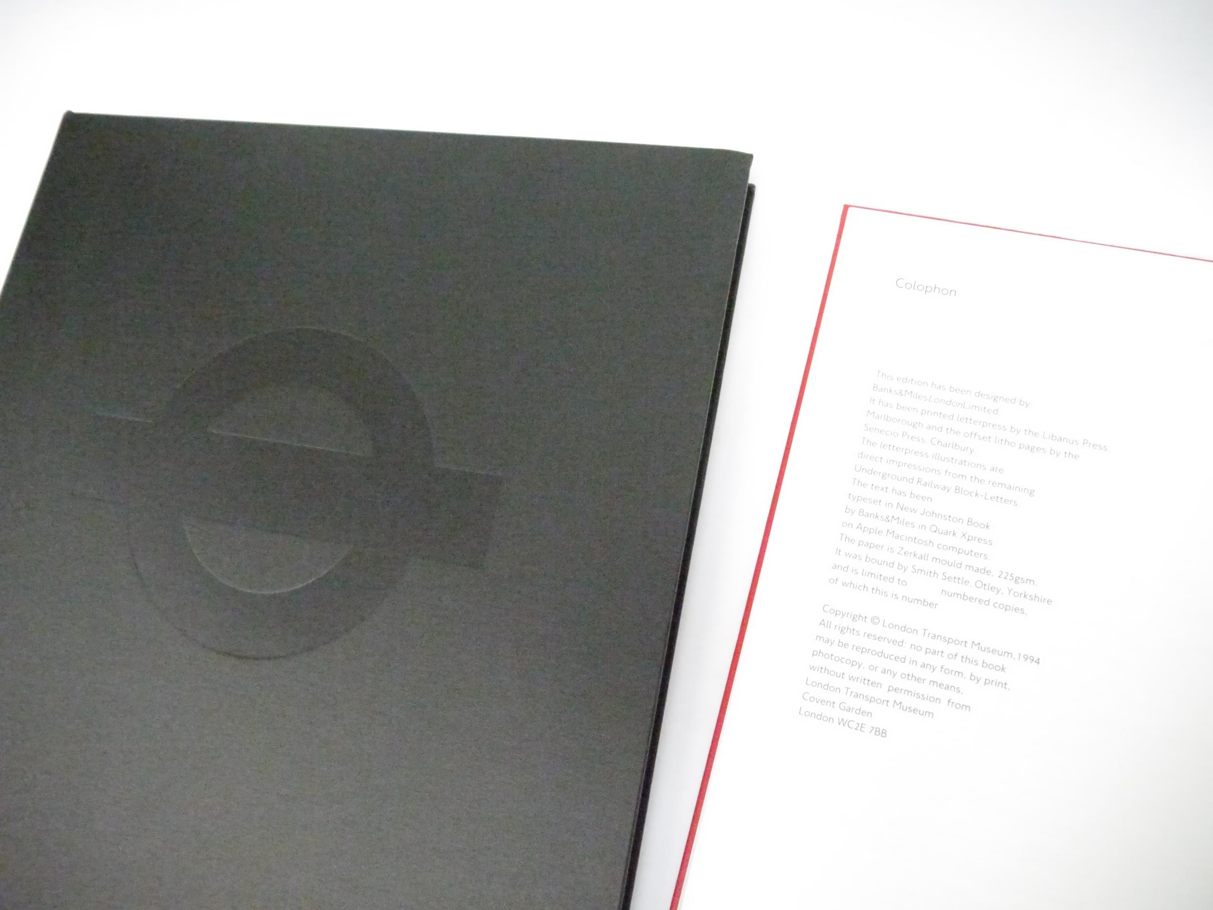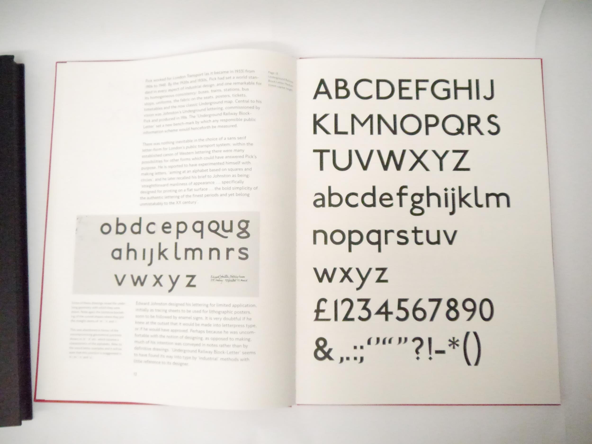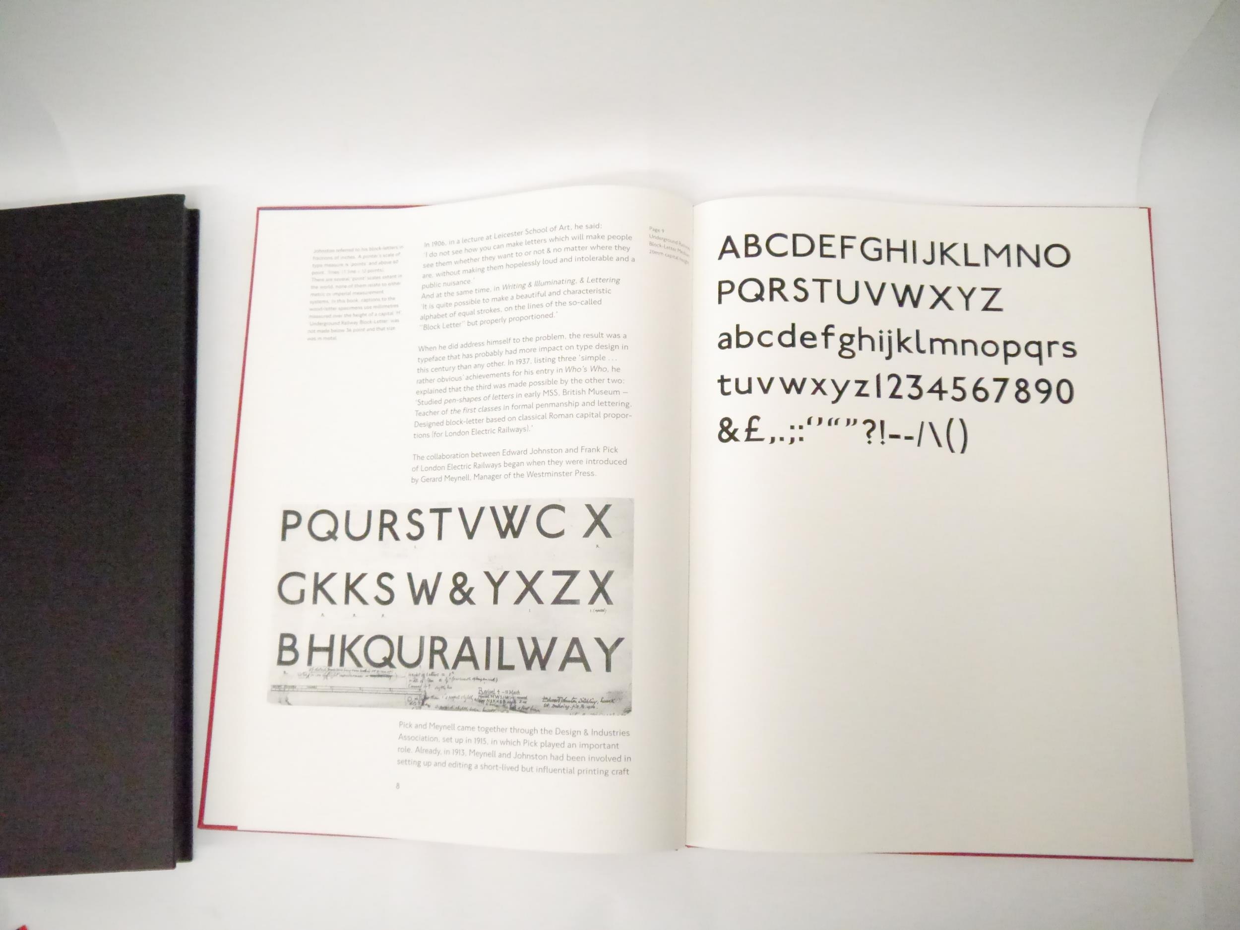 Edward Johnston. Colin Banks: 'London's handwriting. The development of Edward Johnston's Underground Railway block-letter.', London Transport Museum, 1994, limited edition, unnumbered copy [one of a limited edition of 160 copies], 50pp, printed on 225 gsm Zerkall mouldmade paper by Libanus Press (letterpress) and Senecio Press (offset lithograph illustrations), numerous illustrations including reproductions of Edward Johnston's original drawings and 17 pages of type samples printed direct from the wood-letter, large folio (51 x 37cm), original red cloth with blindstamped London Transport logo to front cover by Smith Settle, original black cloth solander box, titled in blind to spine