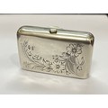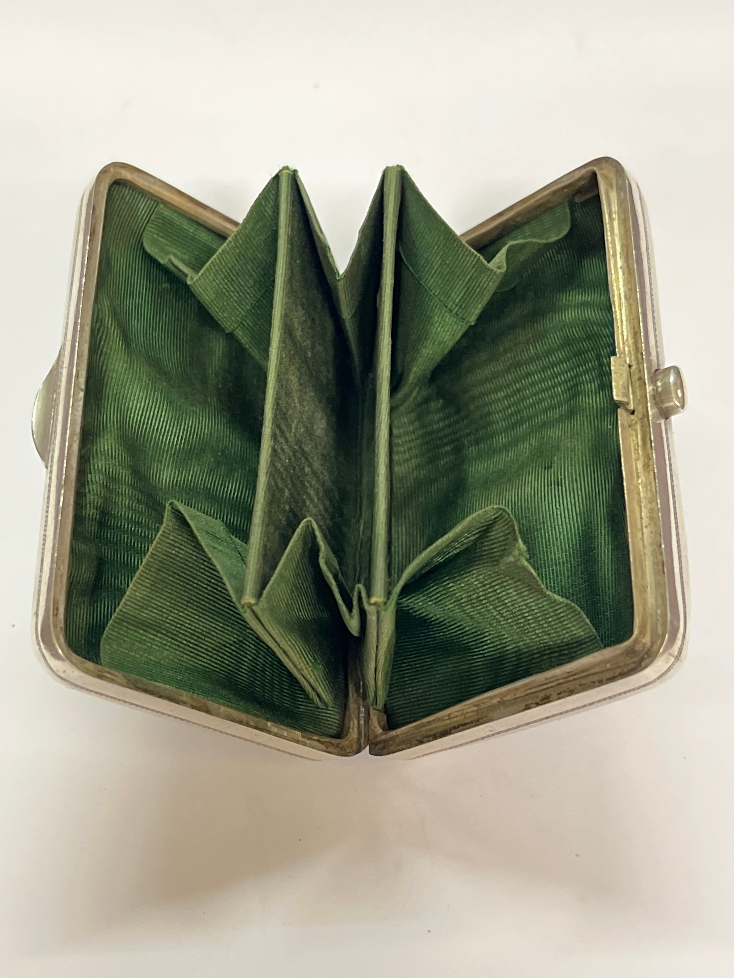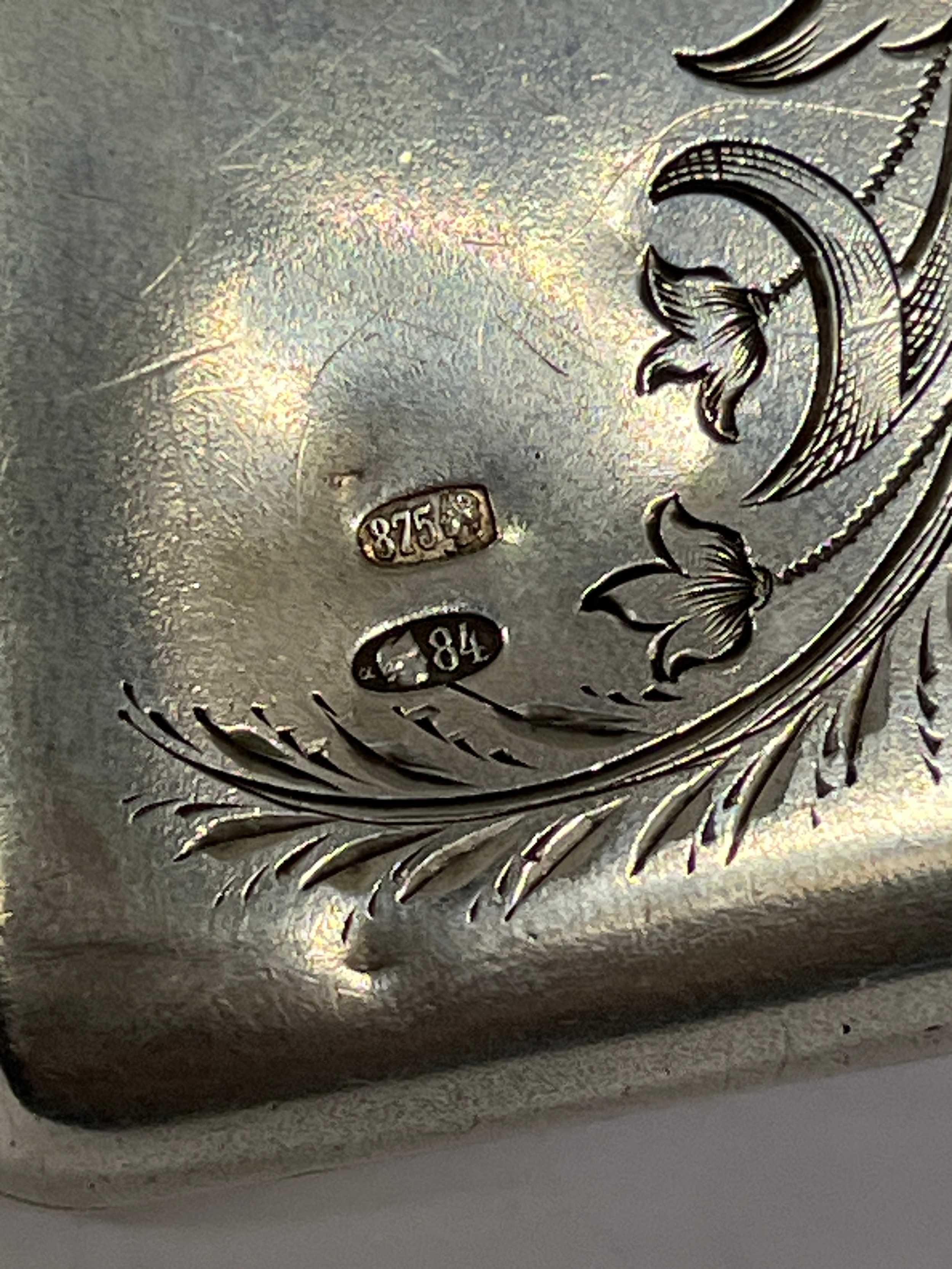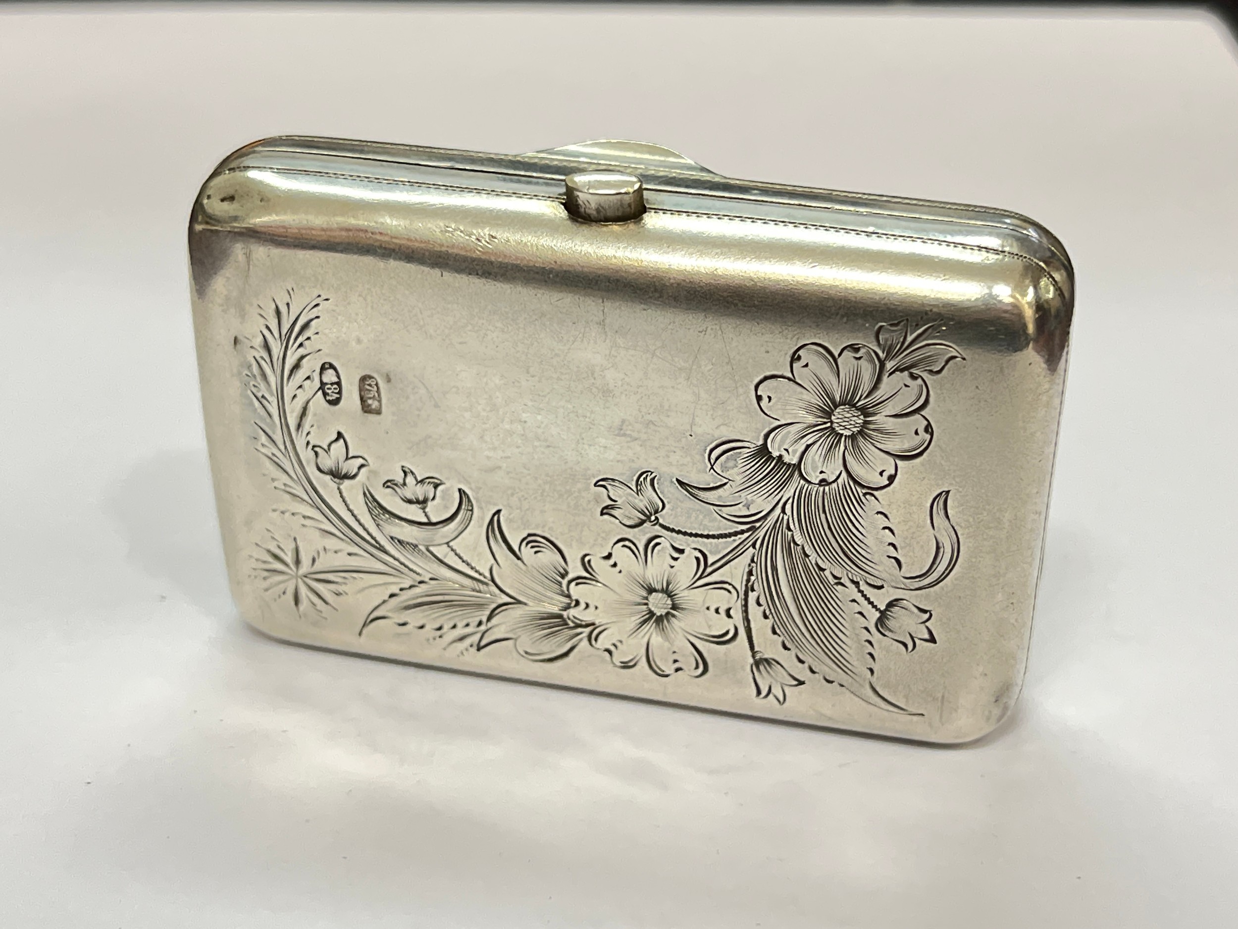 A Russian silver evening purse, rounded rectangular form with engraved foliage and floral sprays, stamped with 84 zolotnik standard mark and 875 mark thought to relate to Latvian import, button opens revealing a green silk-lined interior, minor indentations, 6.9cm x 4.3cm x 1.7cm