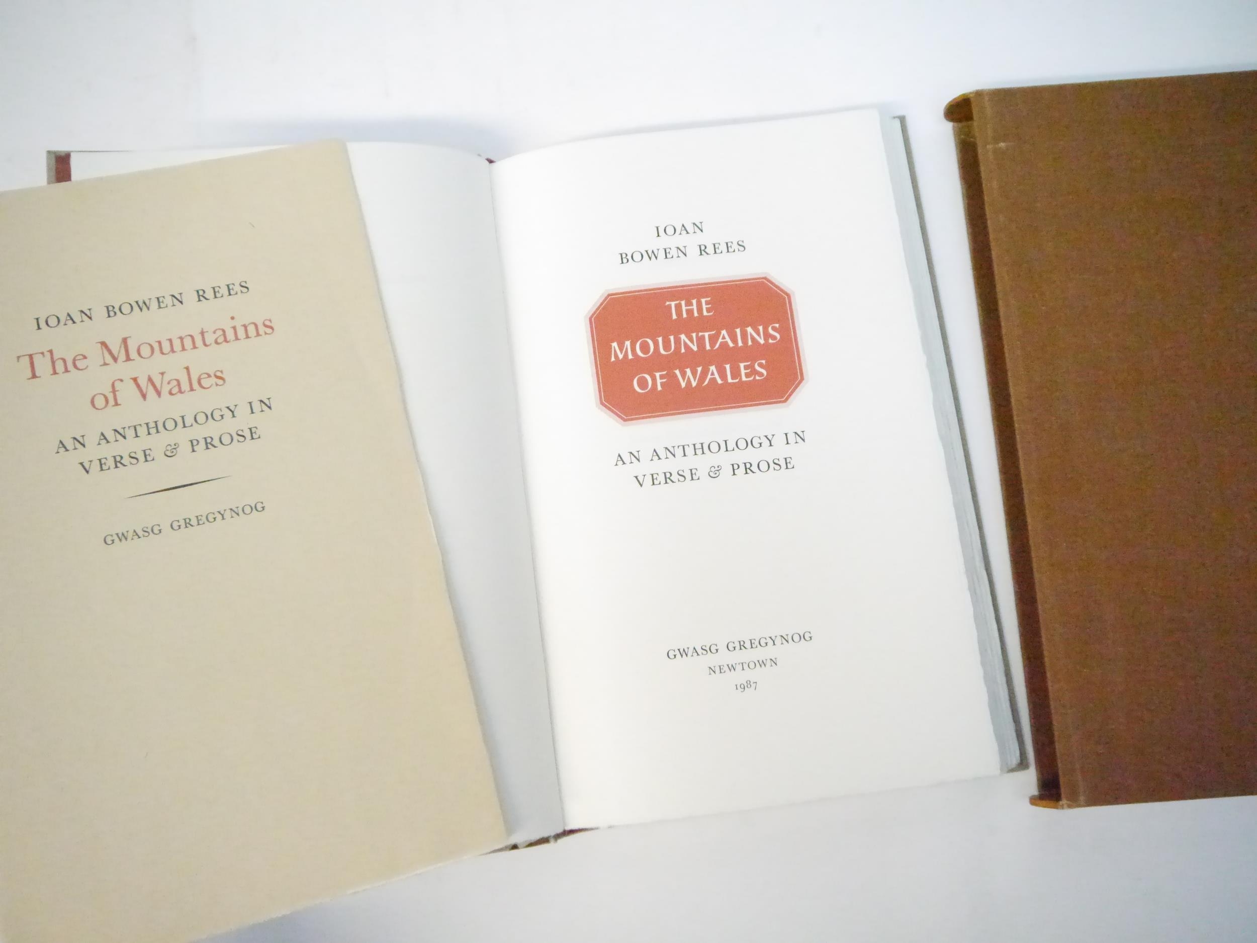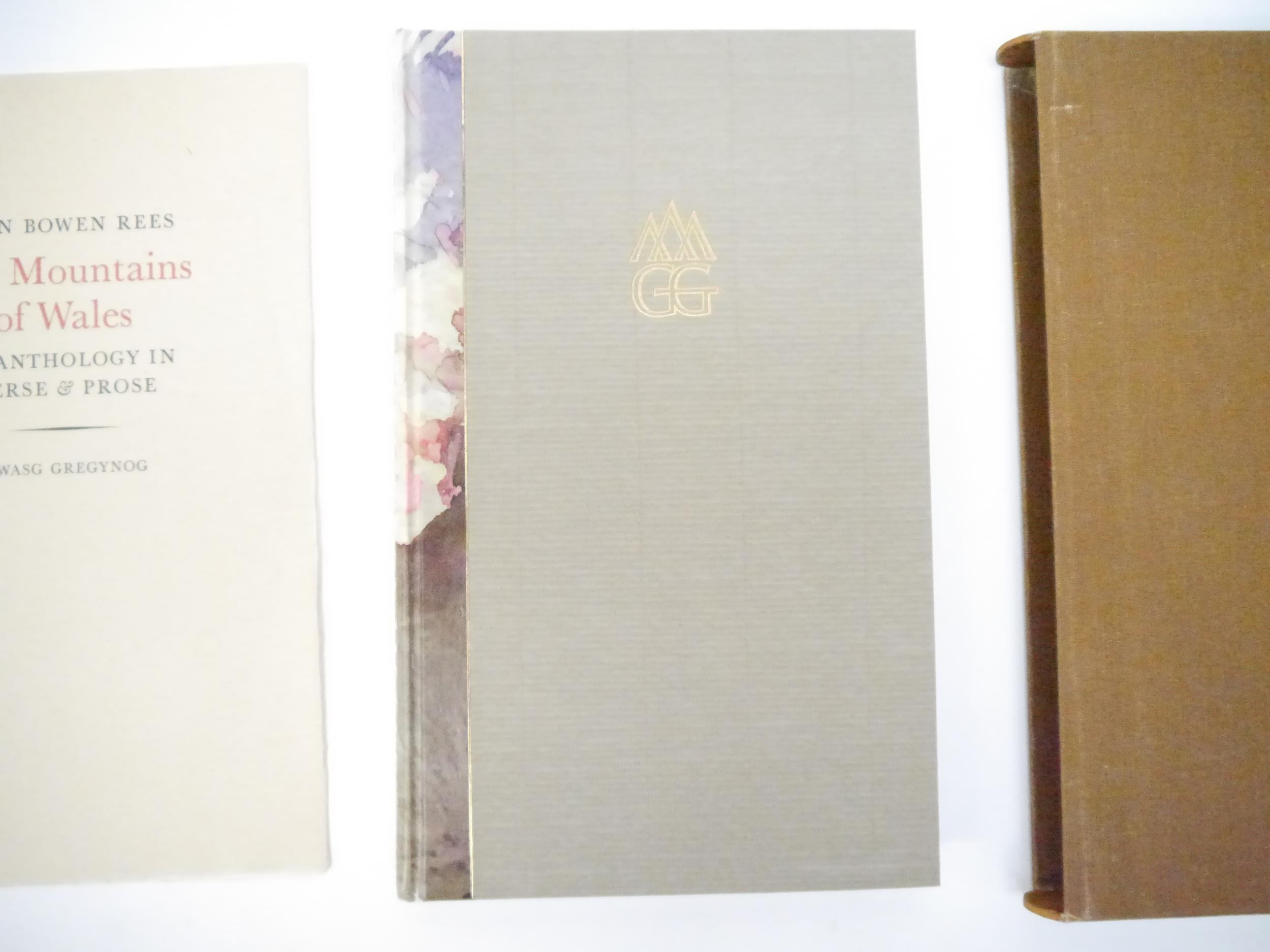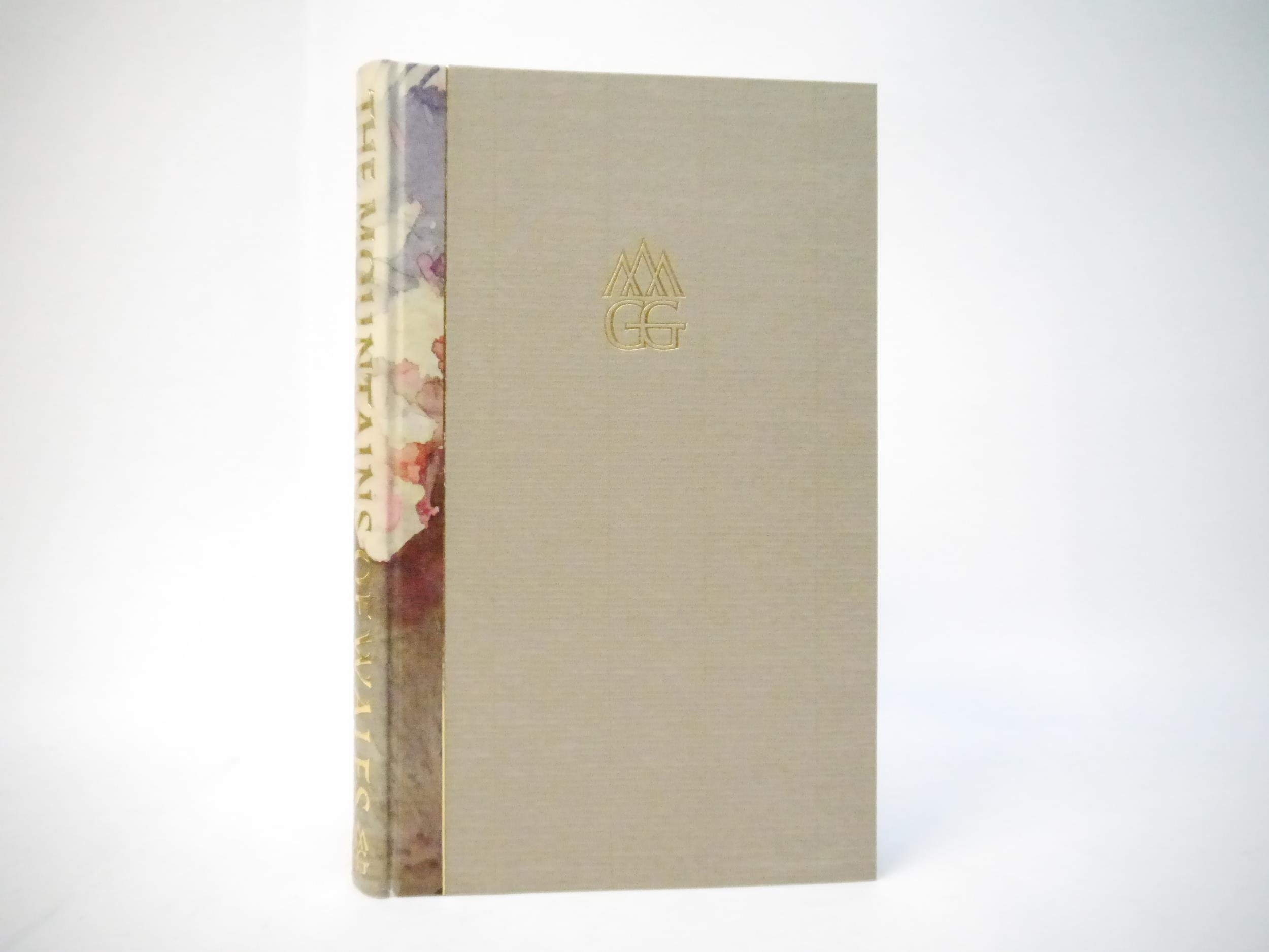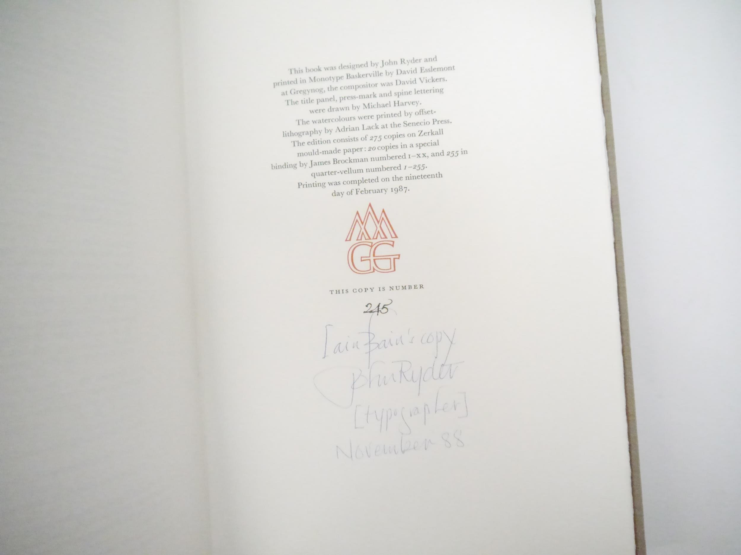 Gwasg Gregynog. Ioan Bowen Rees: 'The Mountains of Wales, an Anthology in Verse & Prose.', Newtown, Gwasg Gregynog, 1987, limited edition, copy number 245 of 255 bound in quarter painted vellum, this being a presentation copy, inscribed in a good hand on the colophon page for Iain Bain by John Ryder, the designer of the book, "Iain Bain's copy John Ryder [typographer] November 88". 8 mounted coloured plates by the Reverend John Parker, produced by offset-lithography, 191pp, 4to (30 x 18cm), bound by James Brockman and Desmond Shaw, original quarter painted vellum spine, spine gilt lettered, grey Fabriano Roma hand made paper covered boards, device in gold on upper cover, top edge gilt, with 8pp prospectus, original slipcase