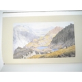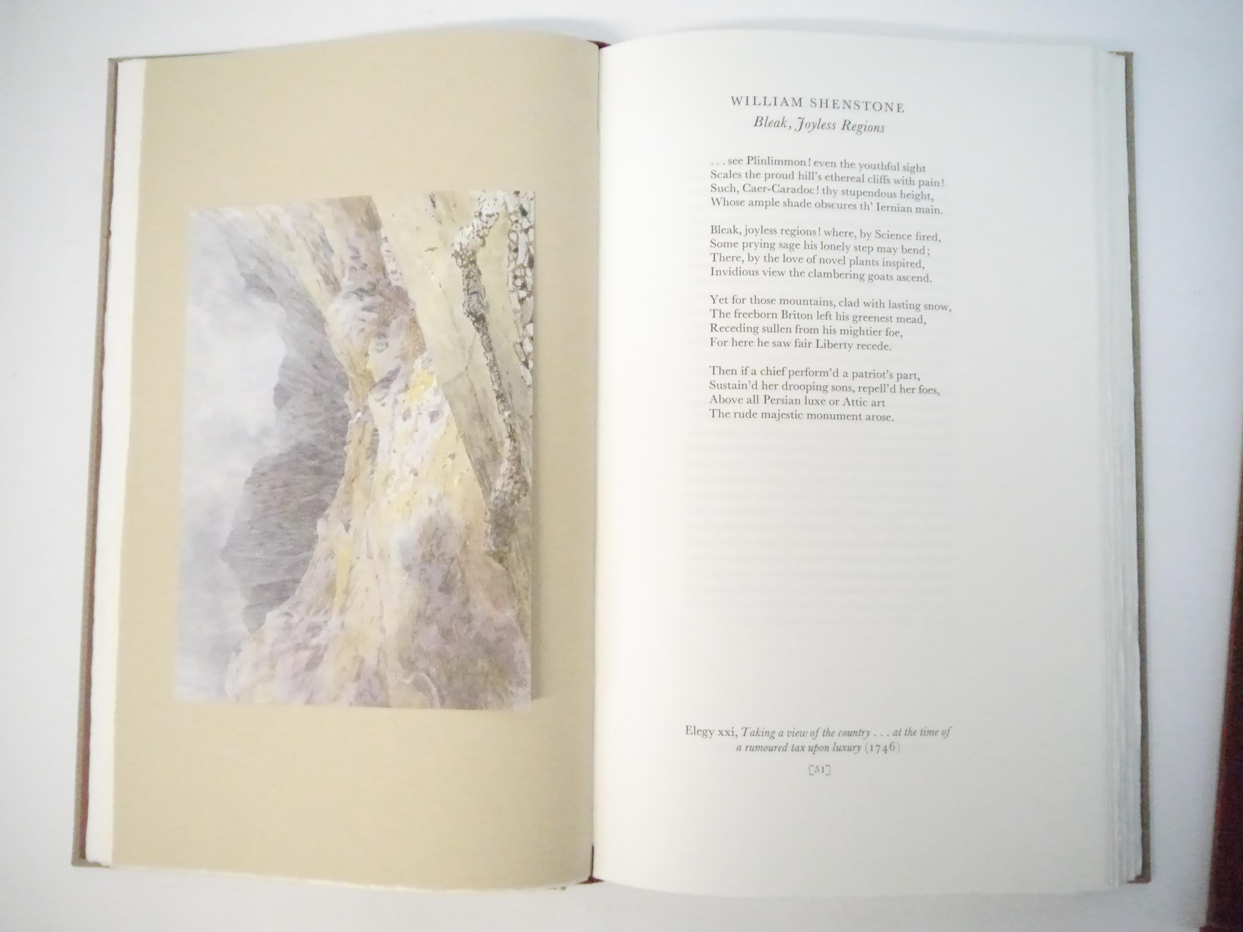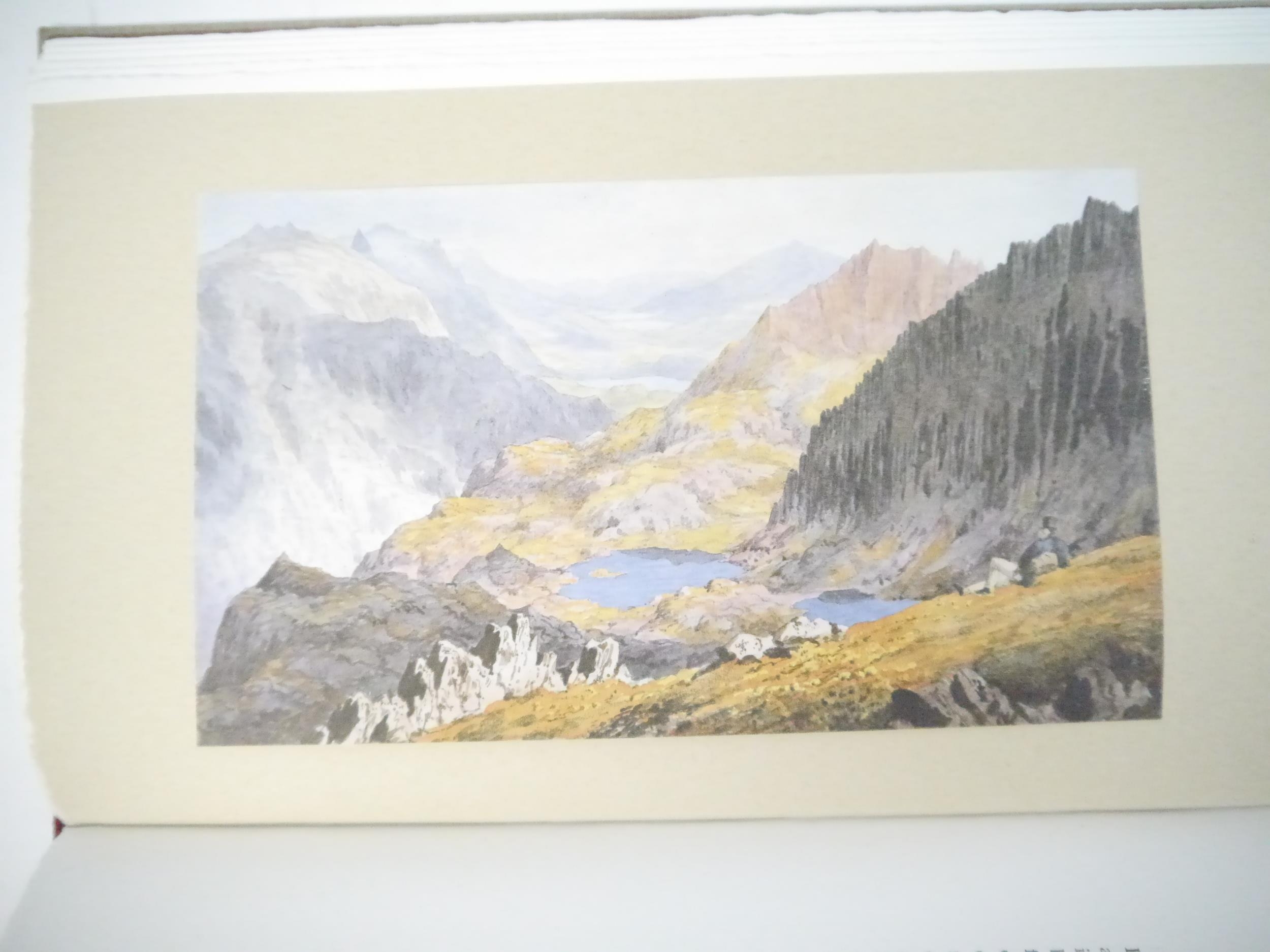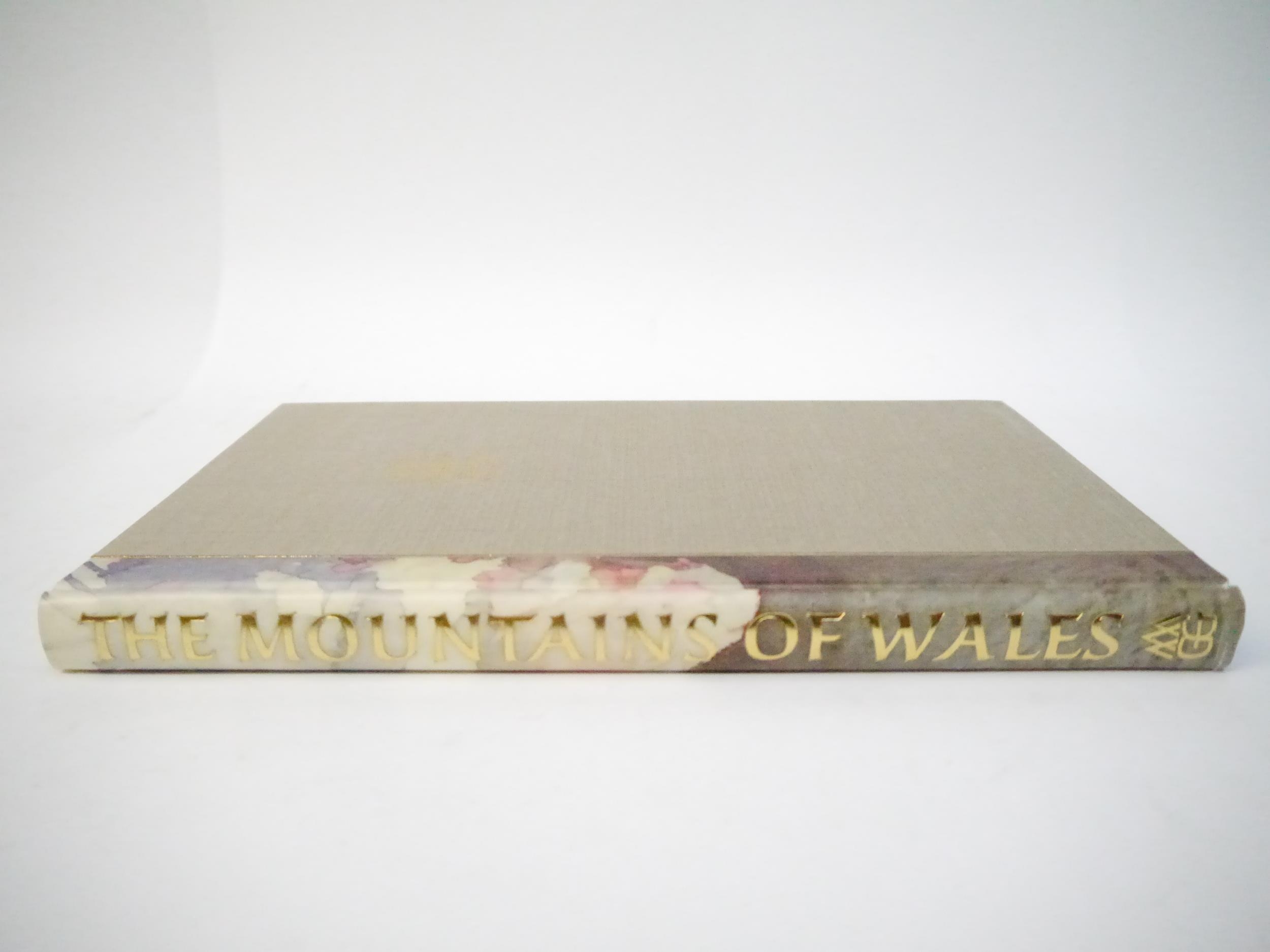 Gwasg Gregynog. Ioan Bowen Rees: 'The Mountains of Wales, an Anthology in Verse & Prose.', Newtown, Gwasg Gregynog, 1987, limited edition, copy number 245 of 255 bound in quarter painted vellum, this being a presentation copy, inscribed in a good hand on the colophon page for Iain Bain by John Ryder, the designer of the book, "Iain Bain's copy John Ryder [typographer] November 88". 8 mounted coloured plates by the Reverend John Parker, produced by offset-lithography, 191pp, 4to (30 x 18cm), bound by James Brockman and Desmond Shaw, original quarter painted vellum spine, spine gilt lettered, grey Fabriano Roma hand made paper covered boards, device in gold on upper cover, top edge gilt, with 8pp prospectus, original slipcase