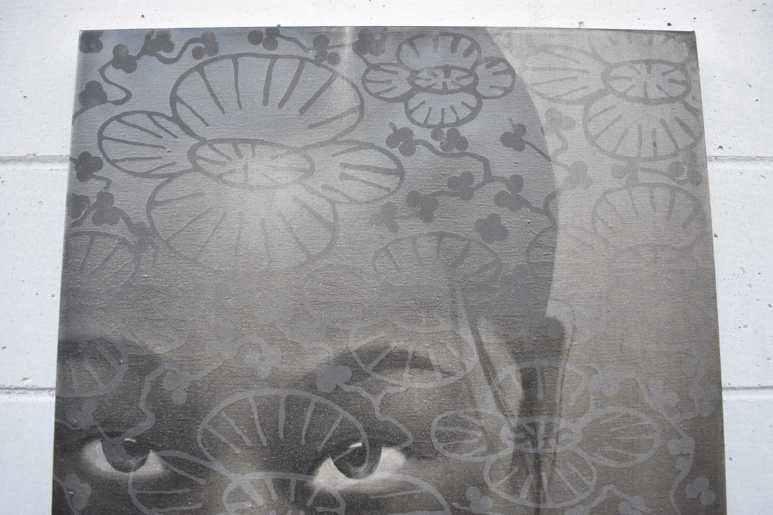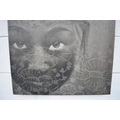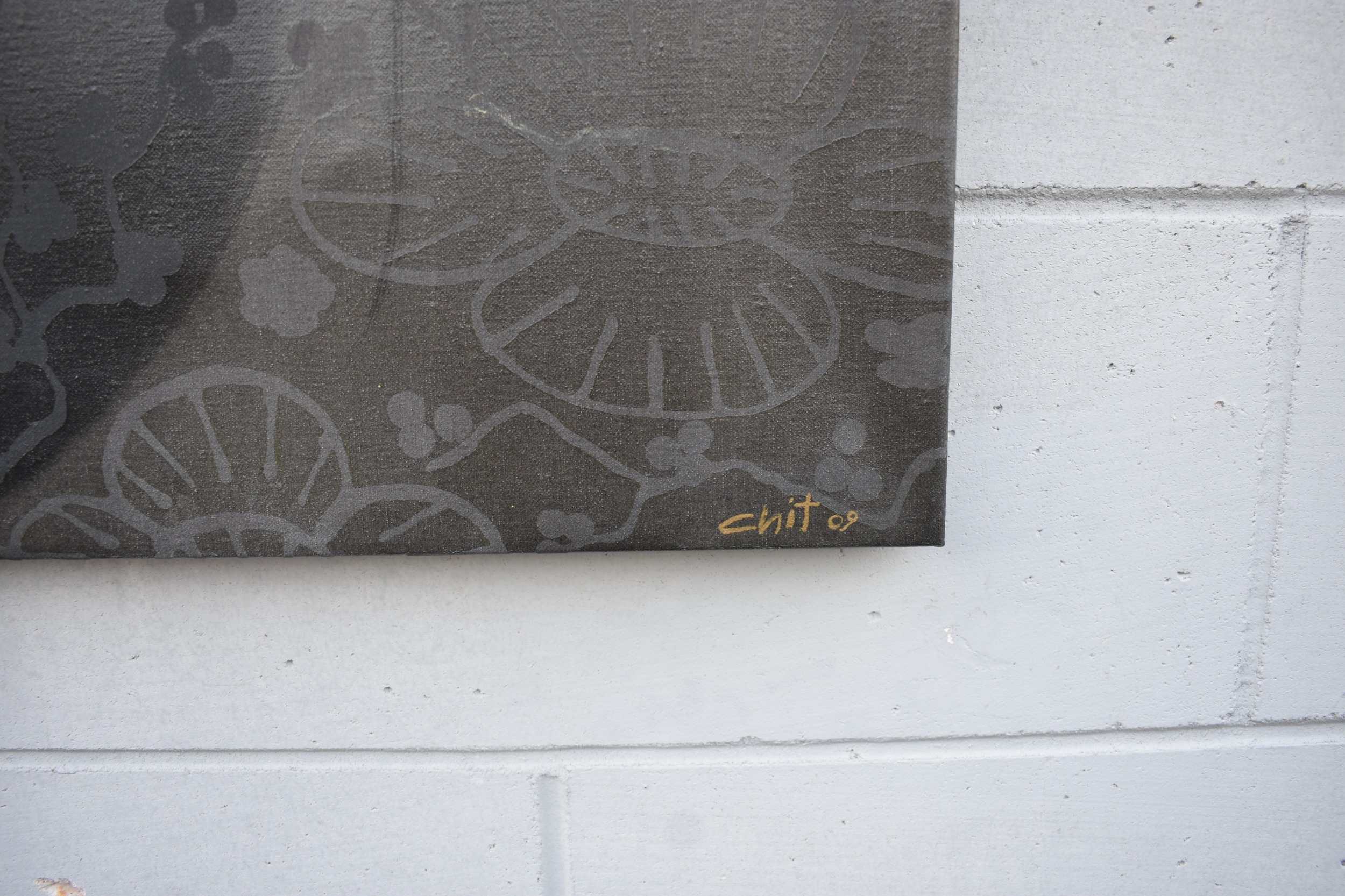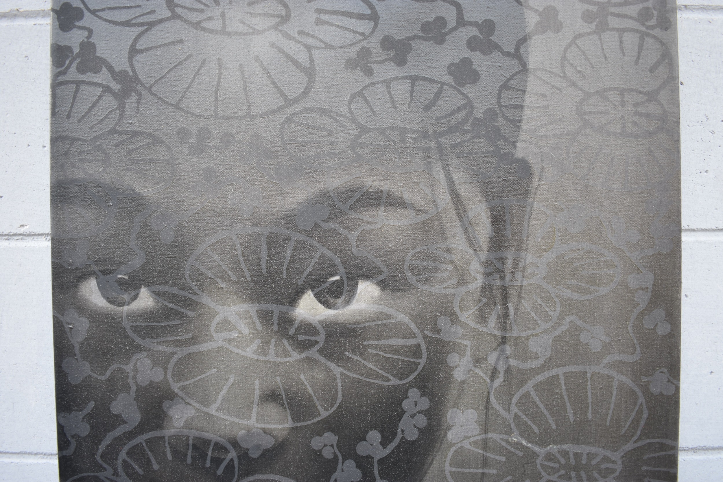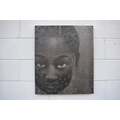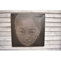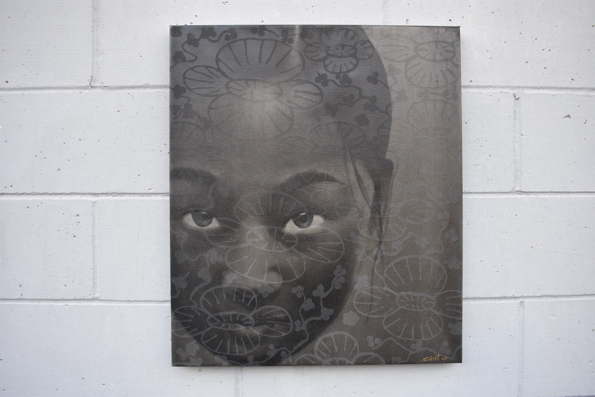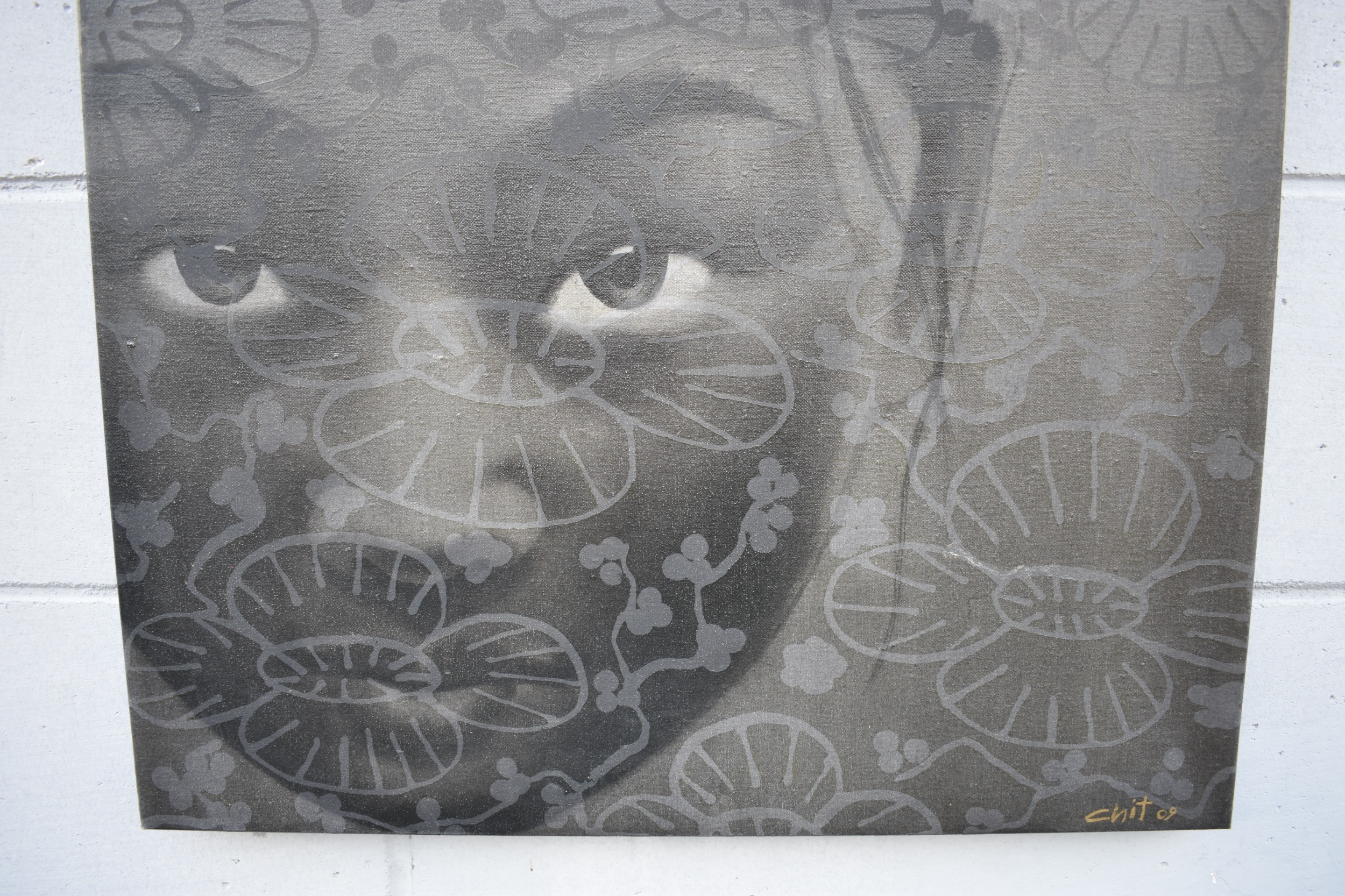 CHIT: Thai Contemporary artist: Mixed media portrait, the central image of young girl with wax resist flower and blossom pattern, black background, dated '09. 69.5cm x 59.5cm