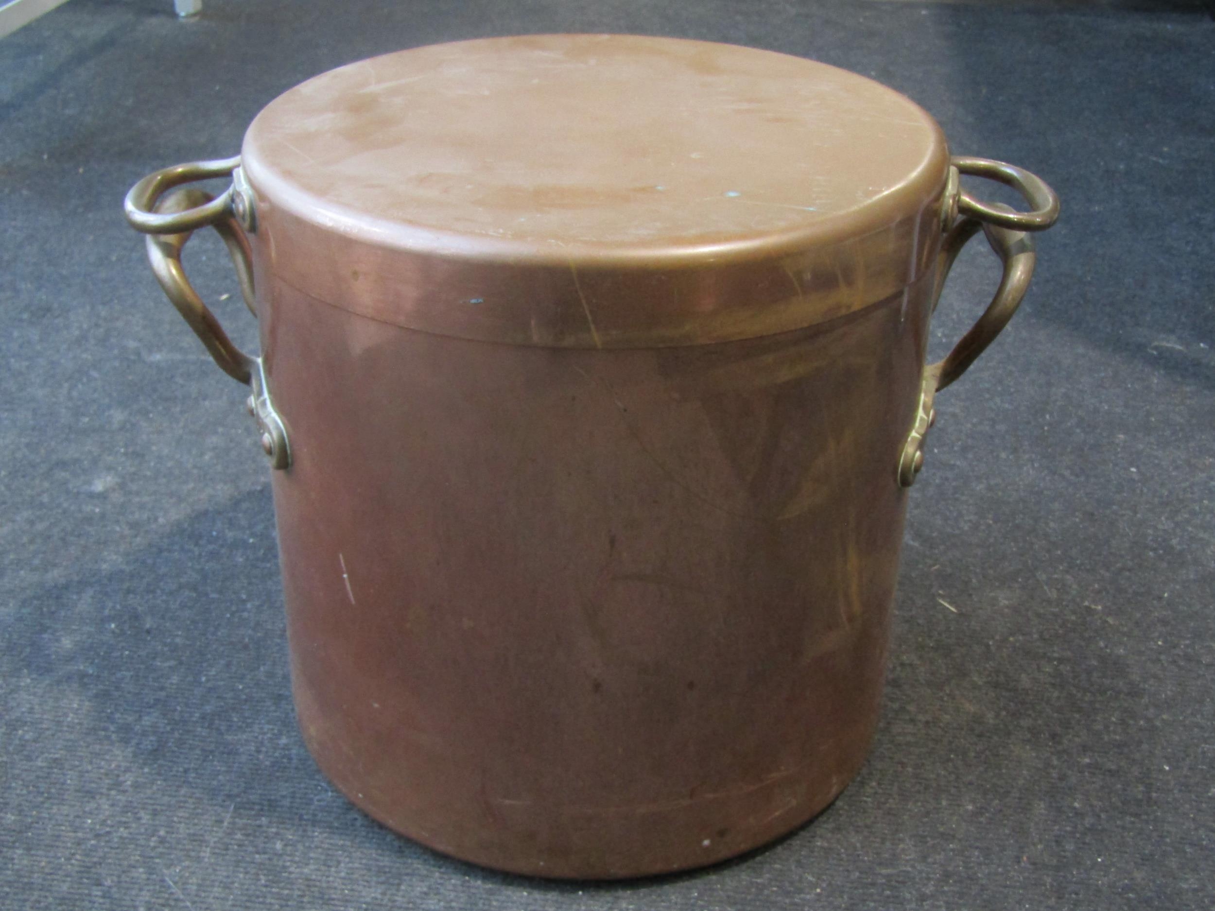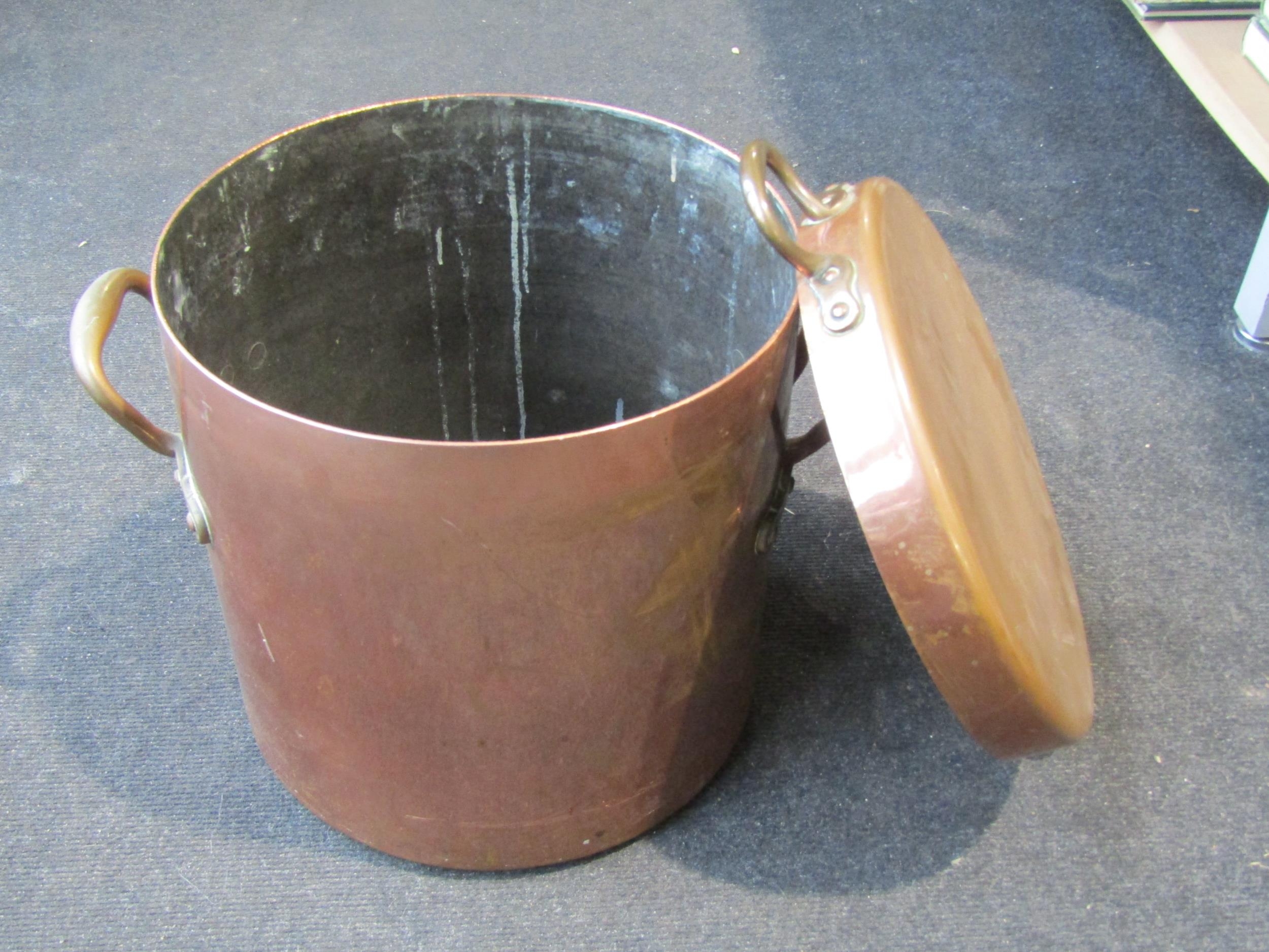 A large copper cooking pot with lid, star stamp to base, no.12 stamp to handles, 31cm diameter x 32cm height