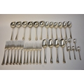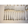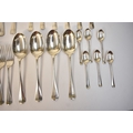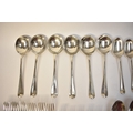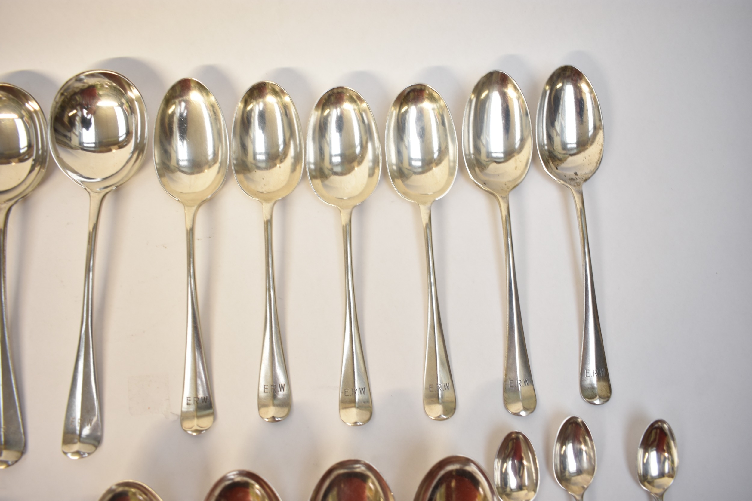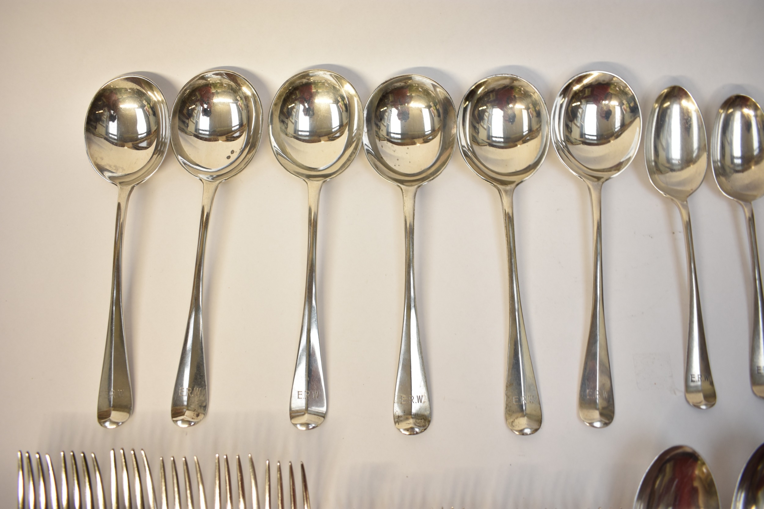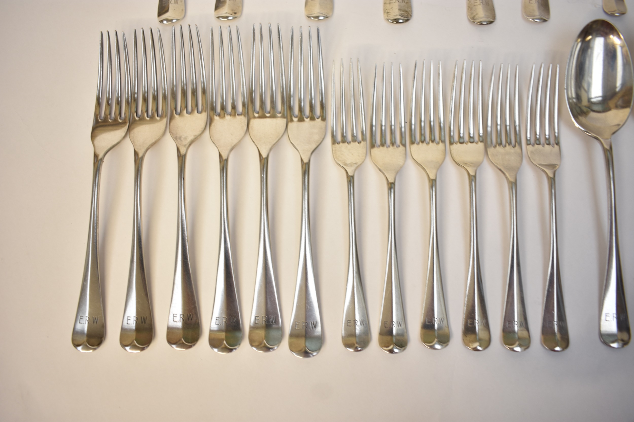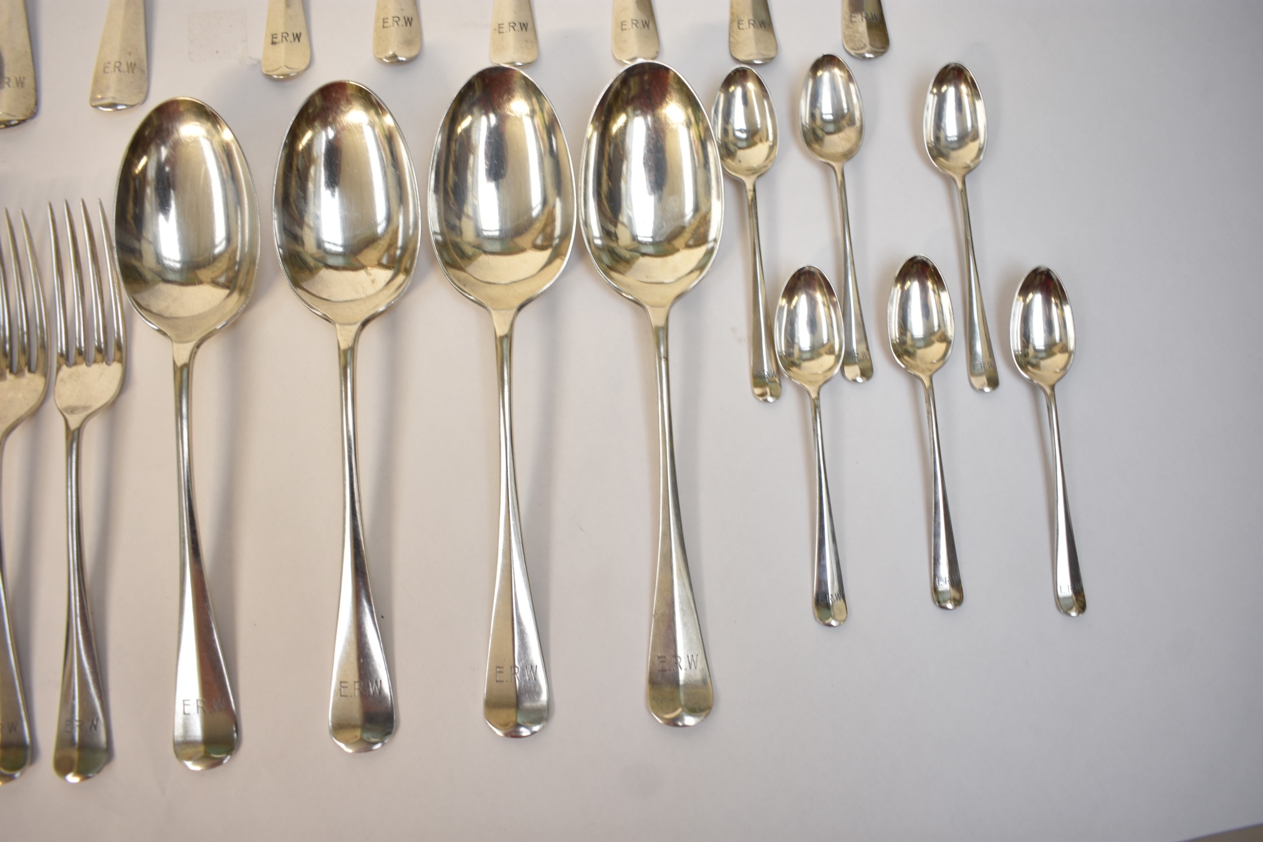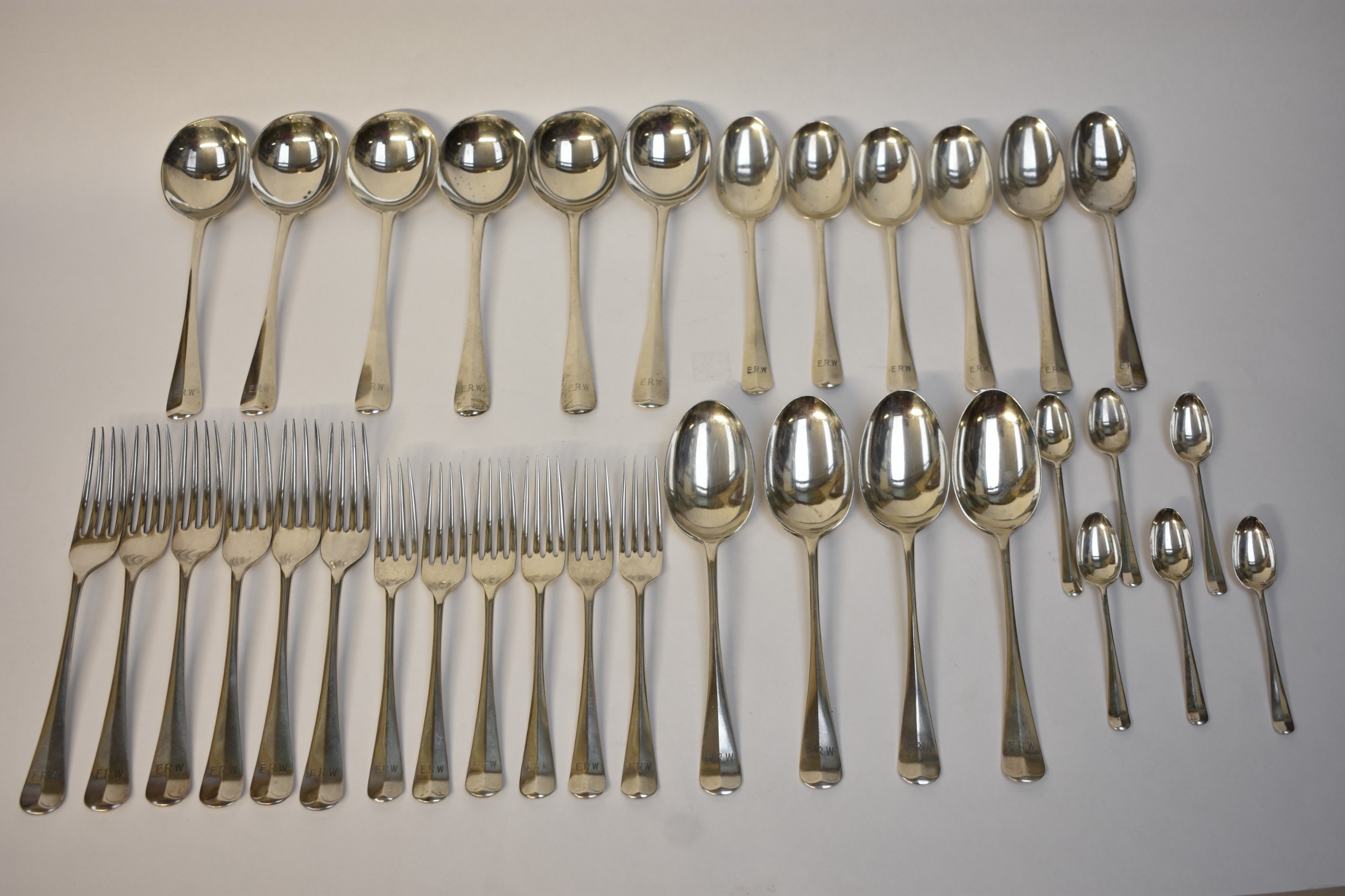 Goldsmiths & Silversmiths Co Ltd flatware including six large forks, six small forks, six soup spoons, six dessert spoons, six teaspoons and four serving spoons. Edinburgh 1935, London 1931, 1929, Sheffield 1932. All with E.R.W. monogram to handle. 1634g