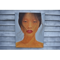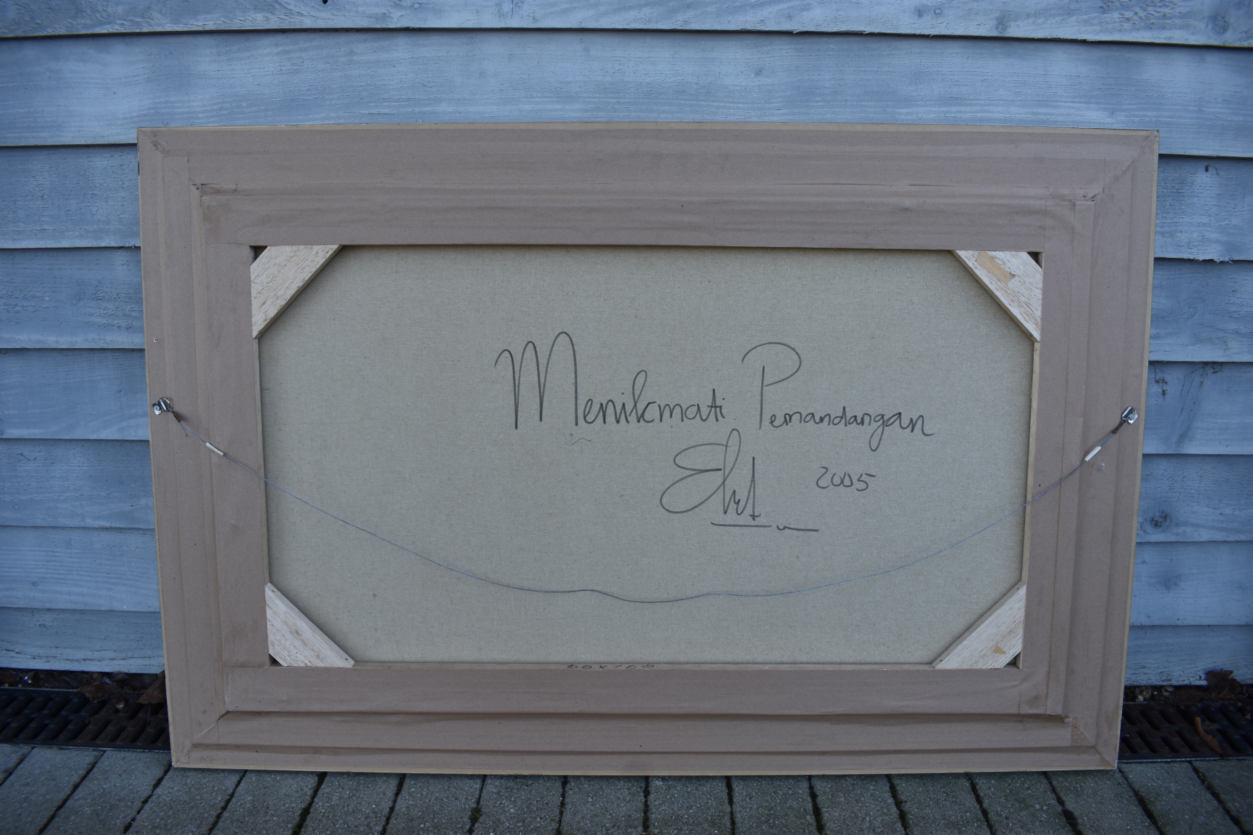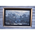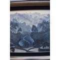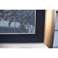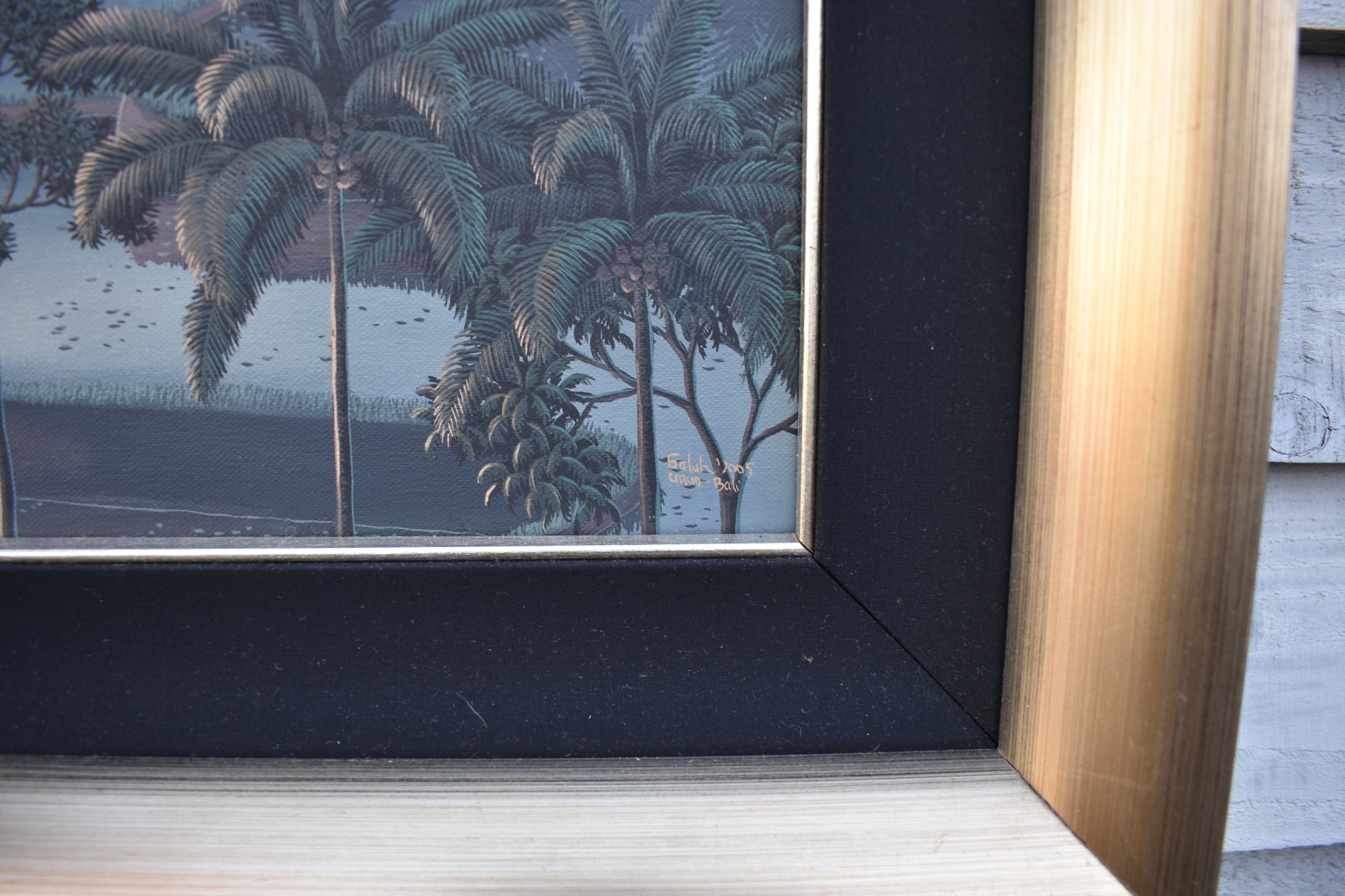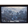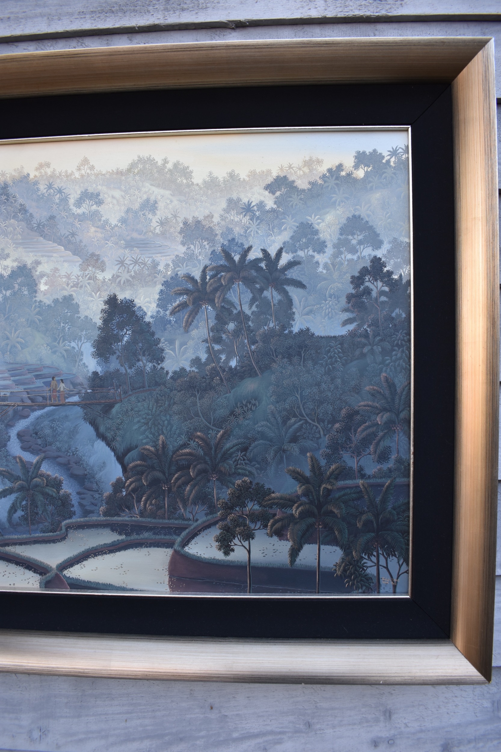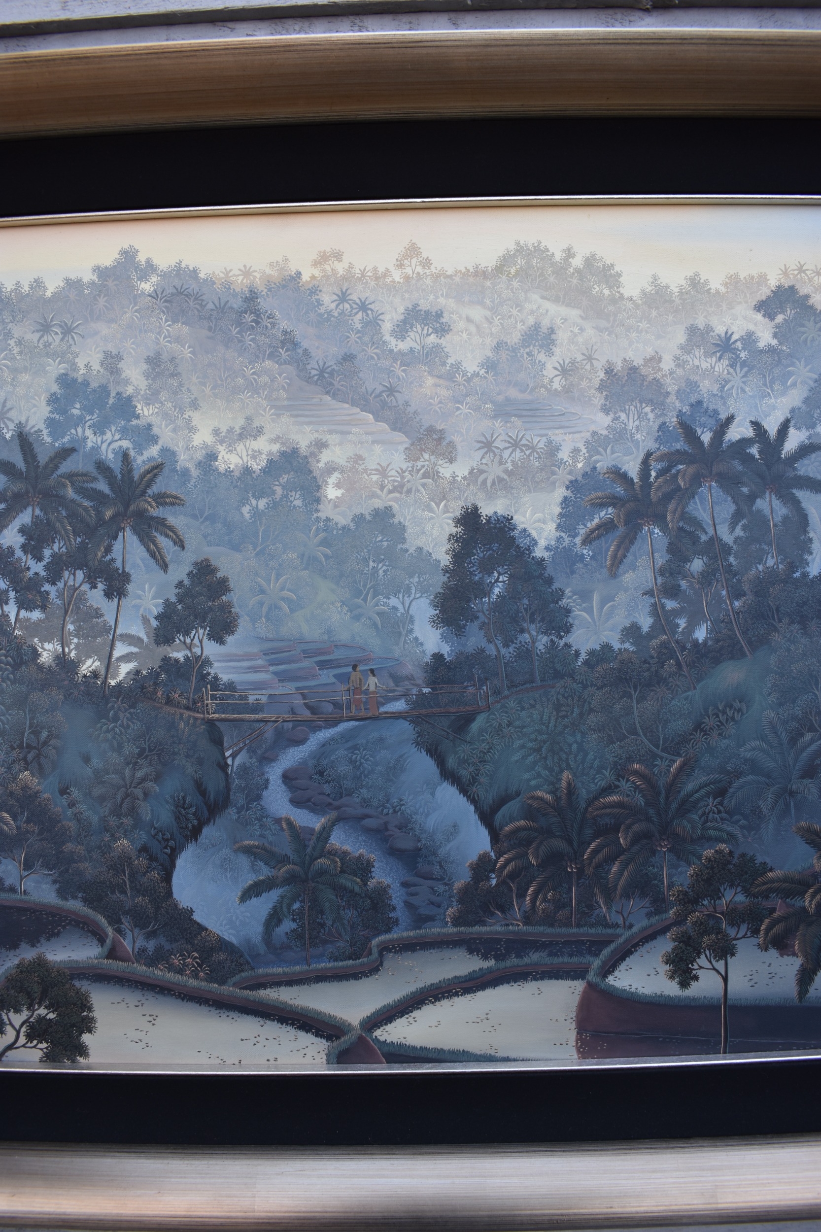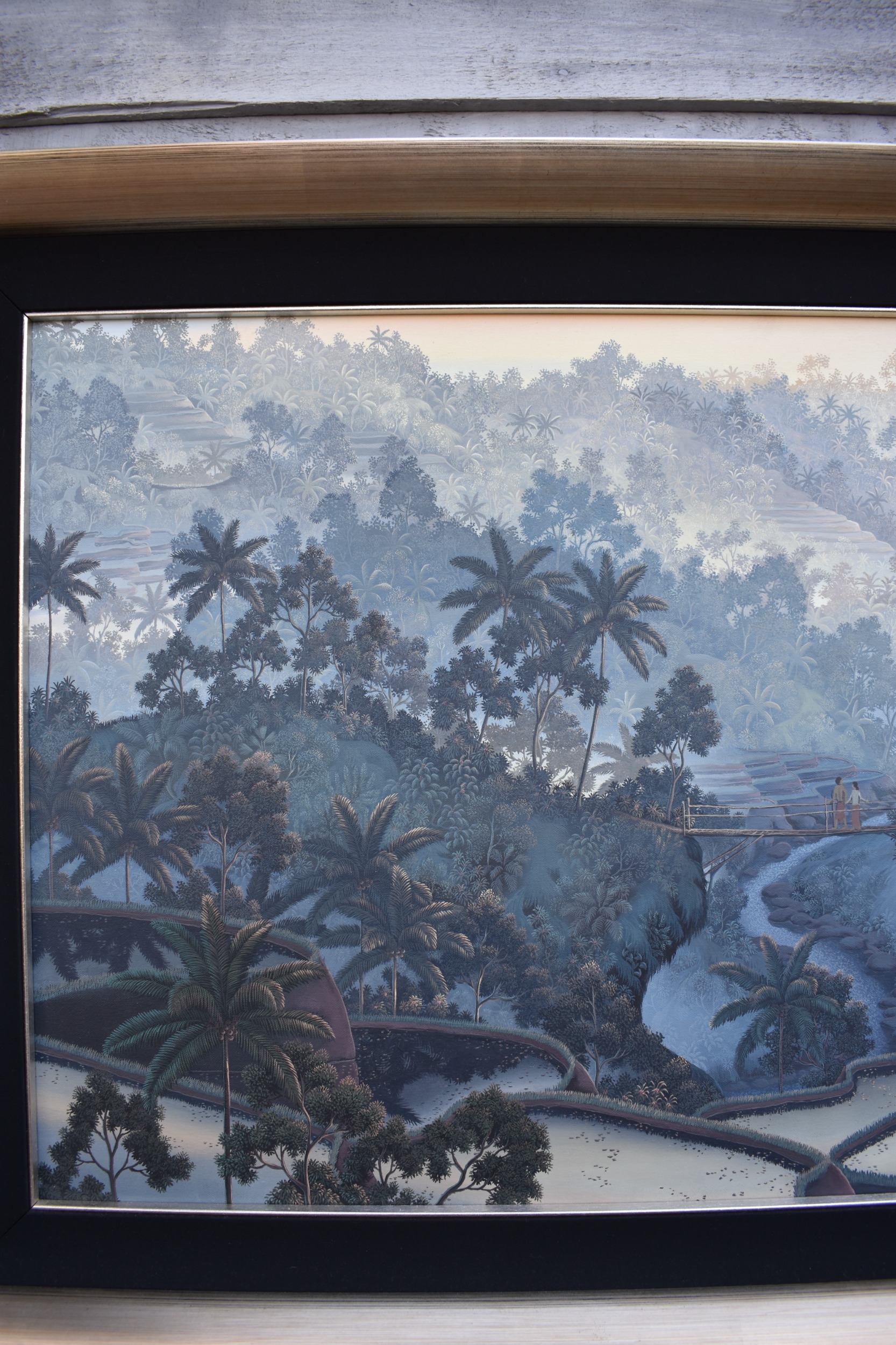 GALUH UBUD 2005 Bali stepped rice terraces with figure bridge and trees, image size 59cm x 98.5cm, frame size 77cm x 117cm