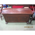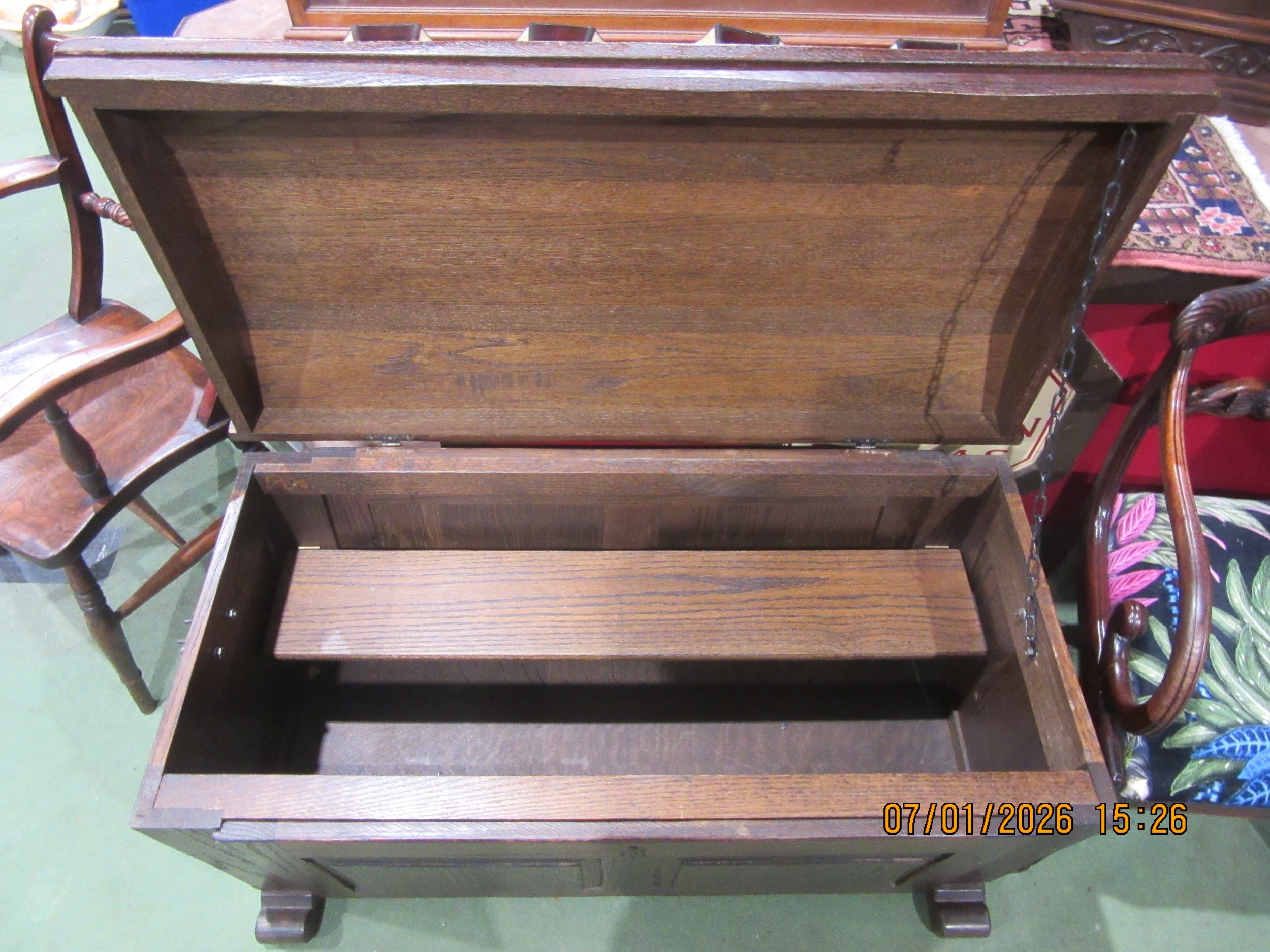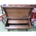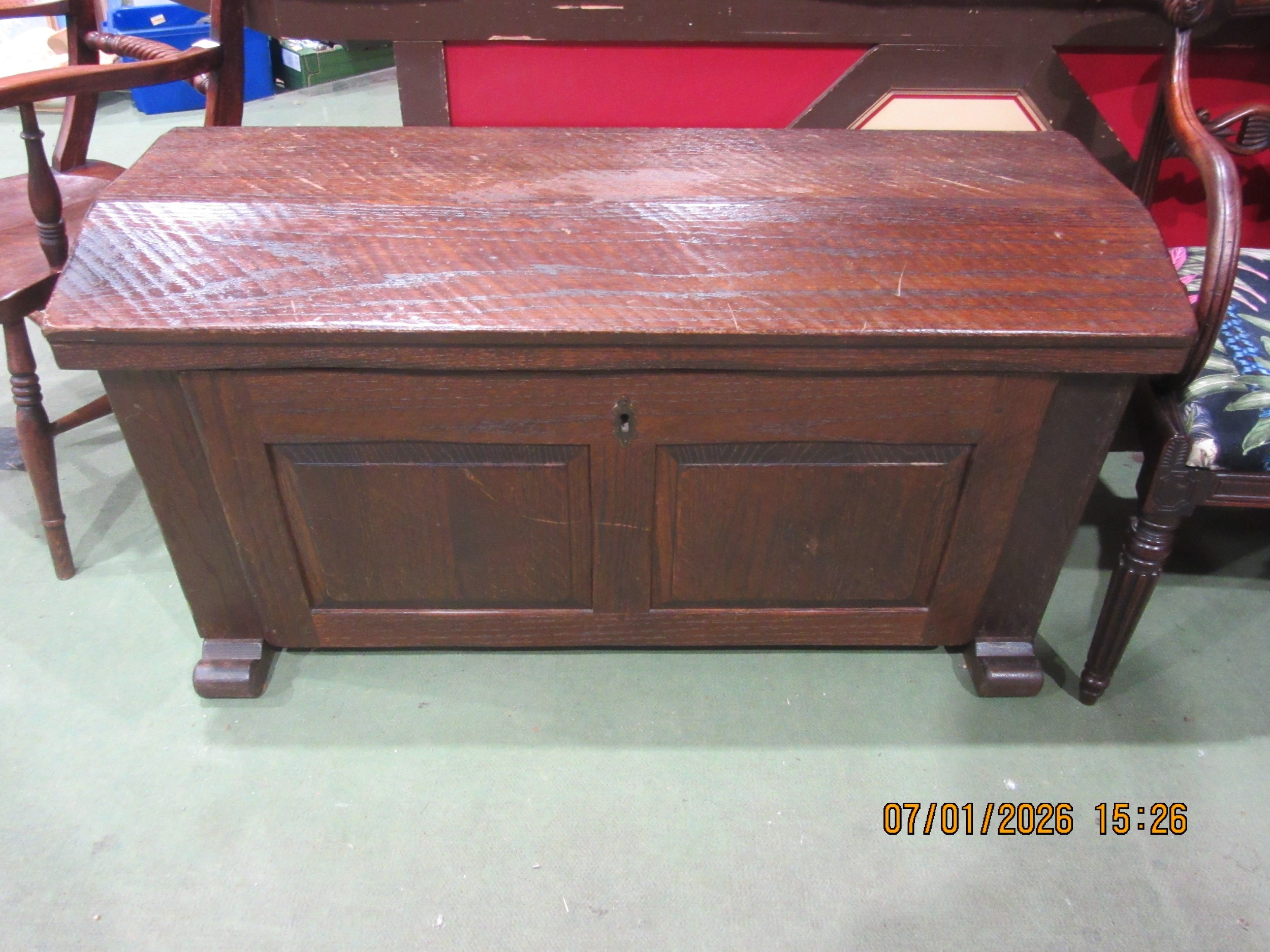 An 18th Century style oak chest with dome shaped hinged lid over iron carrying handles on sledge feet, 62cm tall x 115cm long x 57cm wide