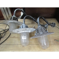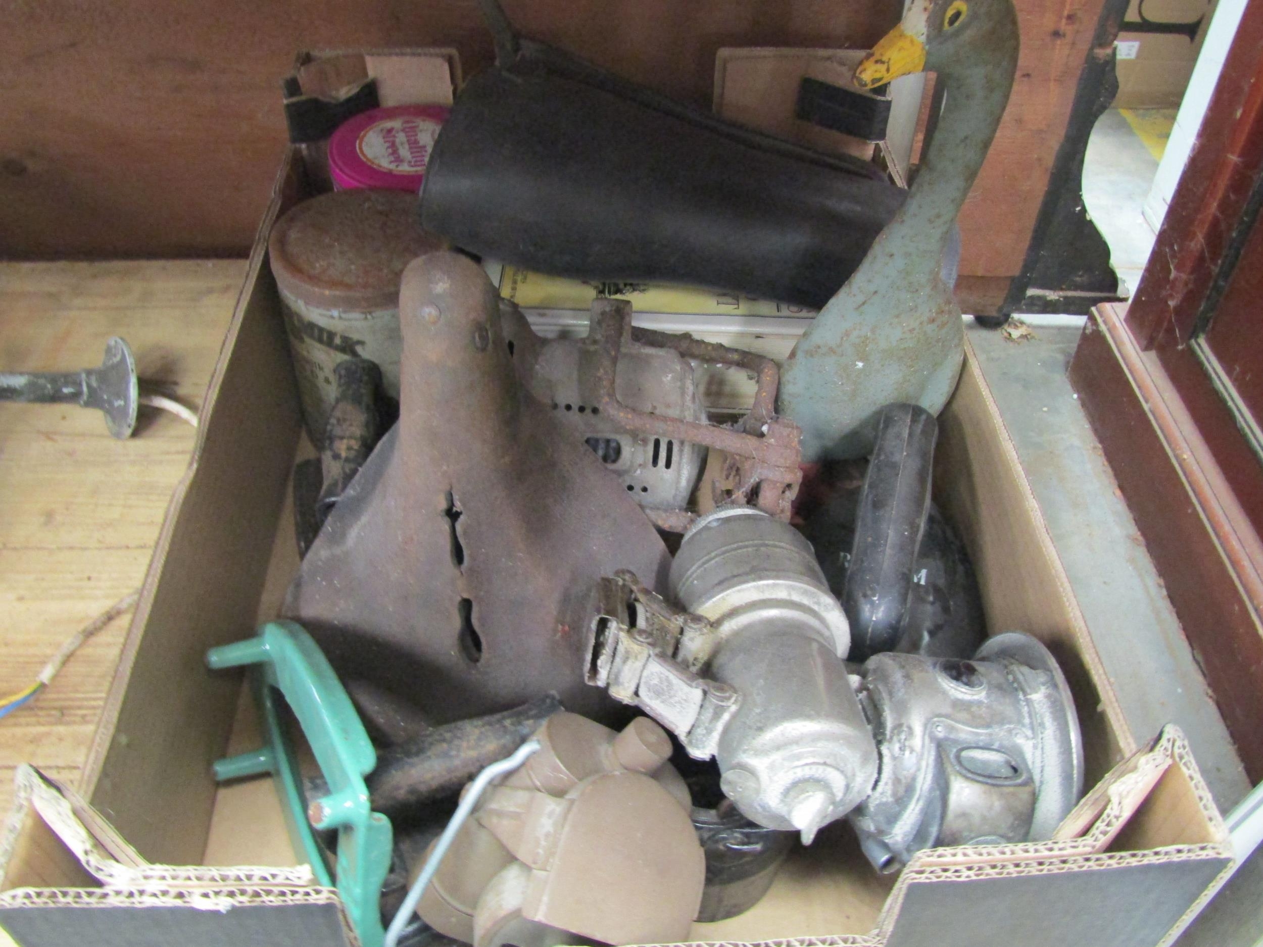 Three Bygone irons, a mini iron cauldron, two books and a bike saddle