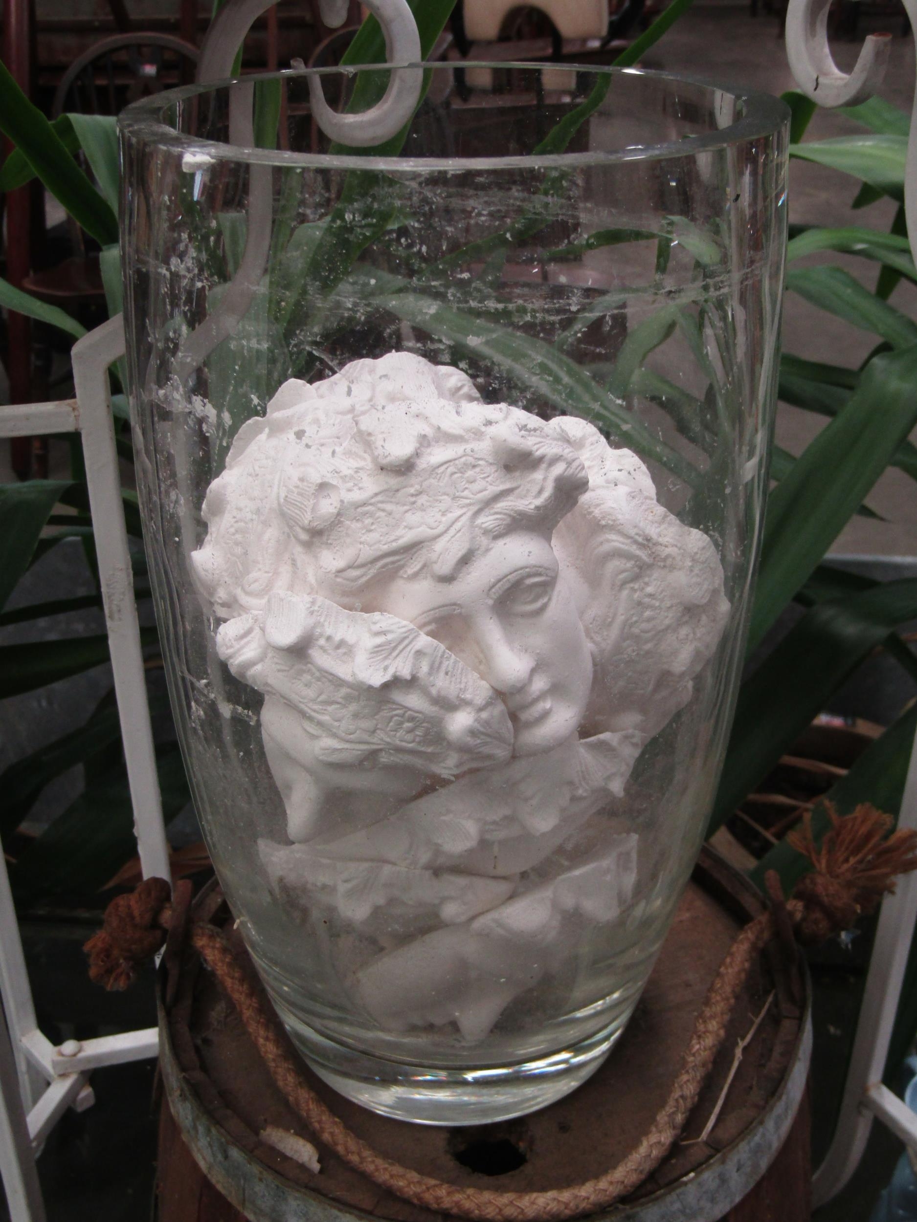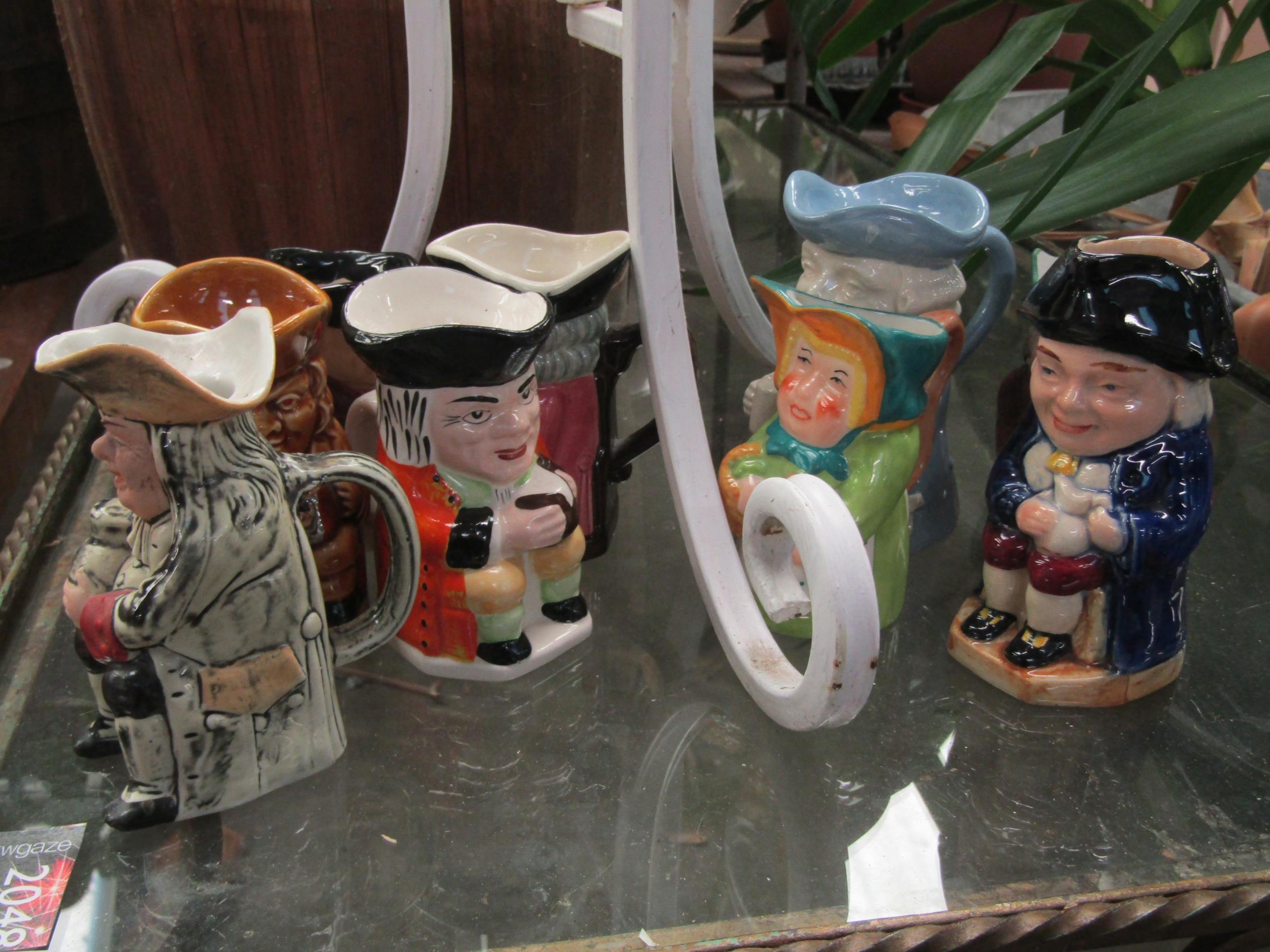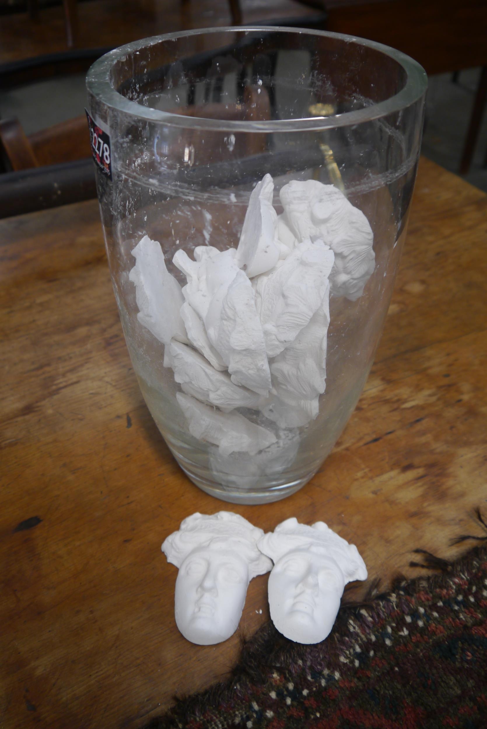 A quantity of plaster maidens heads in glass vase and nine Toby style jugs