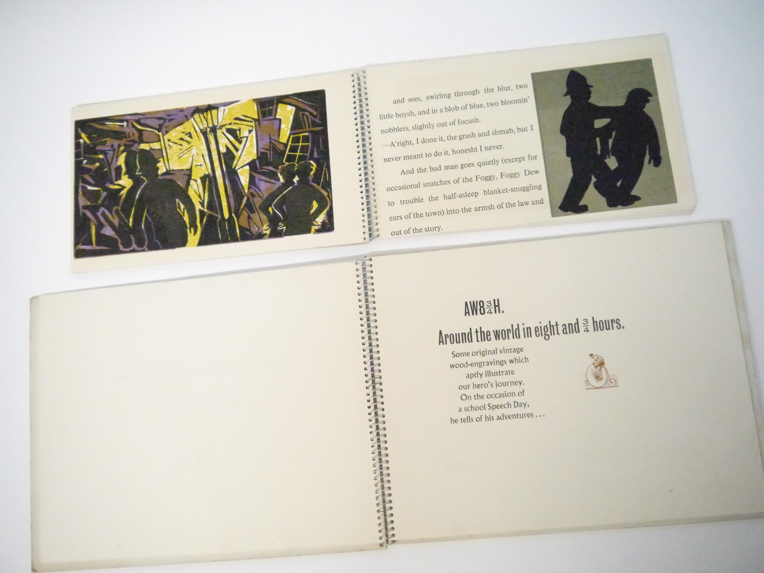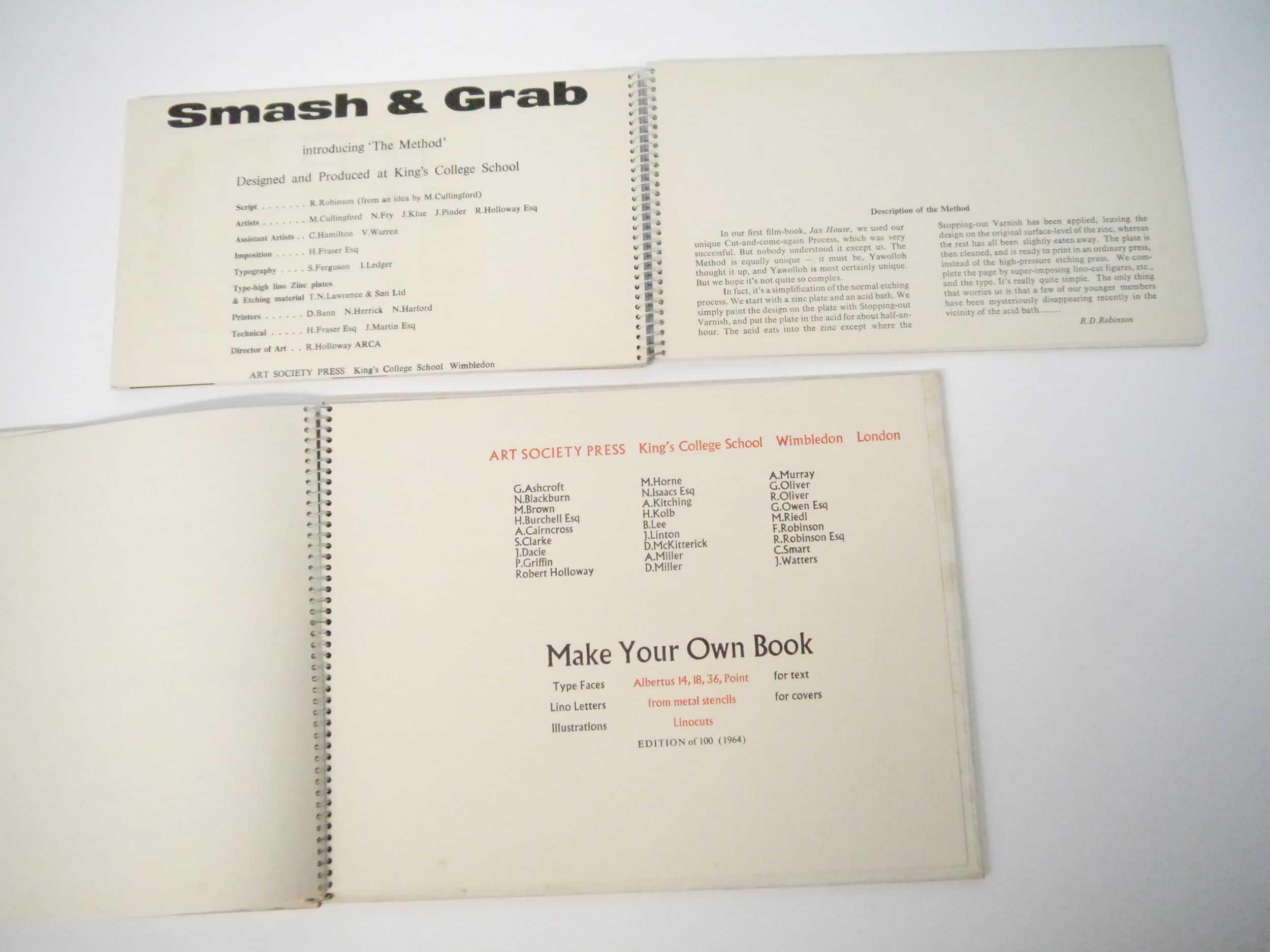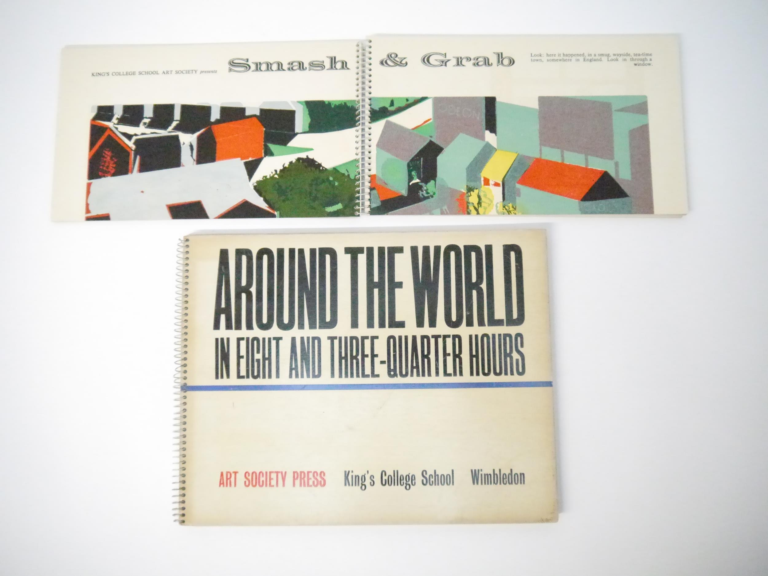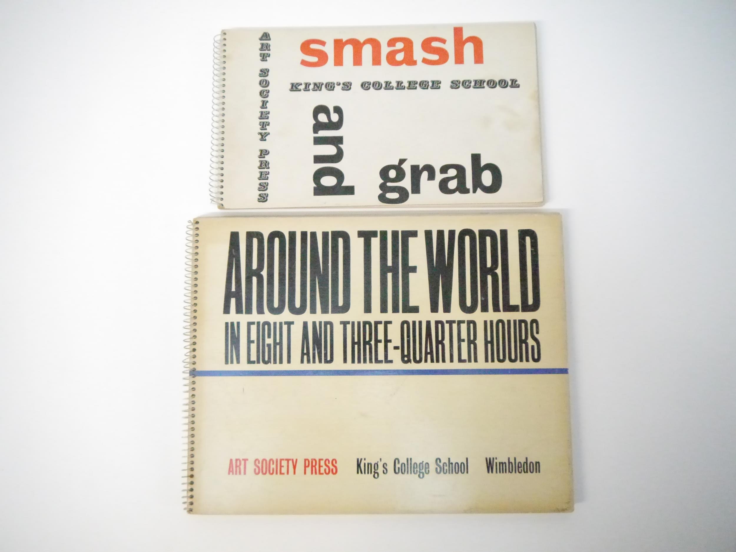 Art Society Press (the private press of the pupils of King's College School, London). Two scarce titles, comprising Roger Robinson, M. Cullingford and others: 'Smash & Grab', Wimbledon, Art Society press, [nd, circa 1960], [32]pp, 20 zinc engraved colour illustrated pages, oblong (15 x 26cm), original spiral bound printed boards; 'Around the World in Eight and Three-Quarter Hours', Wimbledon, Art Society Press, 1964, 2nd edition, limited edition of 250 copies only, 17 colour and b/w wood engraved illustrated pages, [34]pp (including boards) in total, oblong 4to (23 x 29cm), original spiral bound printed boards. Highly imaginative and witty printing. Scarce (2)
