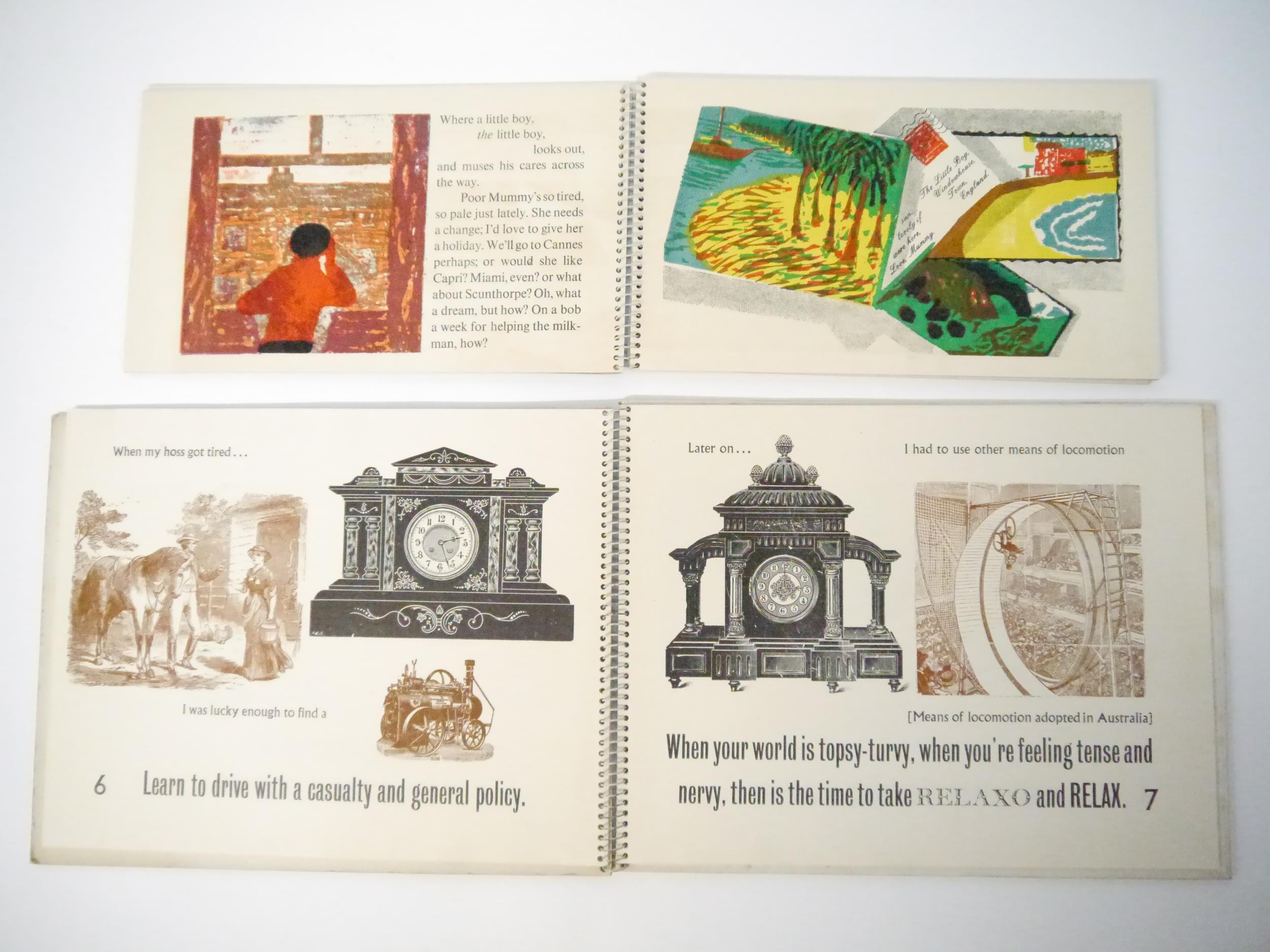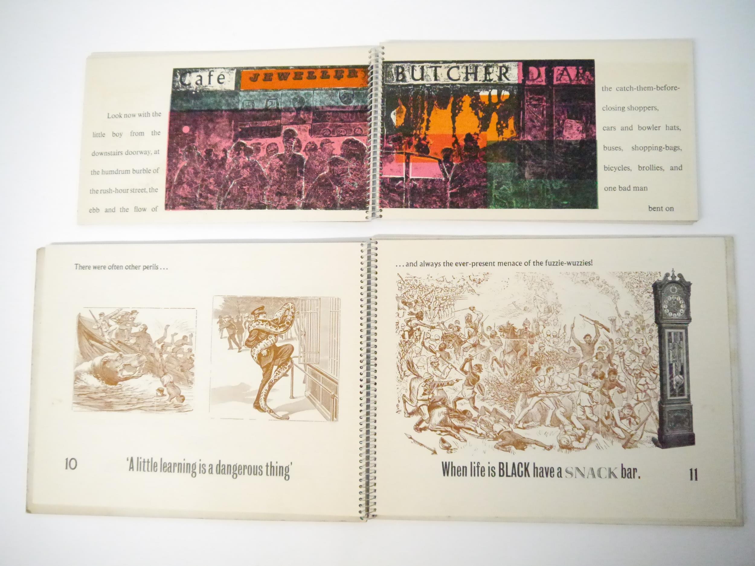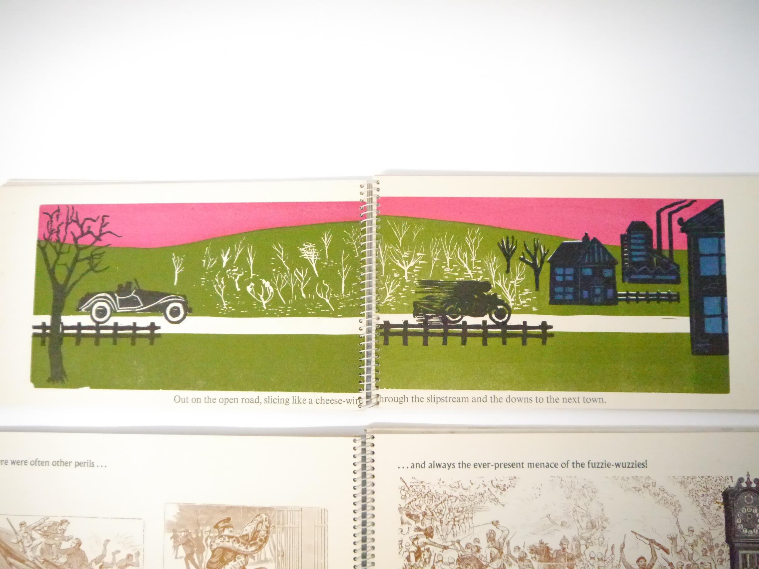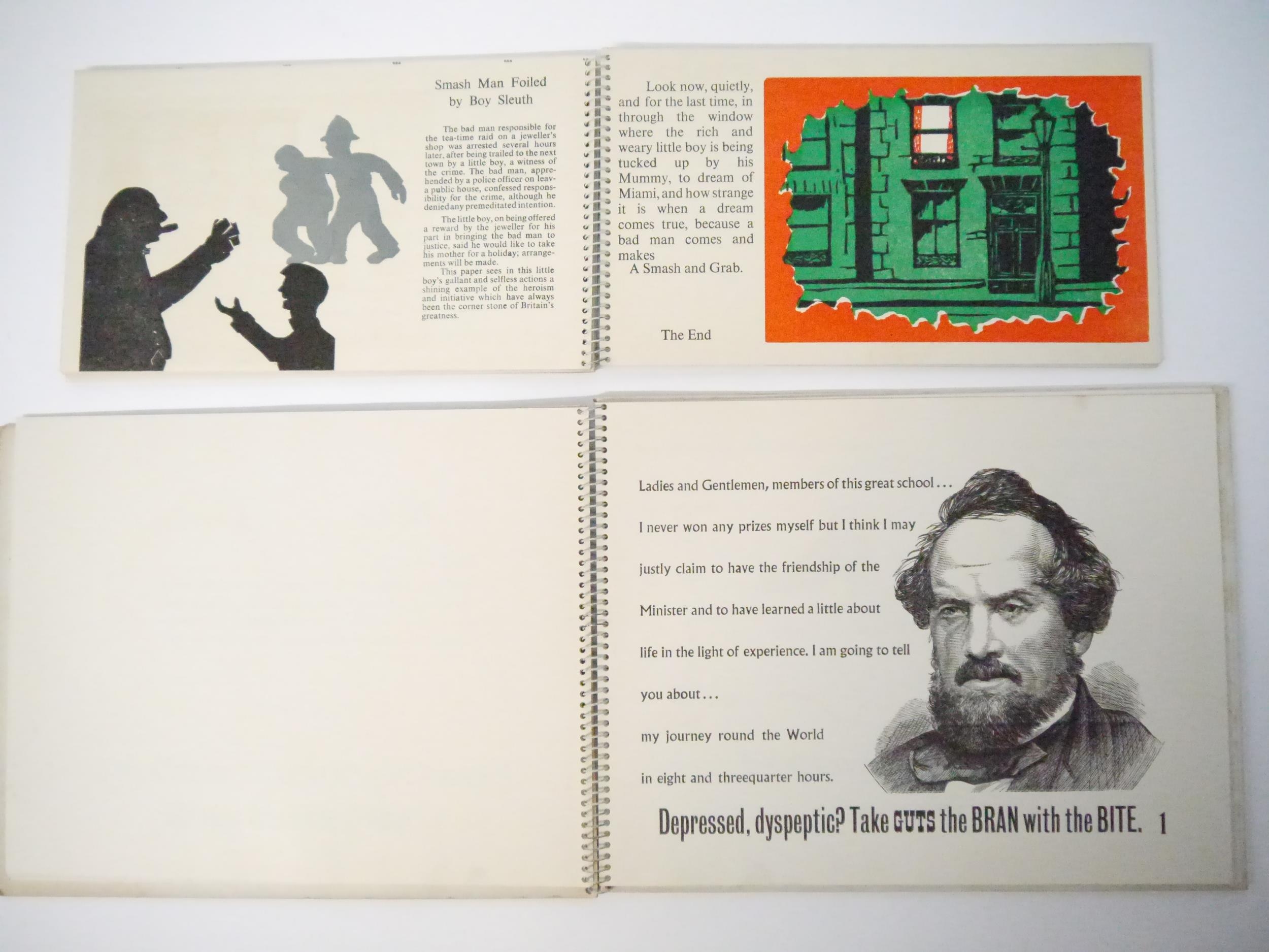 Art Society Press (the private press of the pupils of King's College School, London). Two scarce titles, comprising Roger Robinson, M. Cullingford and others: 'Smash & Grab', Wimbledon, Art Society press, [nd, circa 1960], [32]pp, 20 zinc engraved colour illustrated pages, oblong (15 x 26cm), original spiral bound printed boards; 'Around the World in Eight and Three-Quarter Hours', Wimbledon, Art Society Press, 1964, 2nd edition, limited edition of 250 copies only, 17 colour and b/w wood engraved illustrated pages, [34]pp (including boards) in total, oblong 4to (23 x 29cm), original spiral bound printed boards. Highly imaginative and witty printing. Scarce (2)