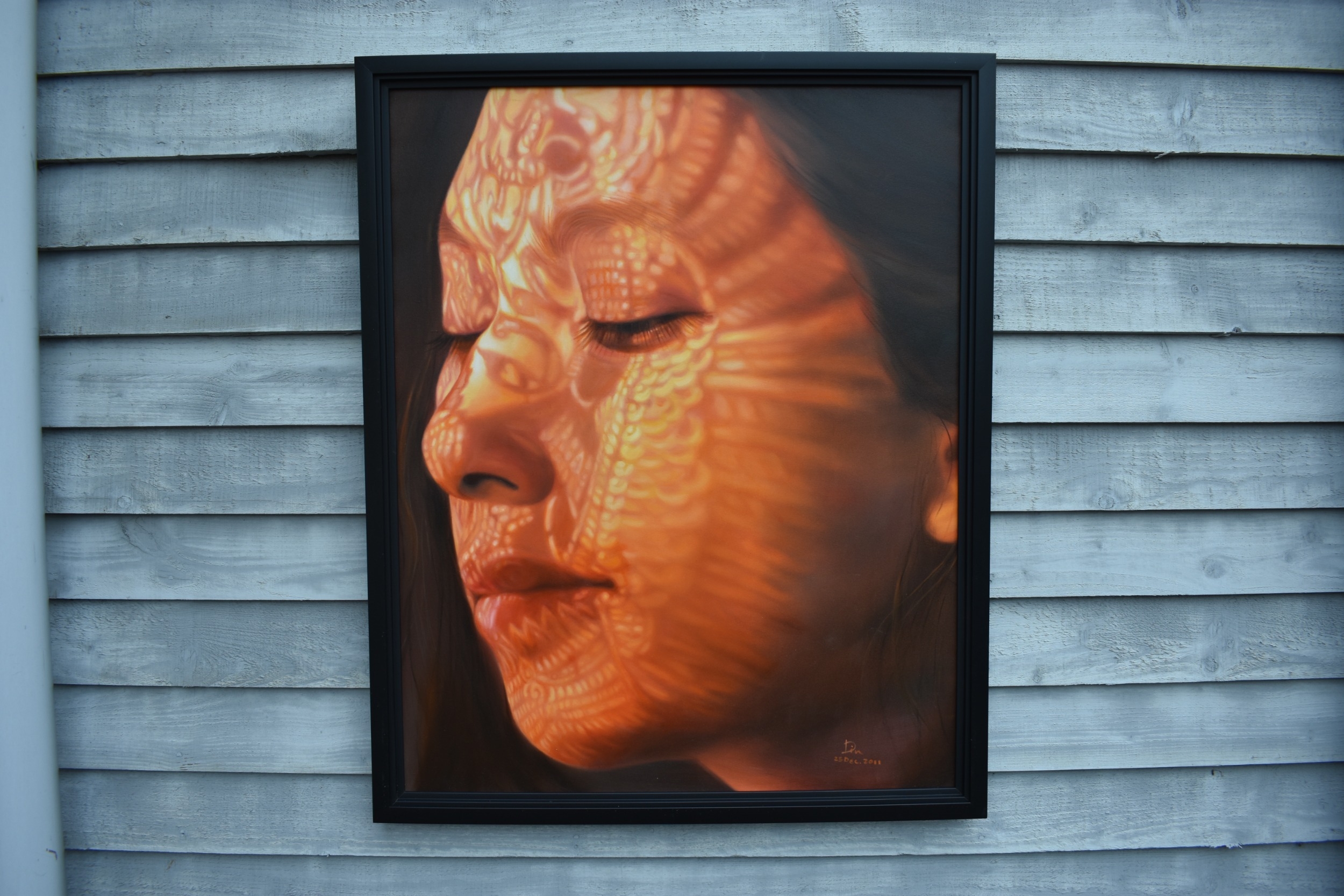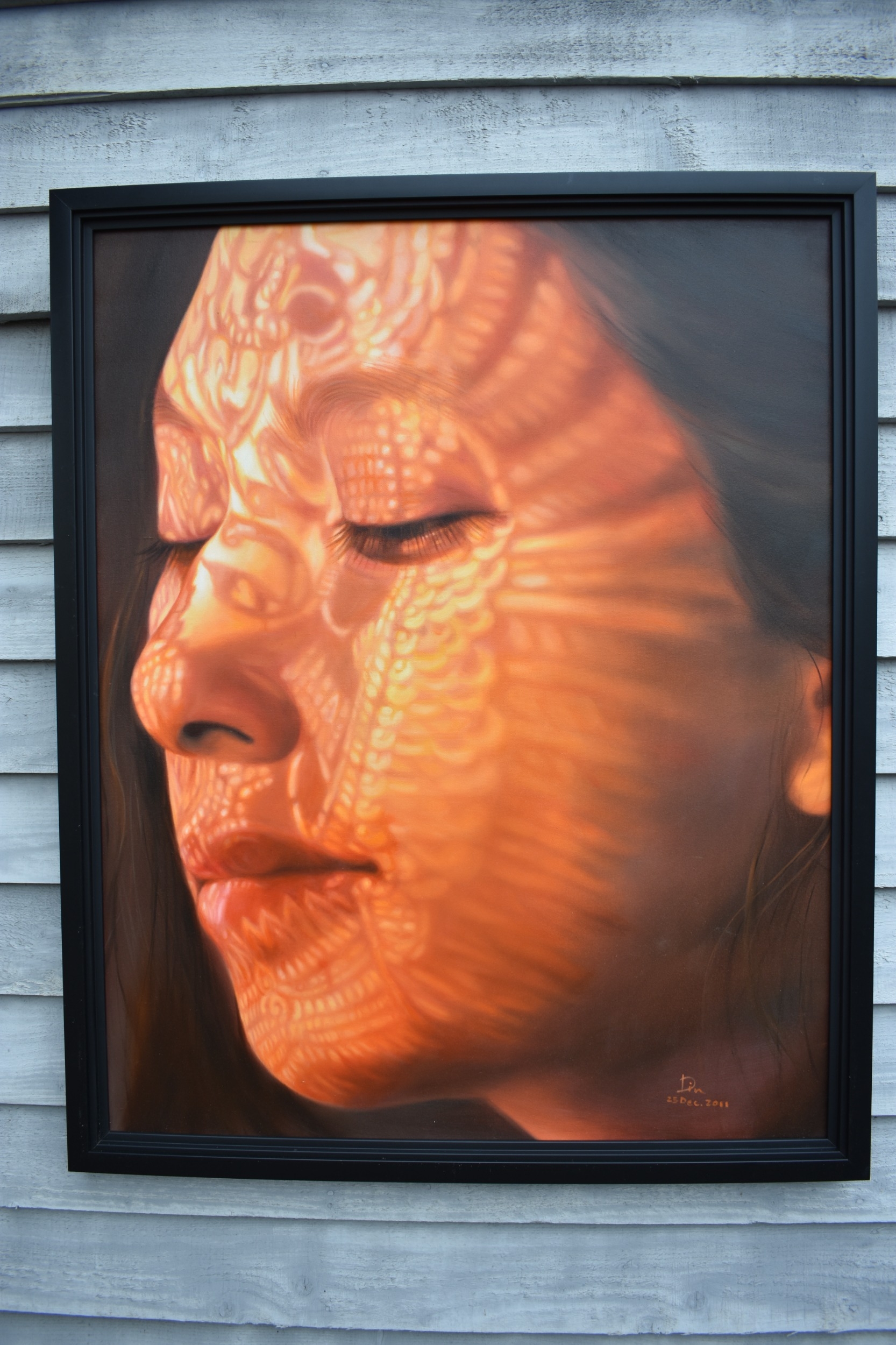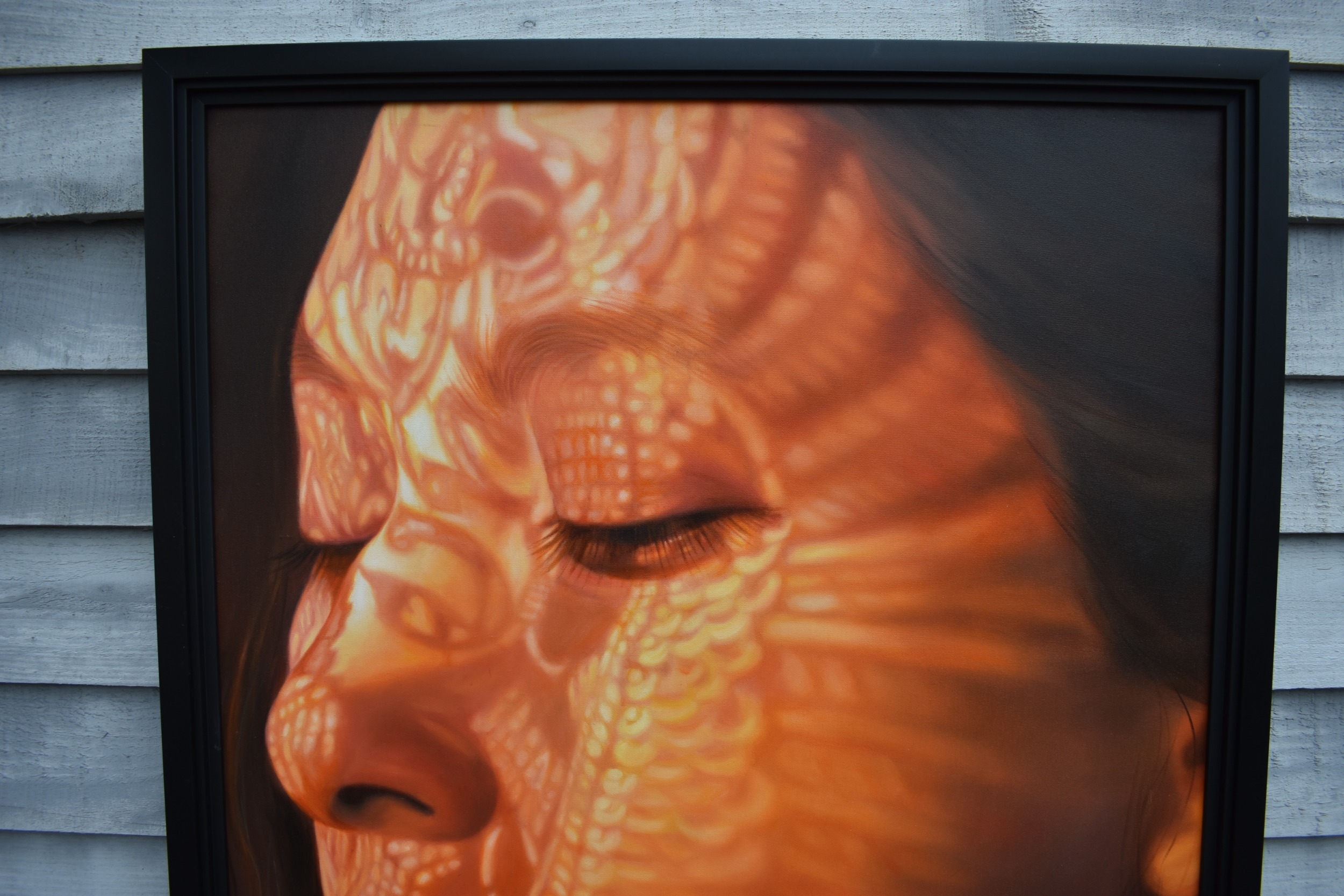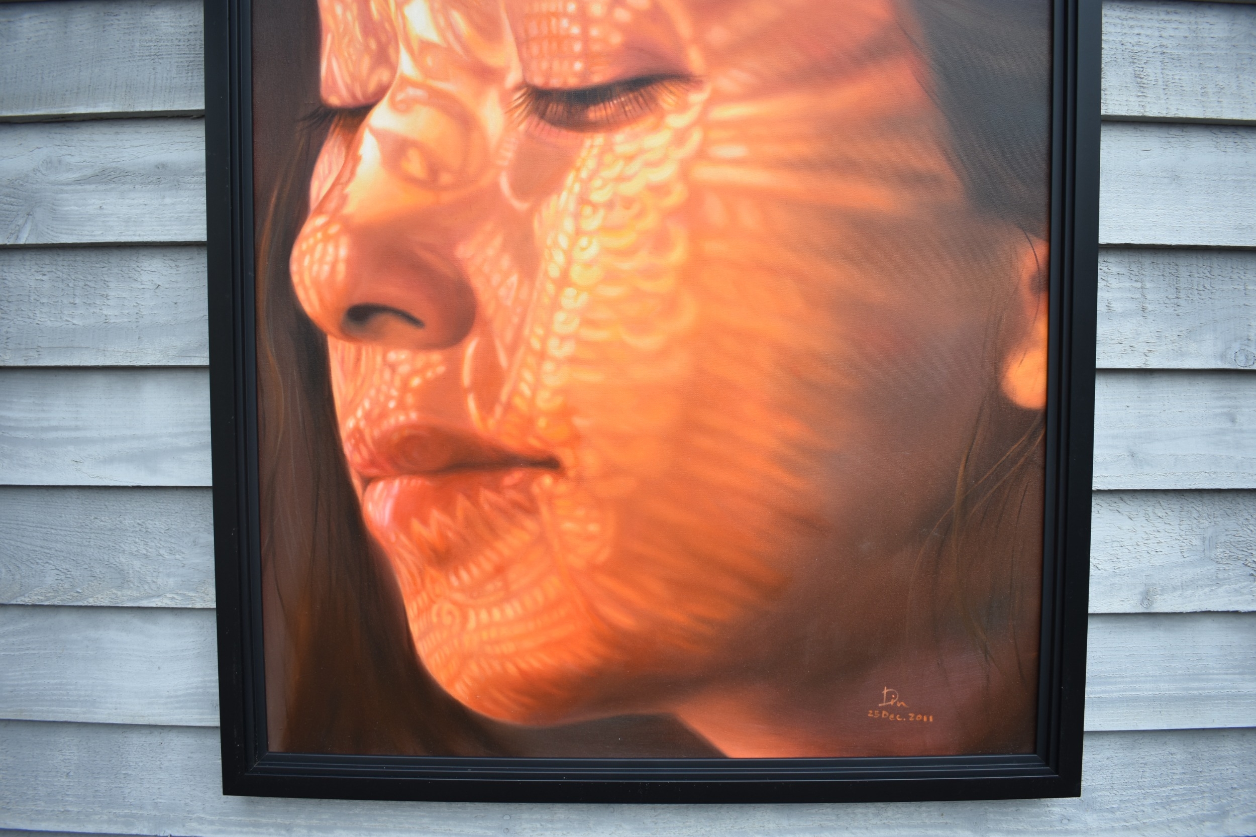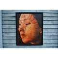 KARUNA PANUMES (b. 1967) Thai Contemporary Artist: Self-portrait executed in oils on canvas, in meticulous detail that make them stunningly life-like, they articulate her emotions with a spiritual intensity that's compelling and honest. Mysterious shadows and light patterns fall on her impassive features. These are rich in the symbolism of Thai culture. Dated 2011. 99cm x 79cm
