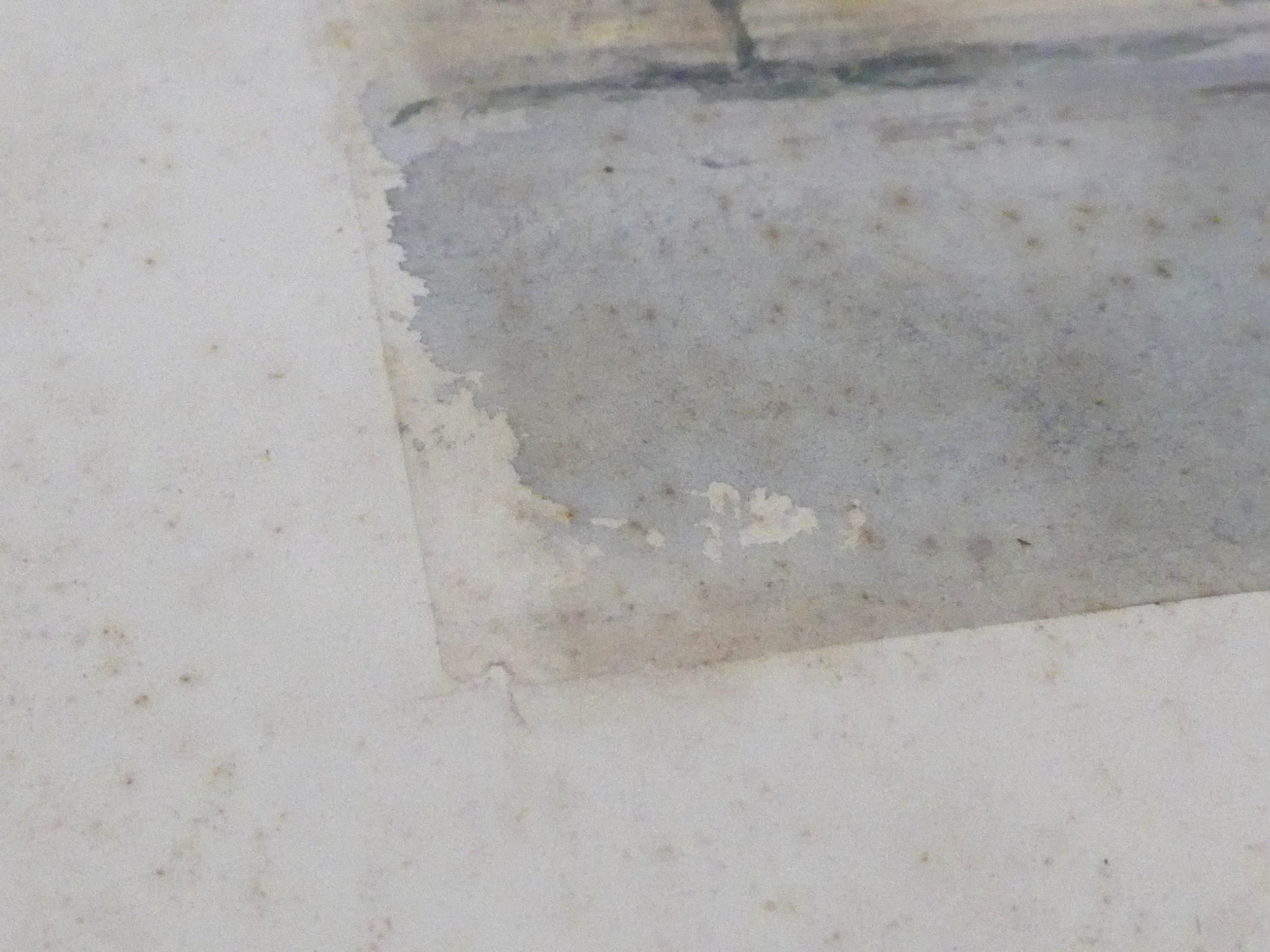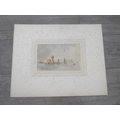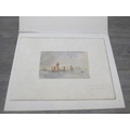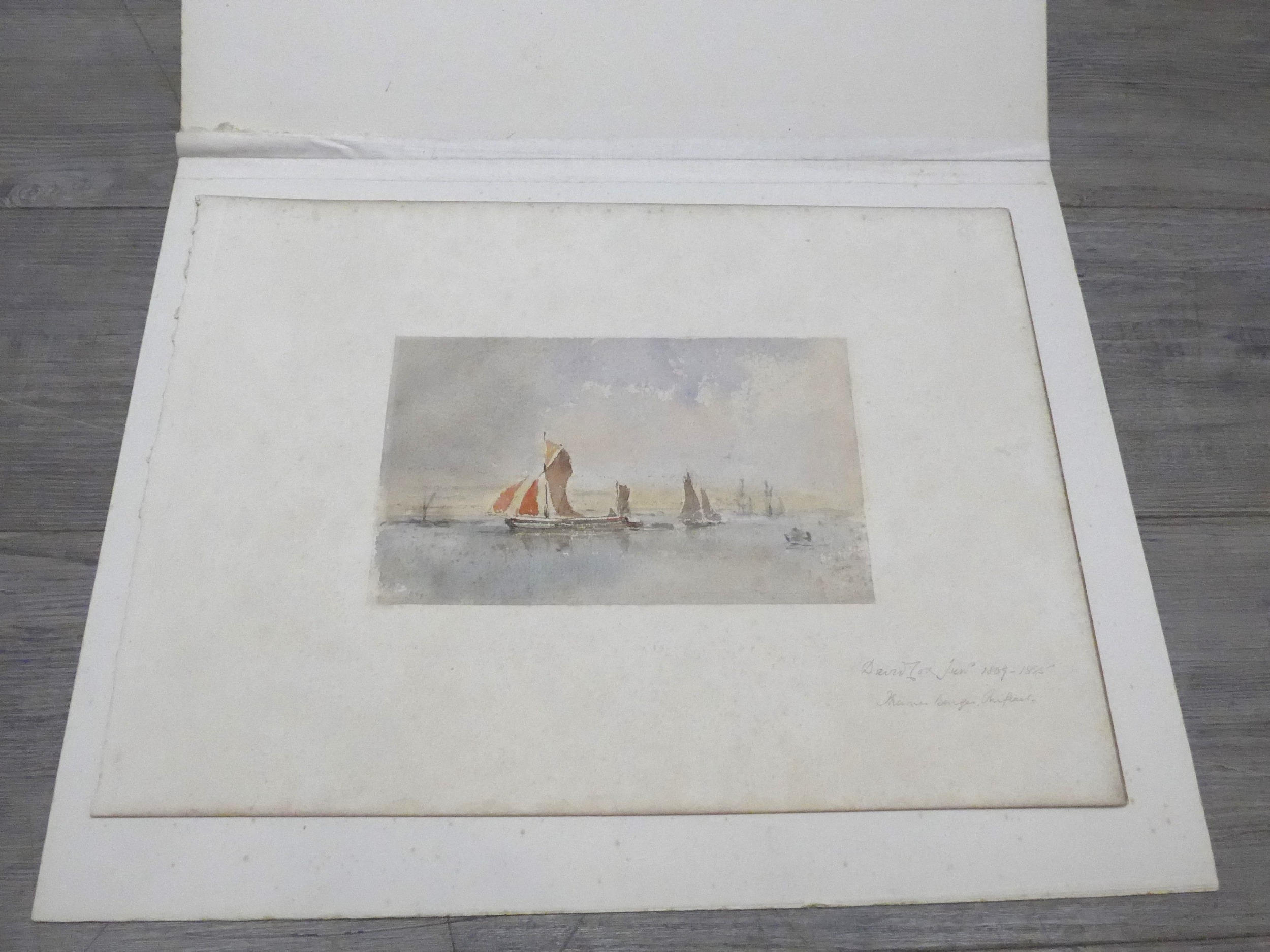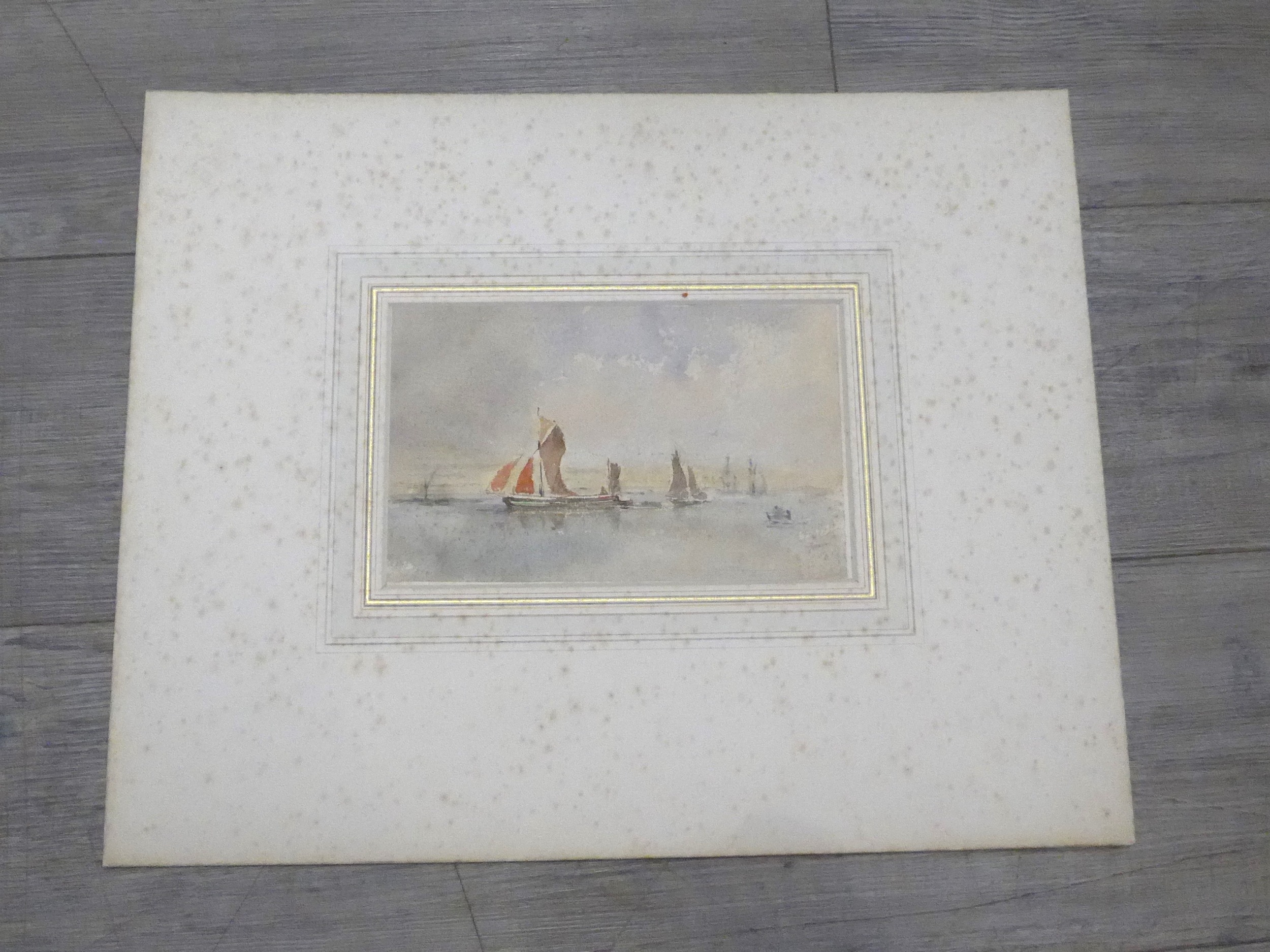 A 19th Century watercolour of Thames Barges. Unsigned, with an attribution to David Cox Junior (1809-1885) written by Henry Potter Stevens (1875-1965). Paper stuck to backing board, held to mount. Image size 14.7cm x 23.7cm, overall size 40.5cm x 50.5cm. Provenance - From the collection of Henry Potter Stevens (1875-1965)