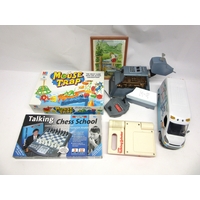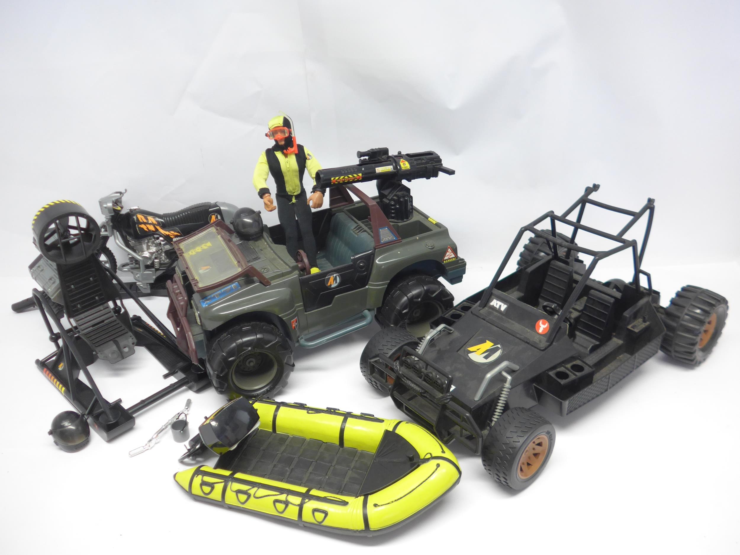 A 1990s Action Man figure with five vehicles including 4x4 Jeep Rhino XT-71, Missile bike, Dingy, Action Man LSV amd Dune buggy.