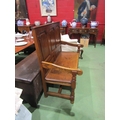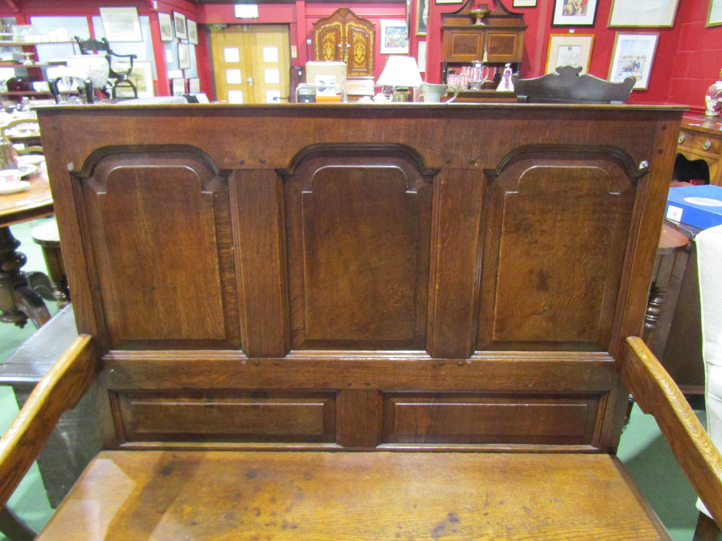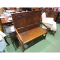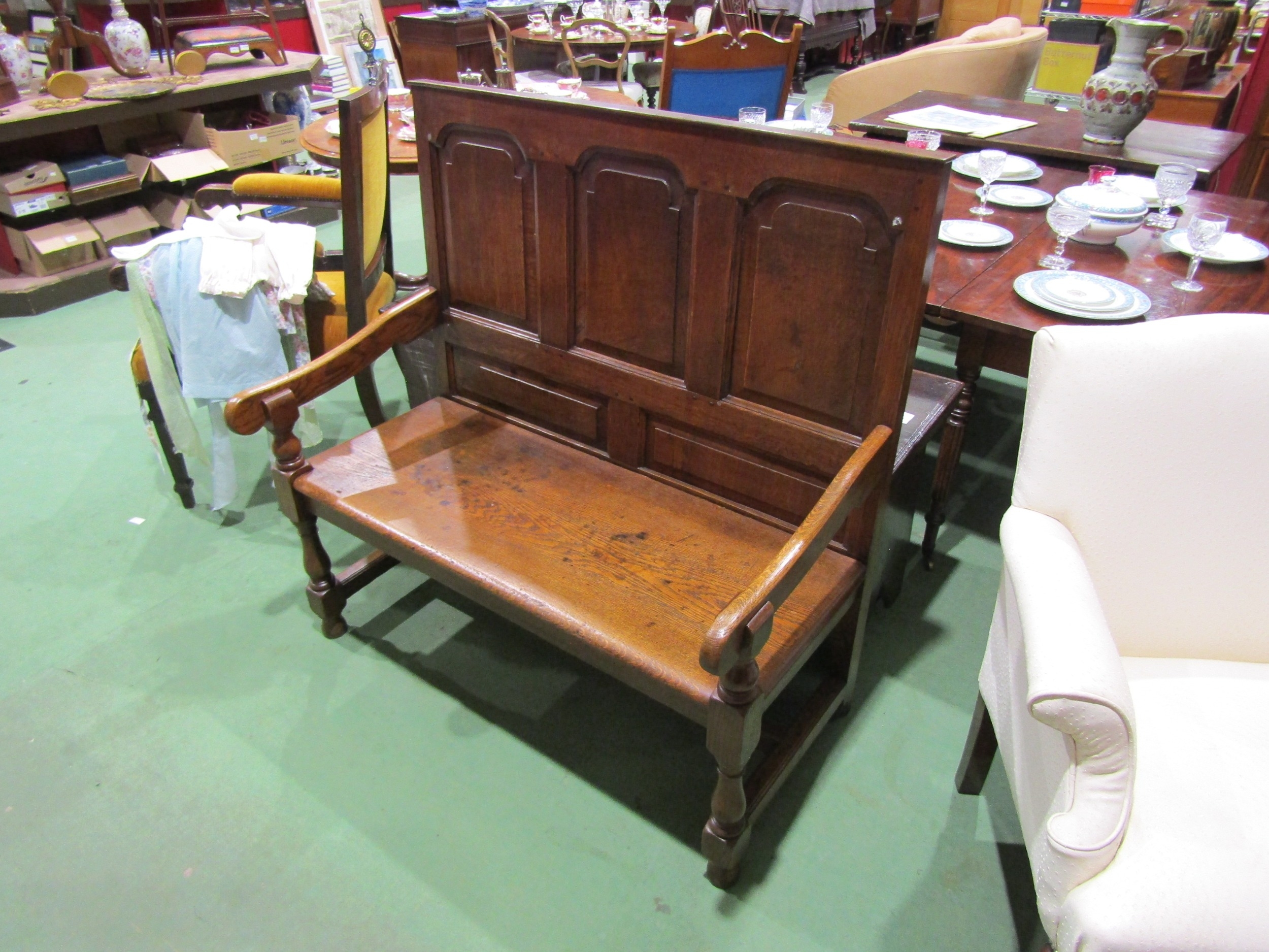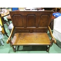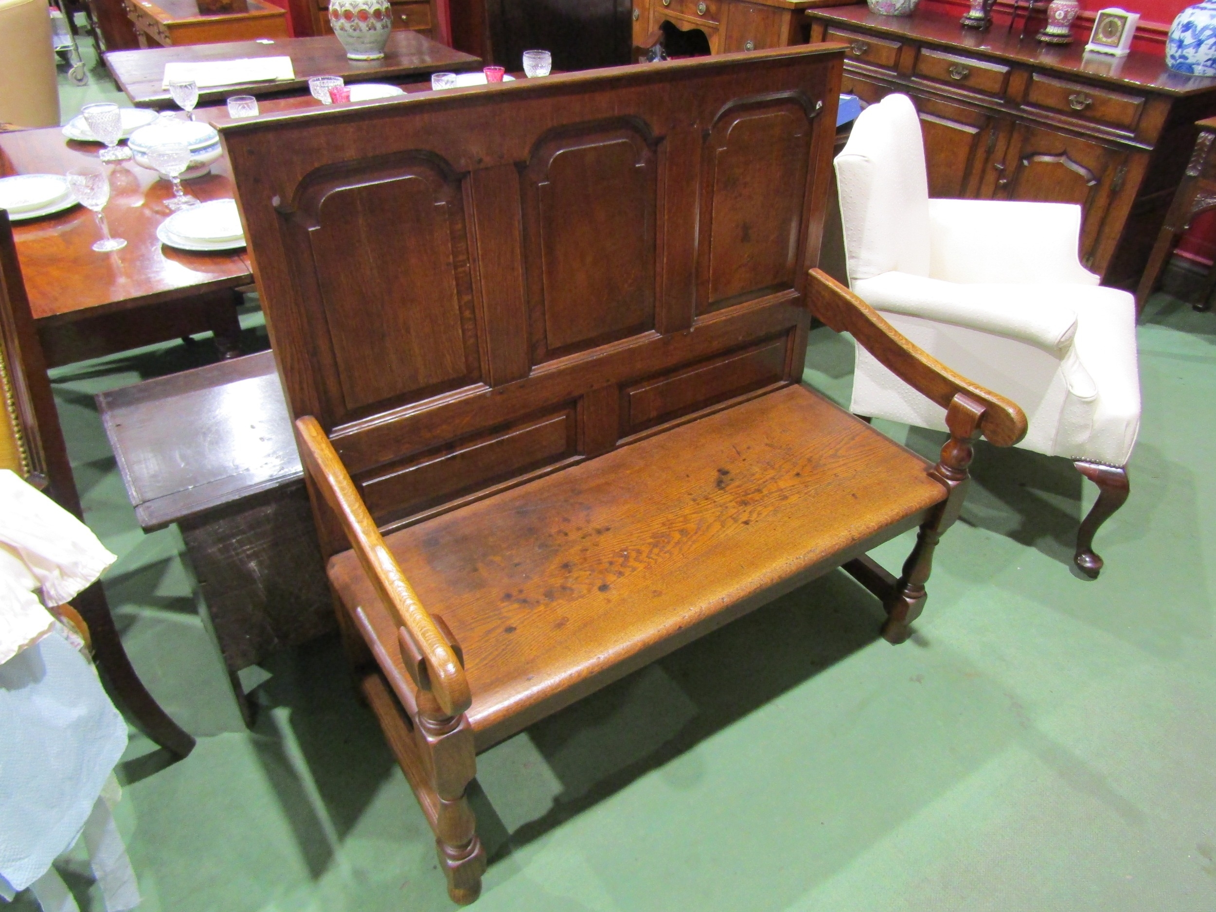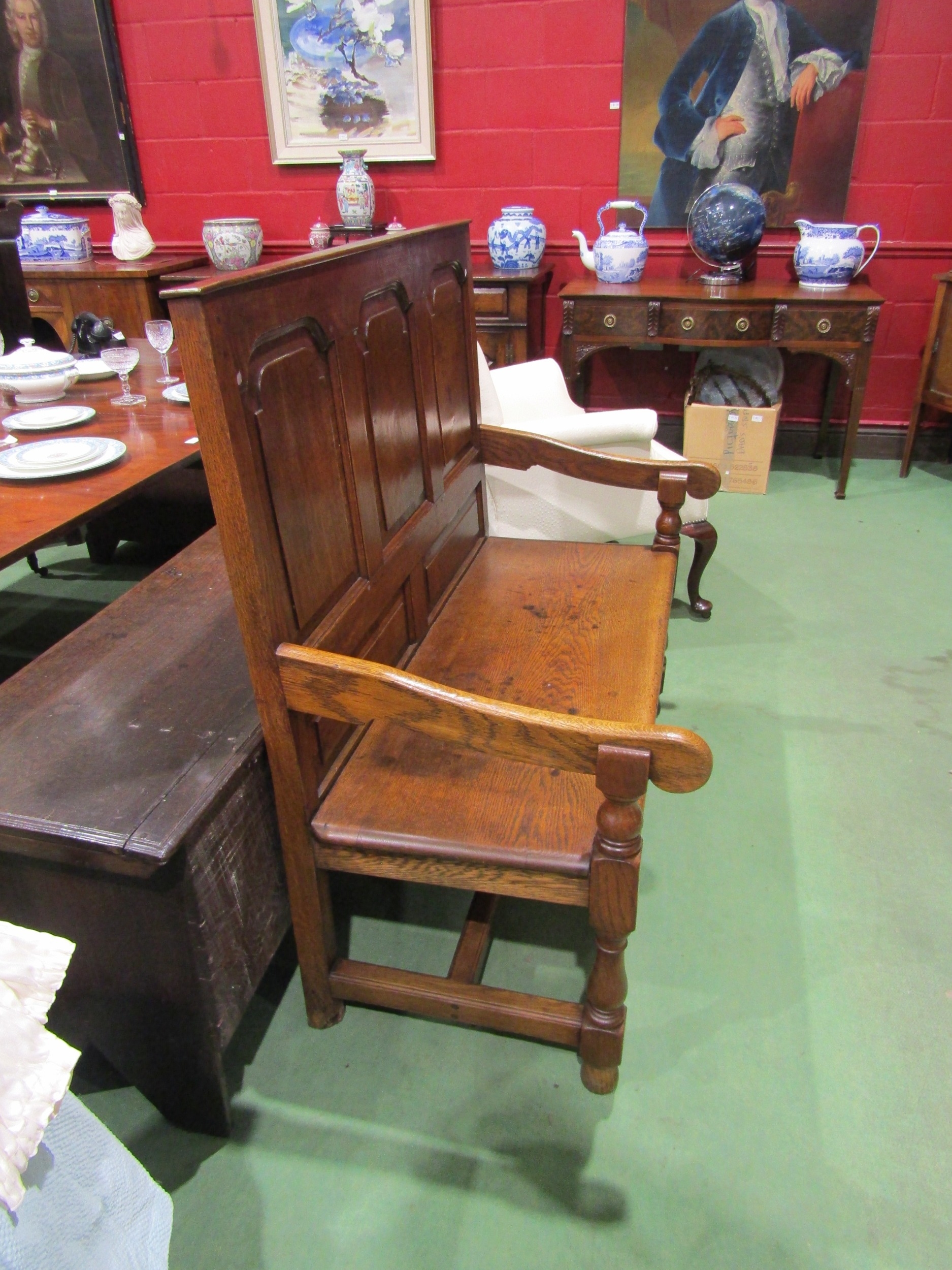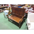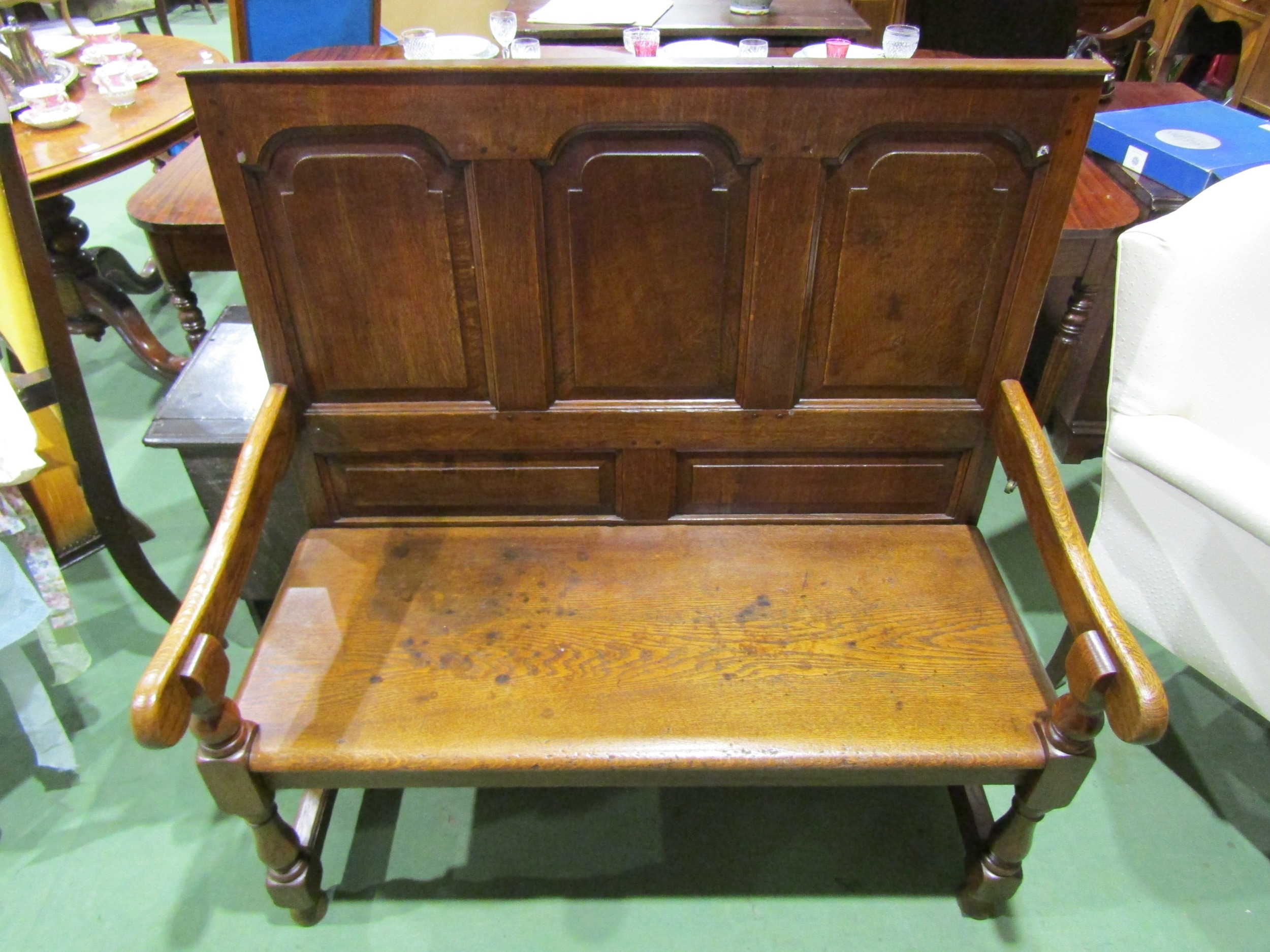 A 17th Century revival oak three panel back hall settle the scroll arms on turned supports united by an 'H' stretcher, 115cm tall x 112cm wide x 58cm deep