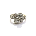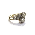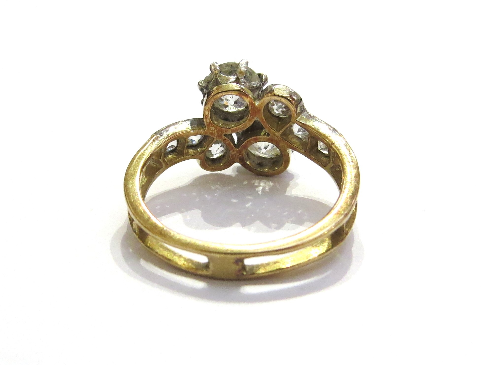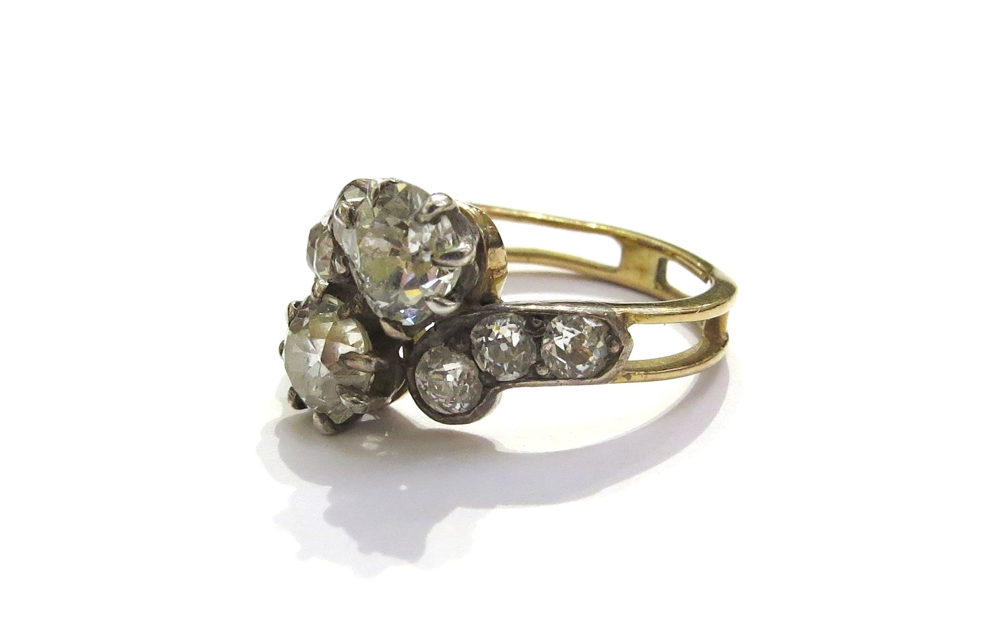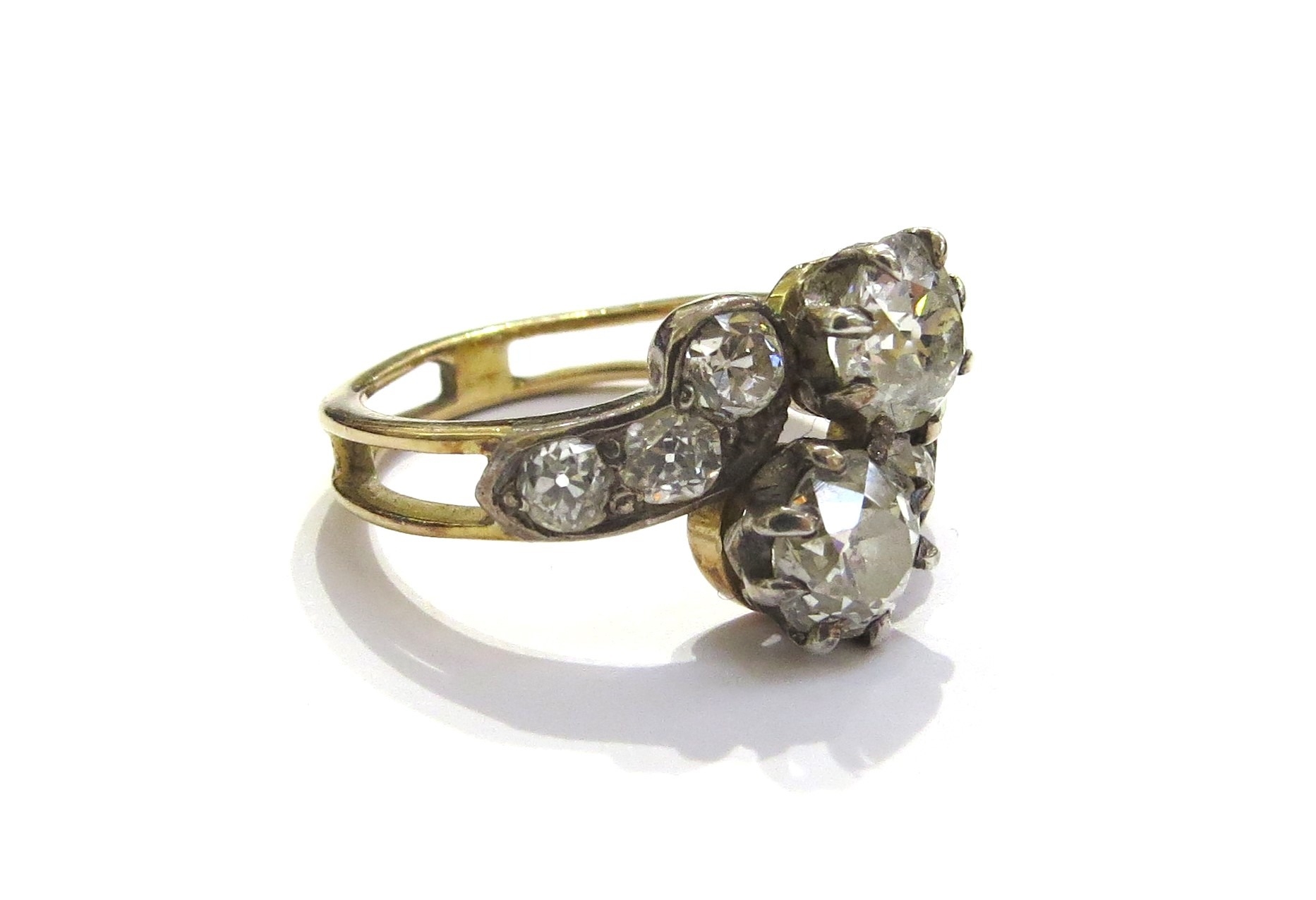 A diamond crossover ring the centre claw set diamonds 0.75ct approx each flanked by six smaller bright cut diamonds 0.10ct each approx. Shank unmarked. Size O/P, 4g